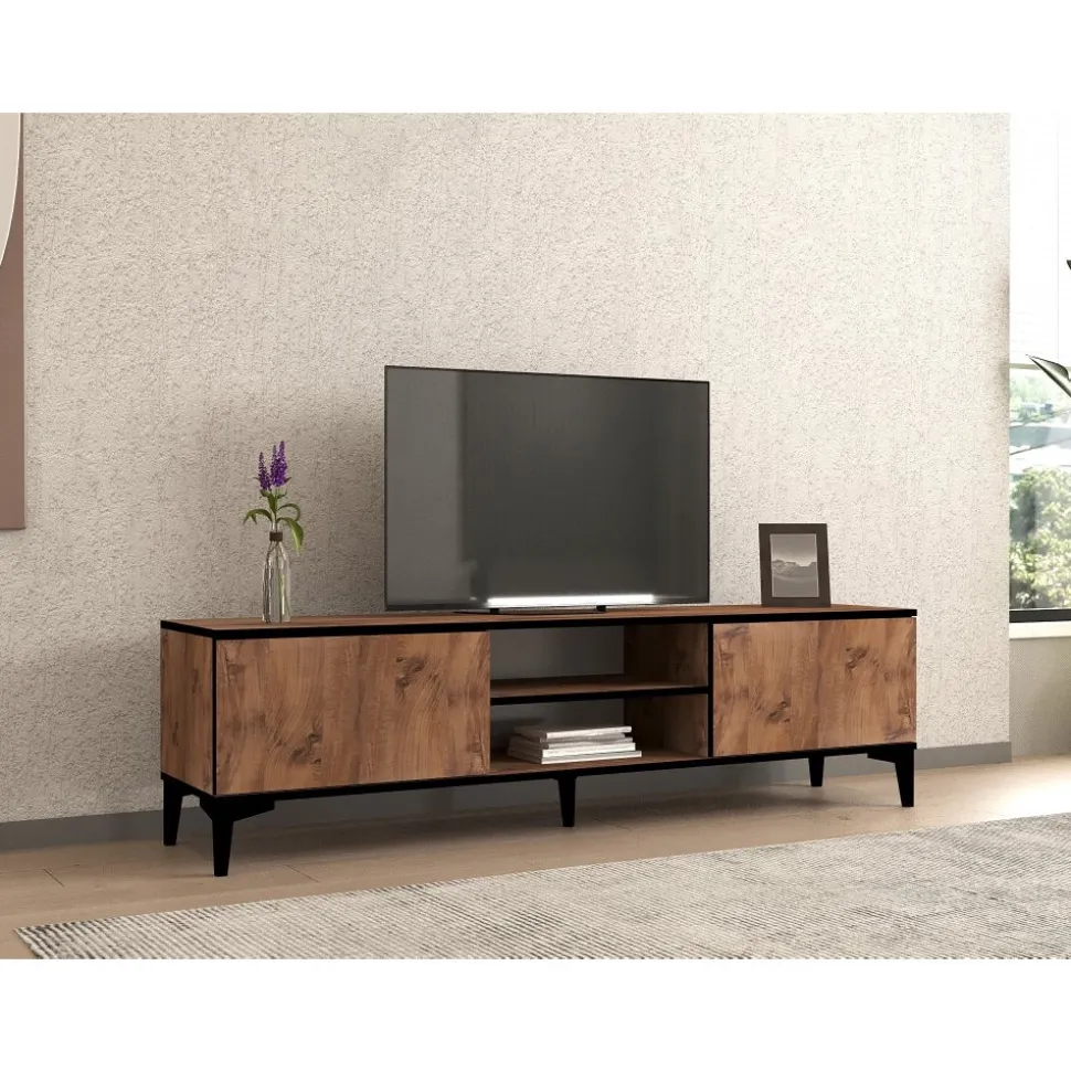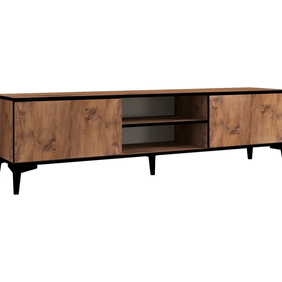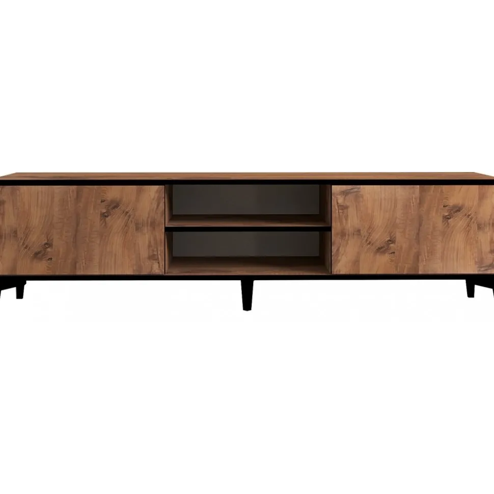 Mediabänk av melaminbelagd spånskiva med ben av plast.