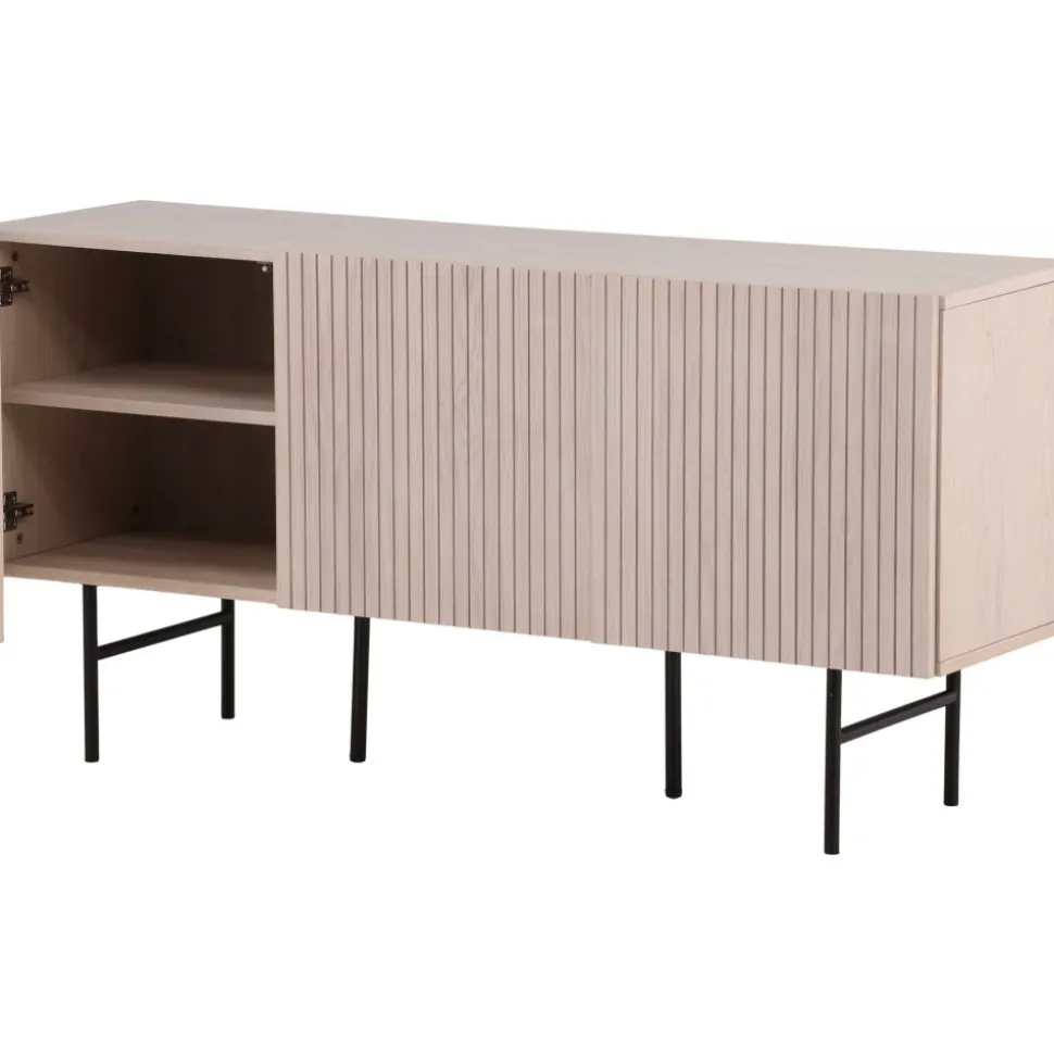 Skänk i skandinavisk design med stilsäker utformning. Den här skänken har tre luckor i ribbad design med två hyllplan som möjliggör dold förvaring. Den är tillverkat i vitputsad faner och lyfts upp av smala ben i svart stål. Använd som skänk med vackra dekorationer och ljusstakar på eller som tv-bänk i vardagsrummet. Här får du en möbel som är lika snygg som smart.