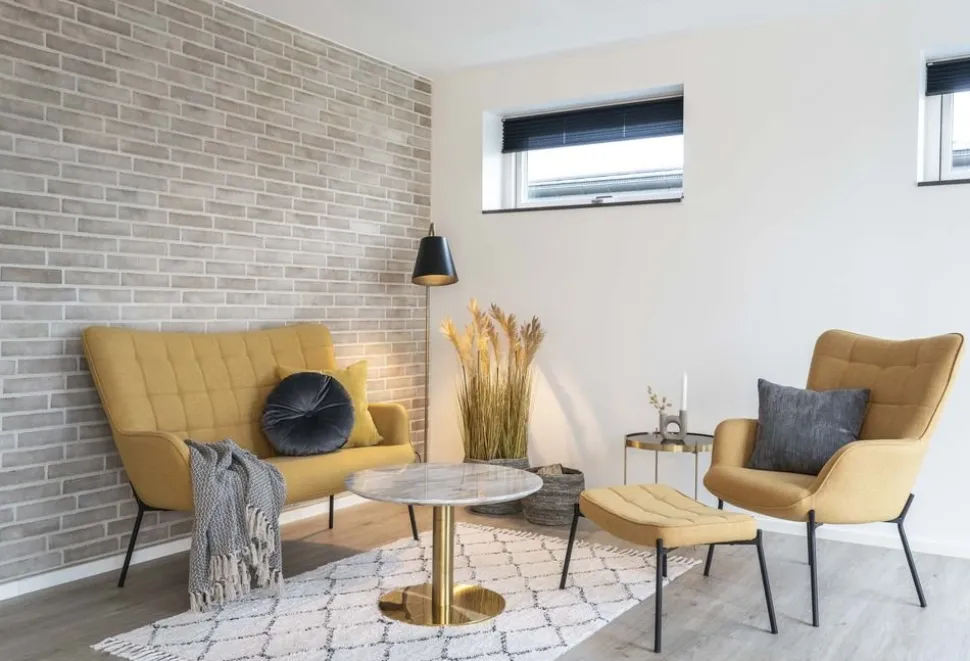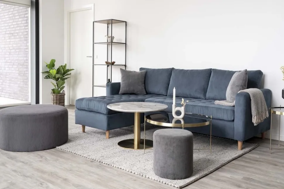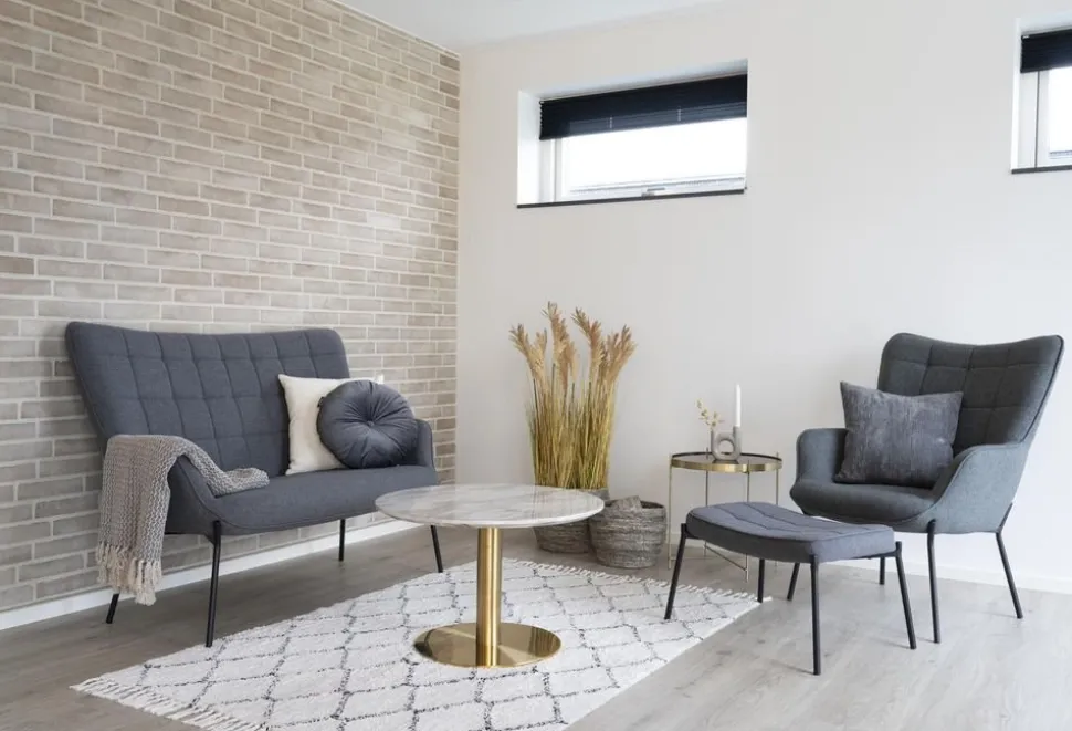 Soffbord med bordsskiva i marmor imitation och ben i mässingsutförande.