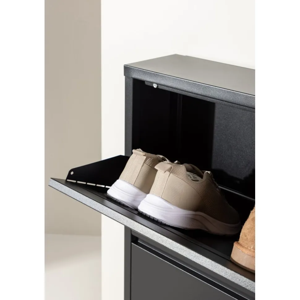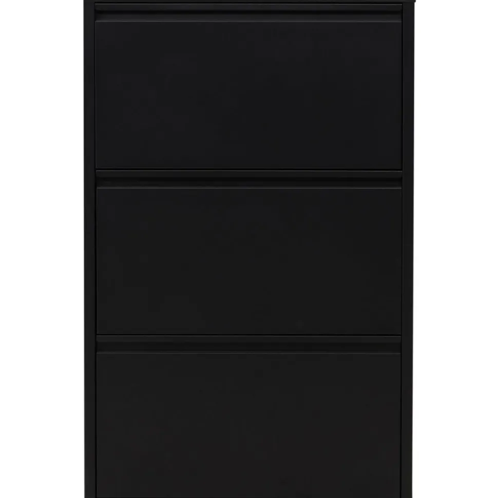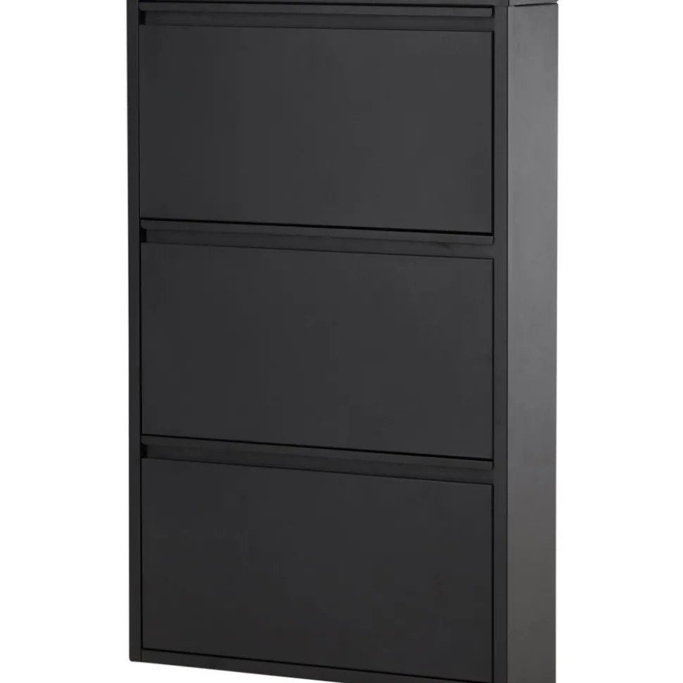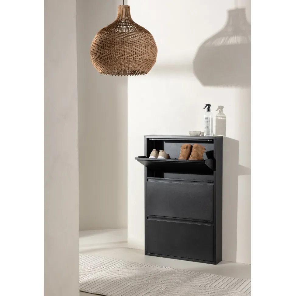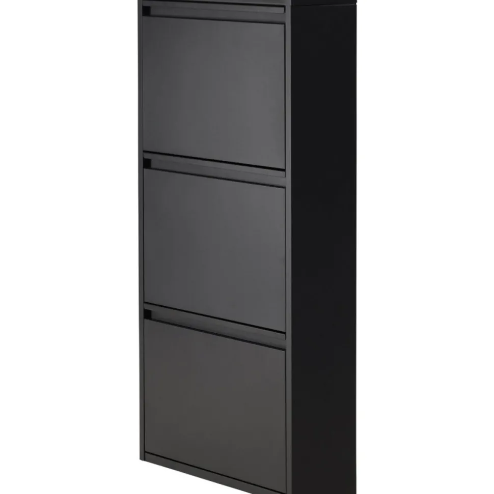 Vi presenterar stolt Bonito – dina skors nya bästa vän! Den här byrån är ämnad för att förvara dina skor i stället för att låta de stå rörigt och stökigt i hallen. Med sina tre diskreta luckor blir denna byrå ditt hemliga vapen mot skostress. Inga fler snubblade över vartenda par. Föreställ dig lugnet när du kan komma hem till ett städat blickfång i hallen! Med Bonito så möts verkligen dessutom stil och funktion: Varför gömma dina skor i mörka vrår? Vår förvaringsbyrå för skor är mer än en praktisk lösning – den är en snygg inredningsdetalj. Tillverkad i robust svart metall, blir den en modern touch i din hall. Med en smal bredd tar den dessutom minimalt med plats och kan även agera avlastningsbord på toppskivan där du önskar förvara nycklar eller varför inte placera ett ljus att kunna tända när du välkomnar hem gäster. Beställ idag och upplev skillnaden själv! Levereras omonterad.