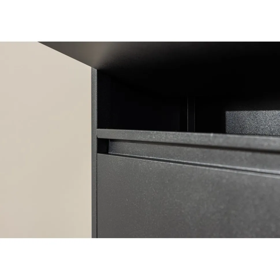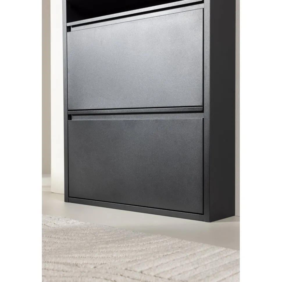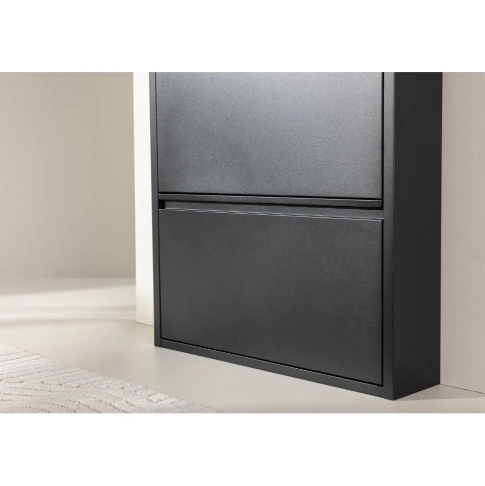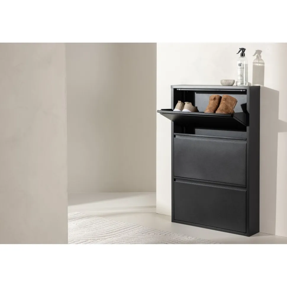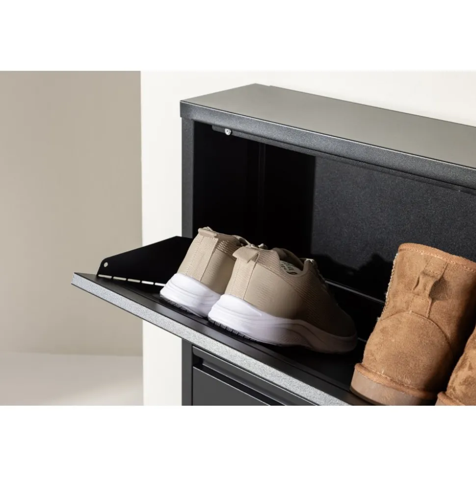 Vi presenterar stolt Bonito – dina skors nya bästa vän! Den här byrån är ämnad för att förvara dina skor i stället för att låta de stå rörigt och stökigt i hallen. Med sina tre diskreta luckor blir denna byrå ditt hemliga vapen mot skostress. Inga fler snubblade över vartenda par. Föreställ dig lugnet när du kan komma hem till ett städat blickfång i hallen! Med Bonito så möts verkligen dessutom stil och funktion: Varför gömma dina skor i mörka vrår? Vår förvaringsbyrå för skor är mer än en praktisk lösning – den är en snygg inredningsdetalj. Tillverkad i robust svart metall, blir den en modern touch i din hall. Med en smal bredd tar den dessutom minimalt med plats och kan även agera avlastningsbord på toppskivan där du önskar förvara nycklar eller varför inte placera ett ljus att kunna tända när du välkomnar hem gäster. Beställ idag och upplev skillnaden själv! Levereras omonterad.