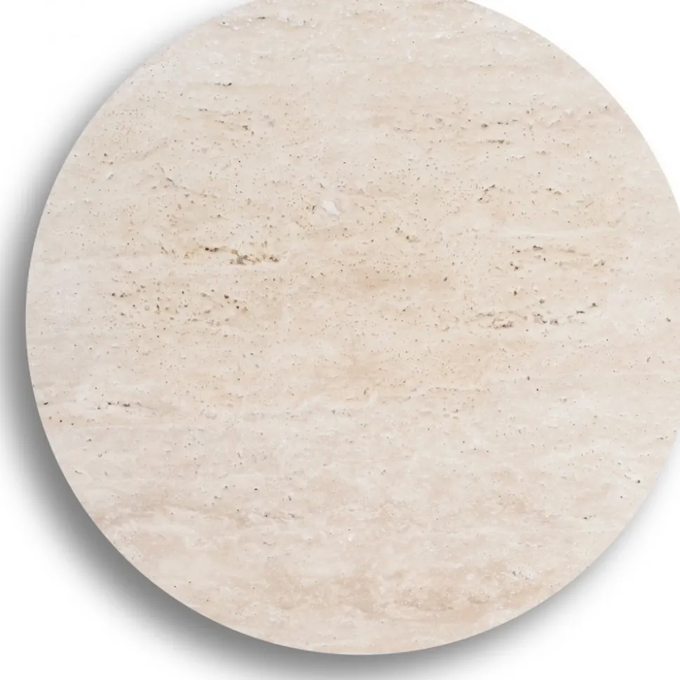 Bordsskivan är tillverkad av beige travertin med en diameter på 85 cm. Denna naturliga kalksten kan innehålla håligheter och märken från växtdelar som har ingjutits i stenen och sedan multnat bort, vilket ger varje skiva en unik karaktär och ett estetiskt uttryck.