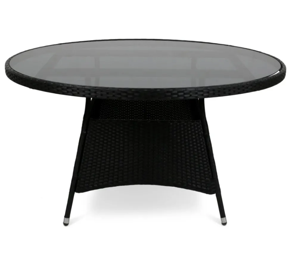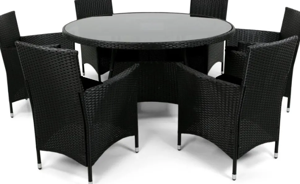 Brantevik utegrupp, stort runt matbord med 6 st karmstolar med dynor som ingår. Svart snygg konstrotting med svarta matchande sittdynor.
