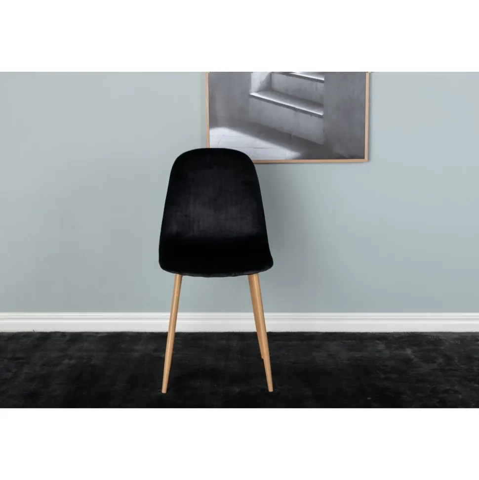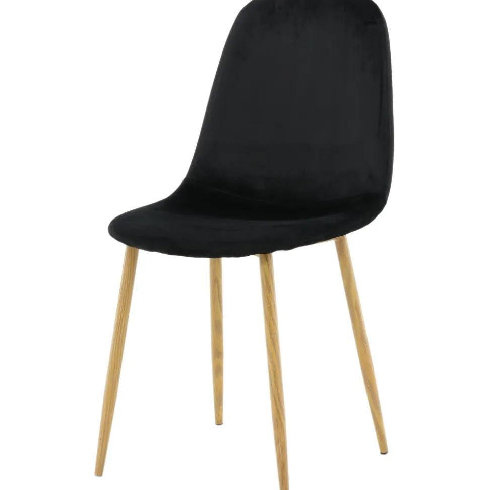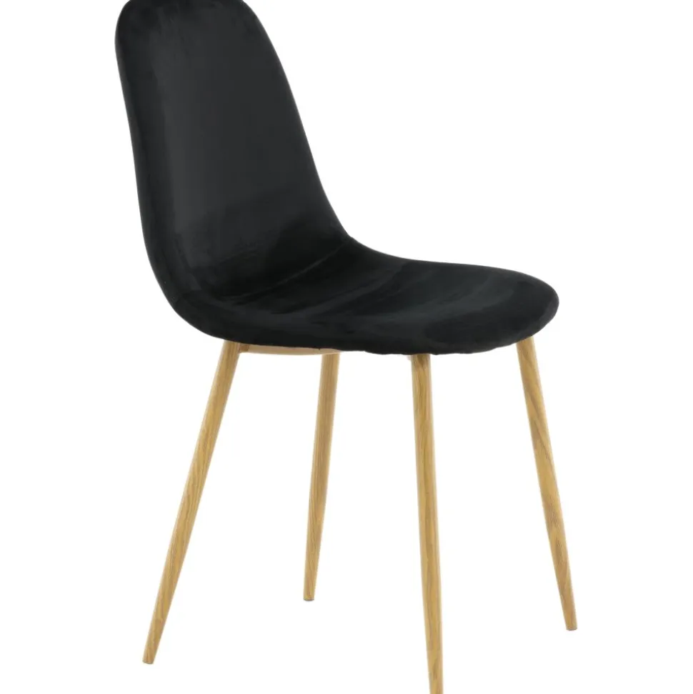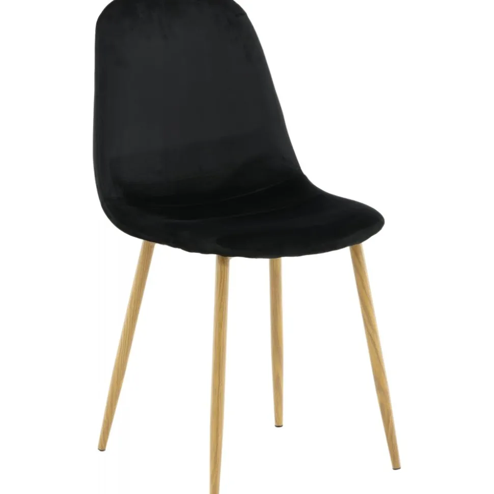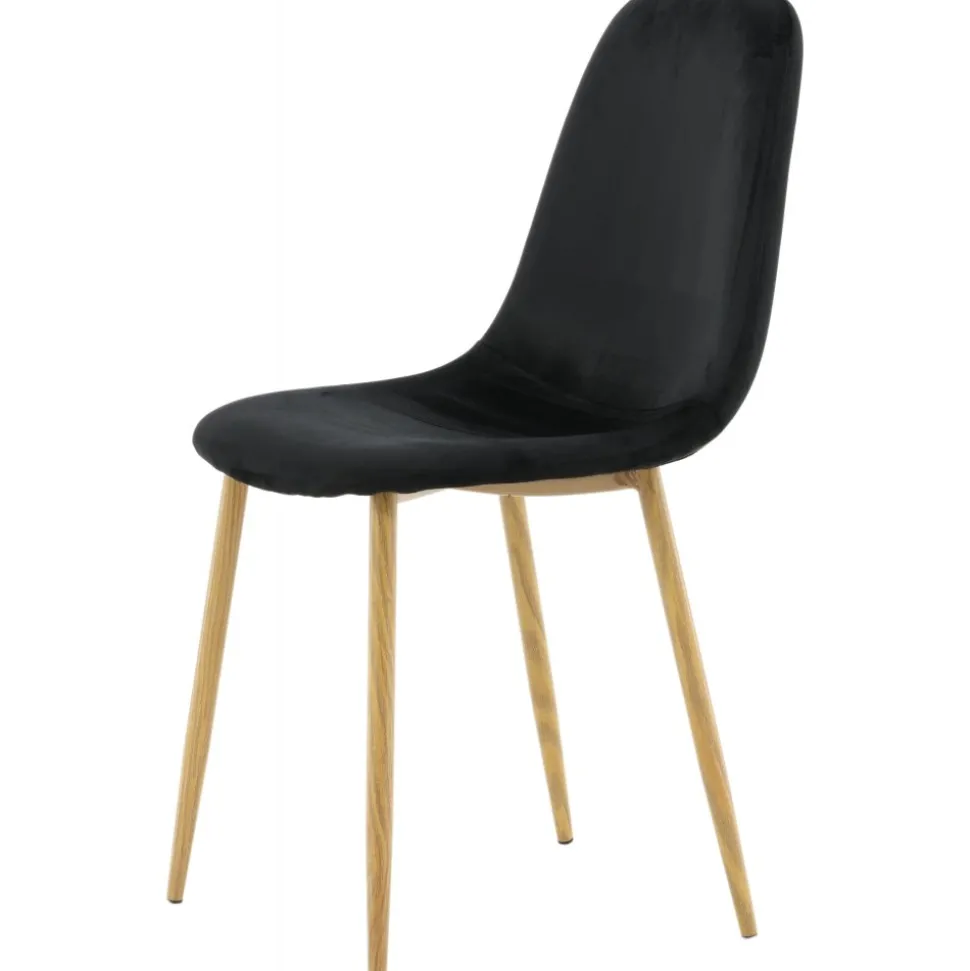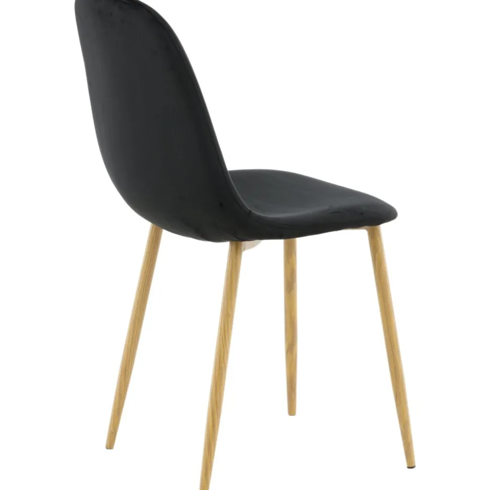Stilren i svart kulör med modern utformning. Helklädd design, ben i valnötsfolierad metall som bryter av snyggt samt rundad rygg och sits i svart sammetstyg med mjuk stoppning. Lättare montering krävs.