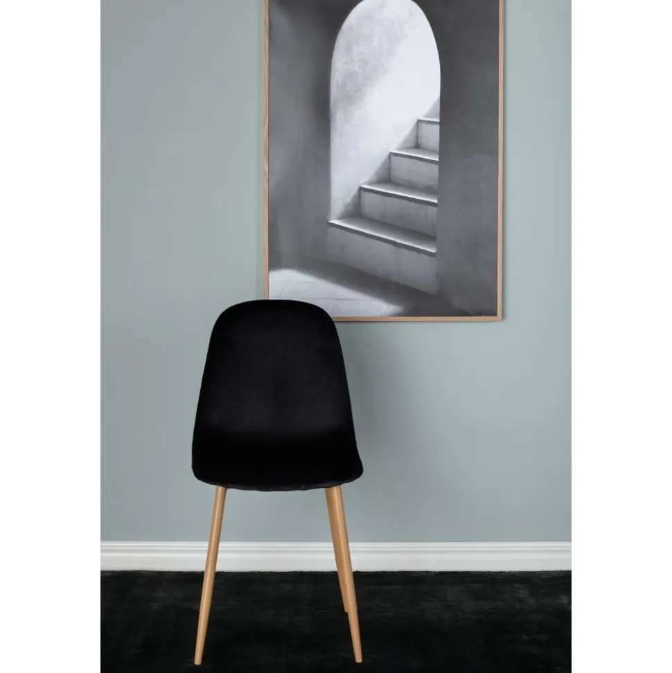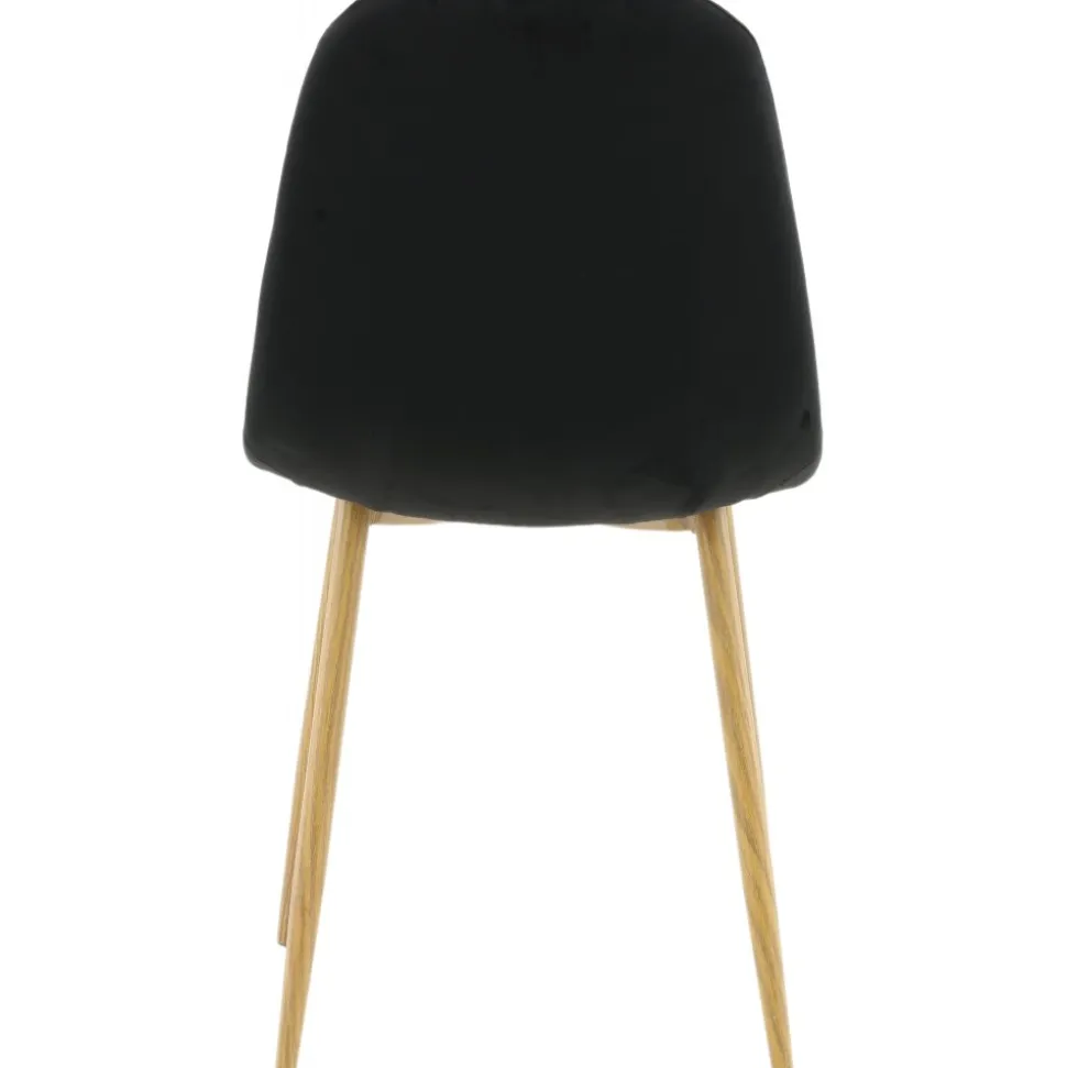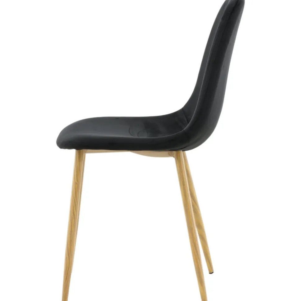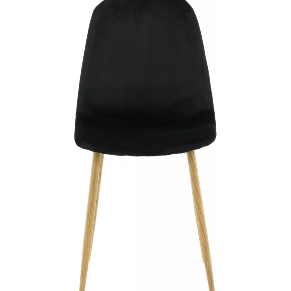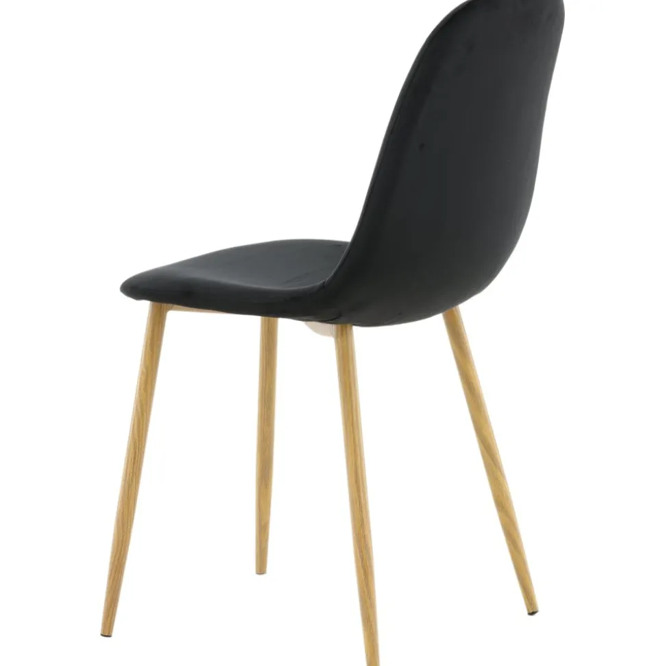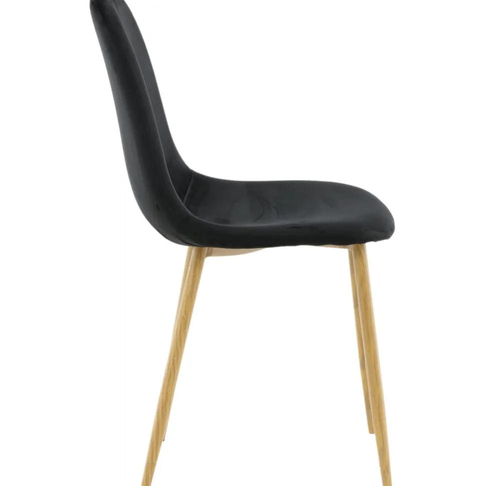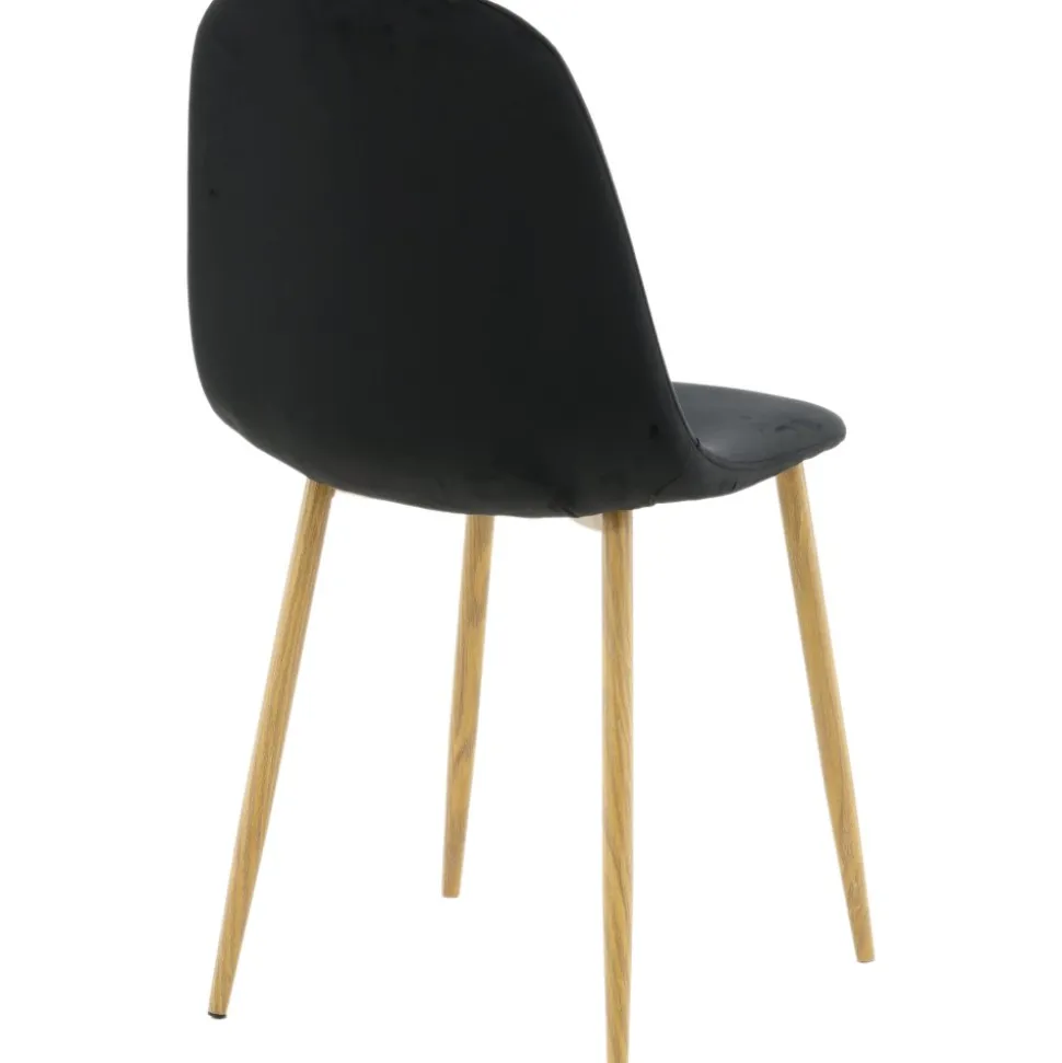 Stilren i svart kulör med modern utformning. Helklädd design, ben i valnötsfolierad metall som bryter av snyggt samt rundad rygg och sits i svart sammetstyg med mjuk stoppning. Lättare montering krävs.