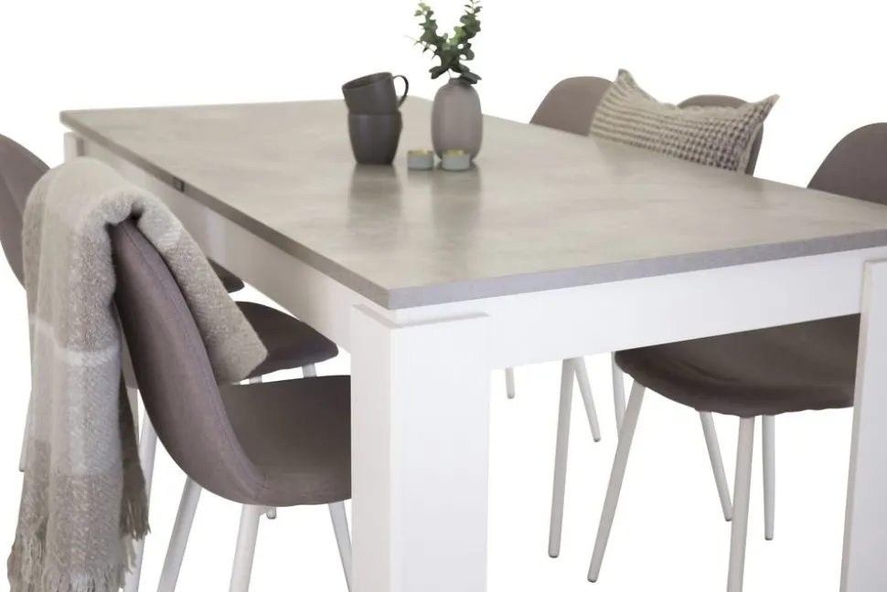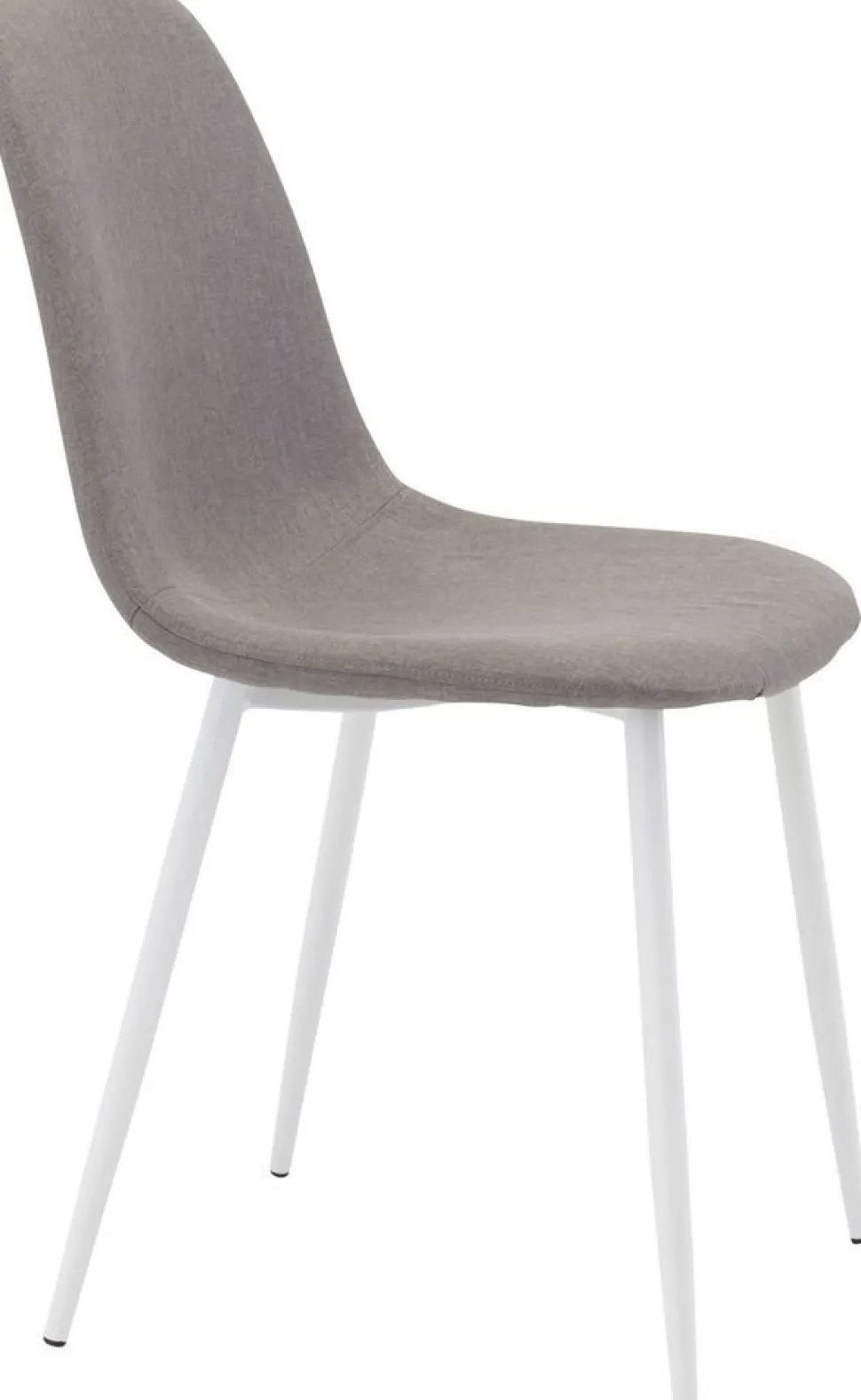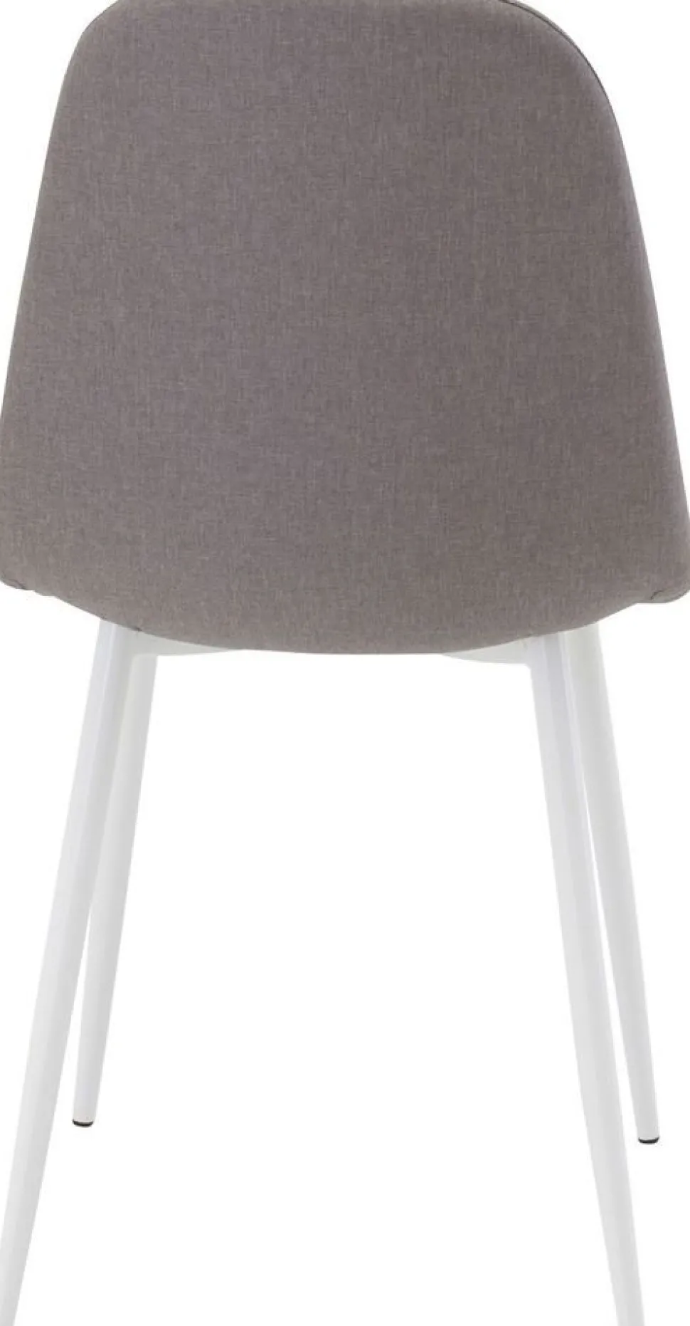 Matstol klädd i grått tyg, 100% polyester. Sits- och rygg är skumstoppade för god komfort. Underrede i vit metall.