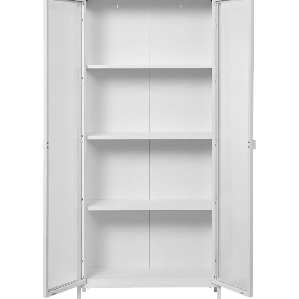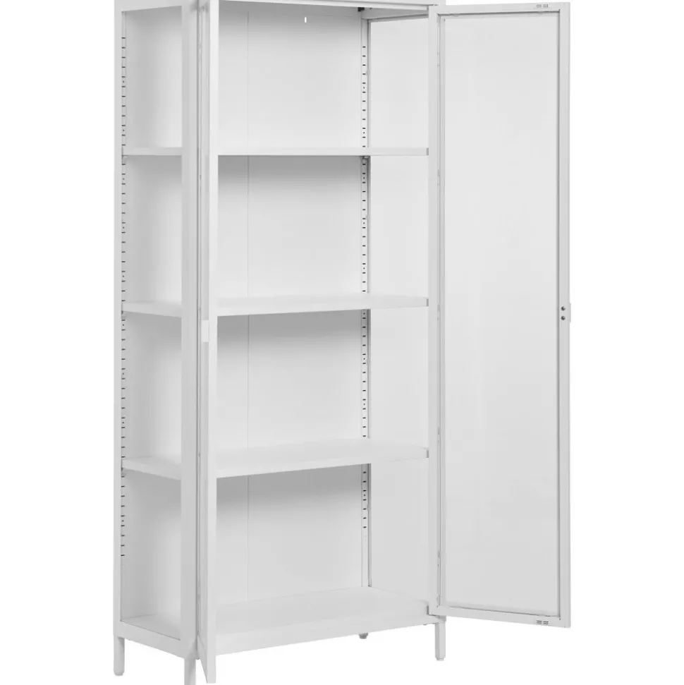 Vitrinskåp av stål med dörrar av glas.