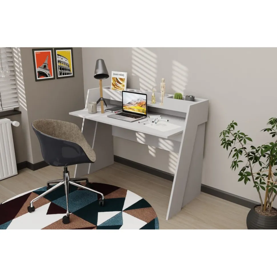 Skrivbord av melaminbelagd spånskiva.