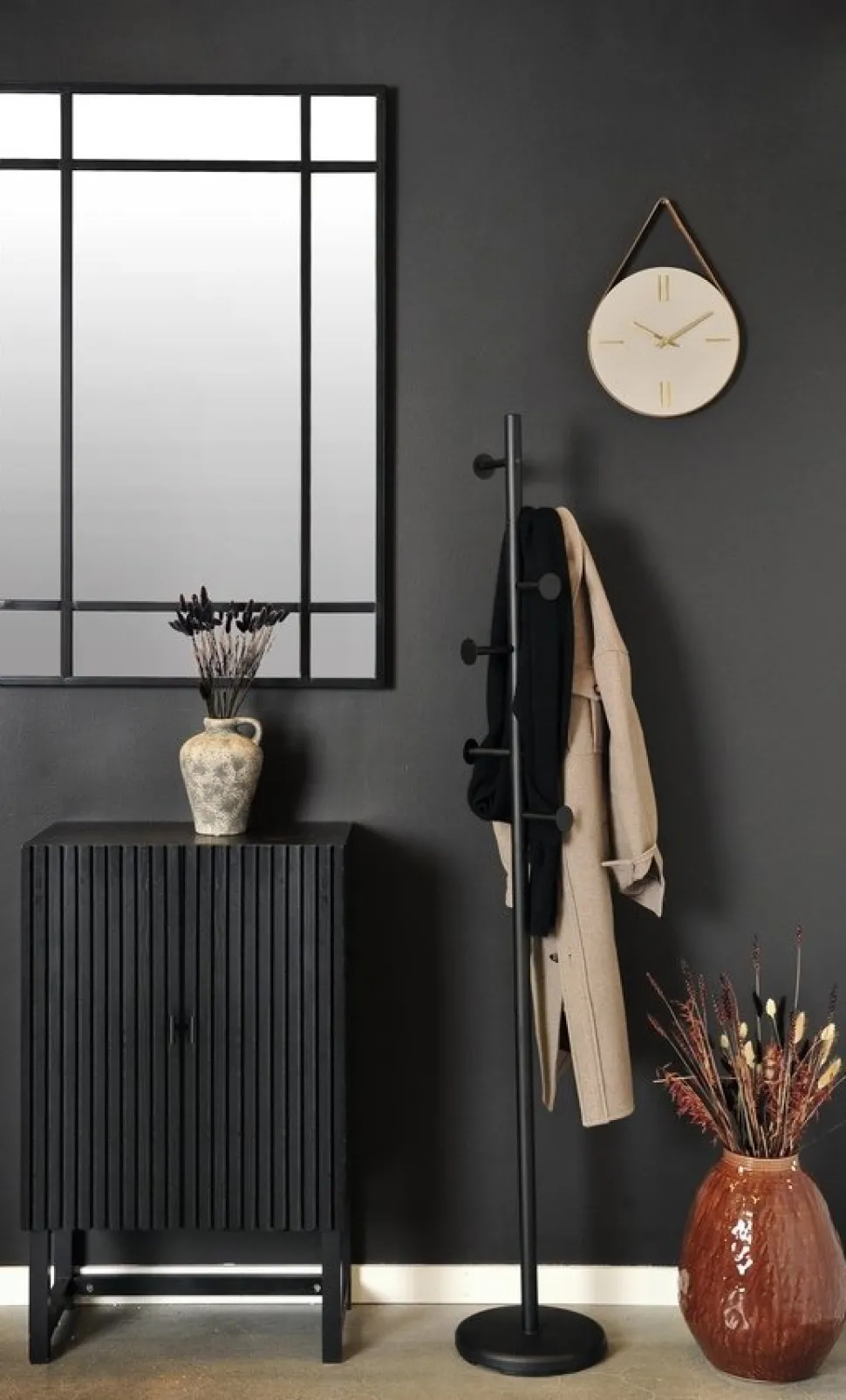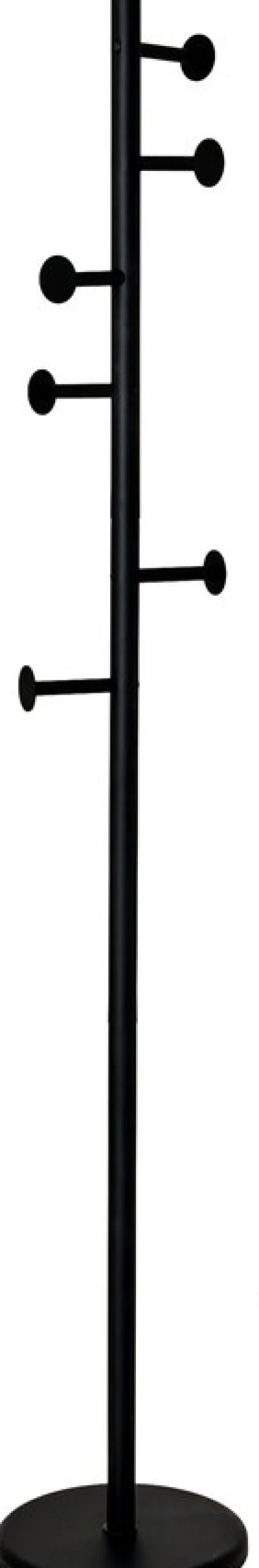 Klädhängare i svartlackad metall med rund fot och sex stycken krokar.