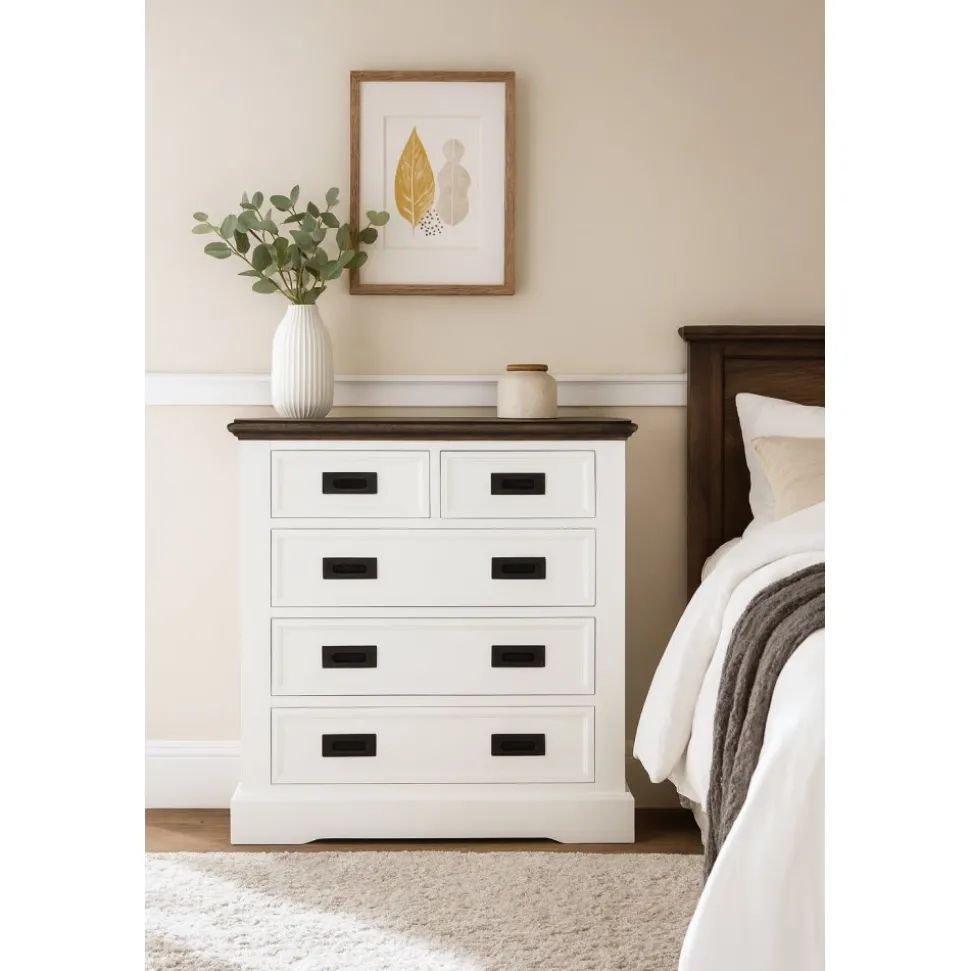 Modern i vitt/grått med goda förvaringsmöjligheter i de många lådorna. Svarta handtag som bryter av det vita på ett harmoniskt vis. En praktisk möbel som gör sig bra i de flesta hem. Ytskiktet på möbeln är behandlat för att ge ett vintage uttryck och har således lite märken och små skavanker. Färgskiftningar, märken, lagningar och småsprickor hör till dess unika utseende.
