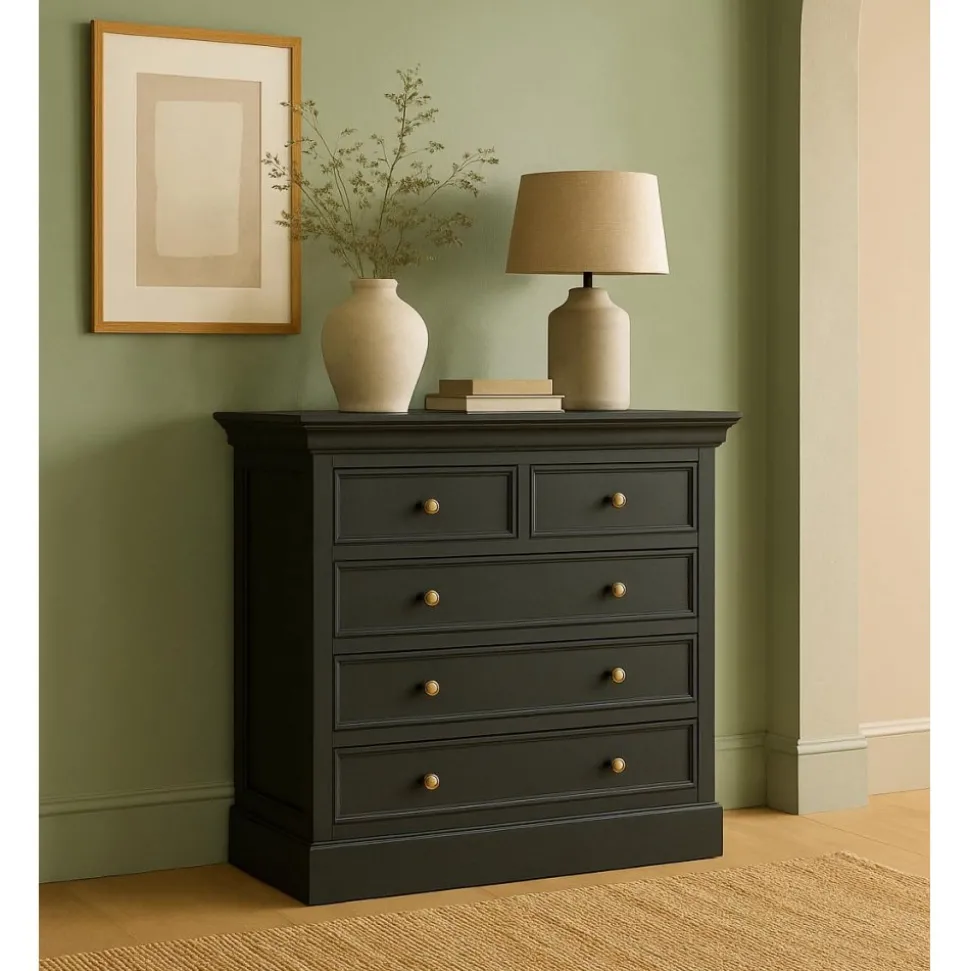 Byrå med klassisk design i svart askfanér med bra med förvaring med sina 3 stora lådor och 2 mindre lådor upptill.