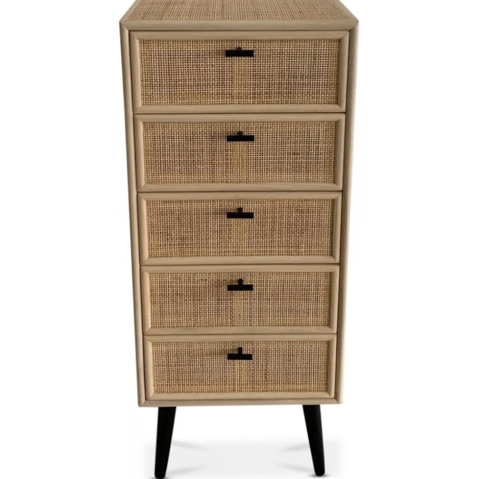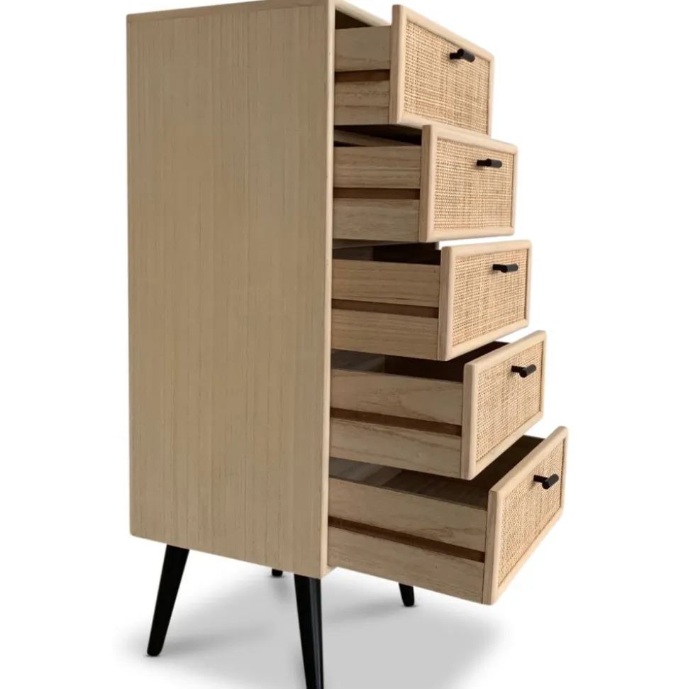 Lådorna är prydligt försedda med stiliga svarta handtag i metall, som inte bara tillför en modern touch, utan också gör det enkelt att öppna och stänga. Den handgjorda karaktären hos React-serien innebär att det är naturligt med lite råare detaljer i både träet och rottingen. Ytorna är inte helt släta, och det kan förekomma färgskiftningar som ger varje möbel sin egen personlighet och charm.