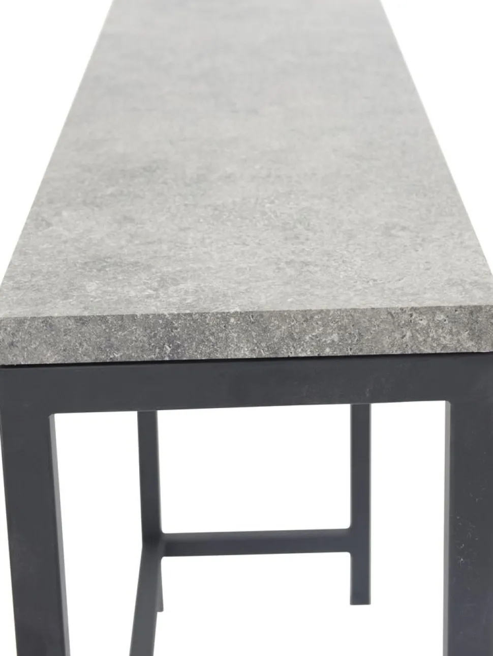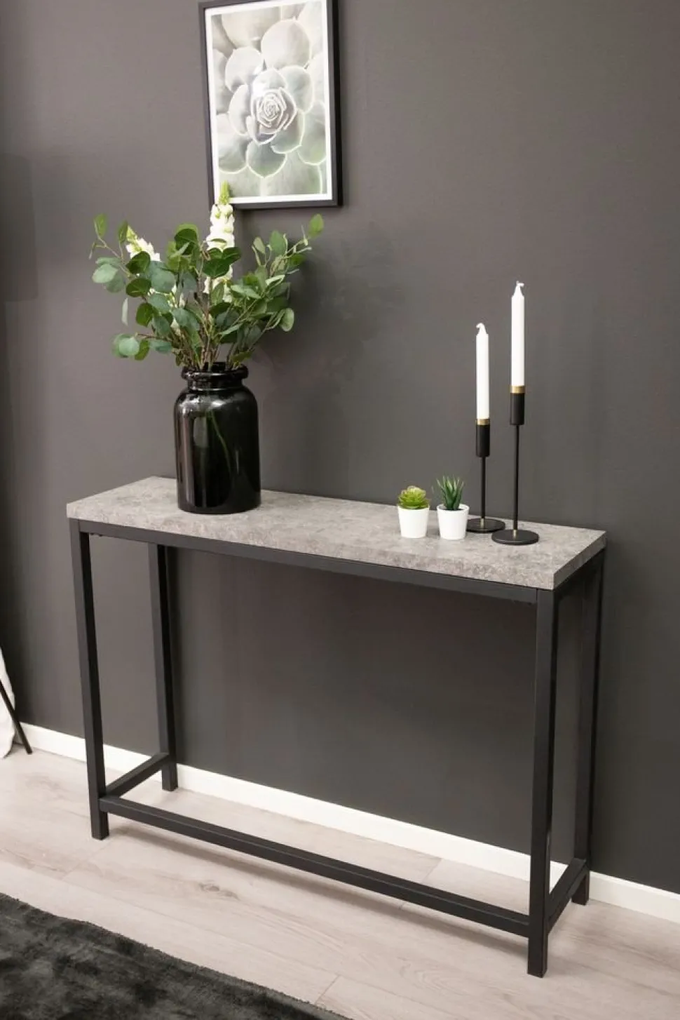 Avlastningsbord med toppskiva av MDF med mönster av betong. Underrede i svart metall.