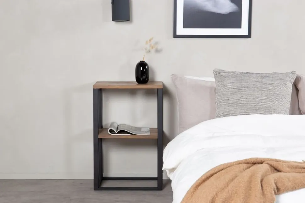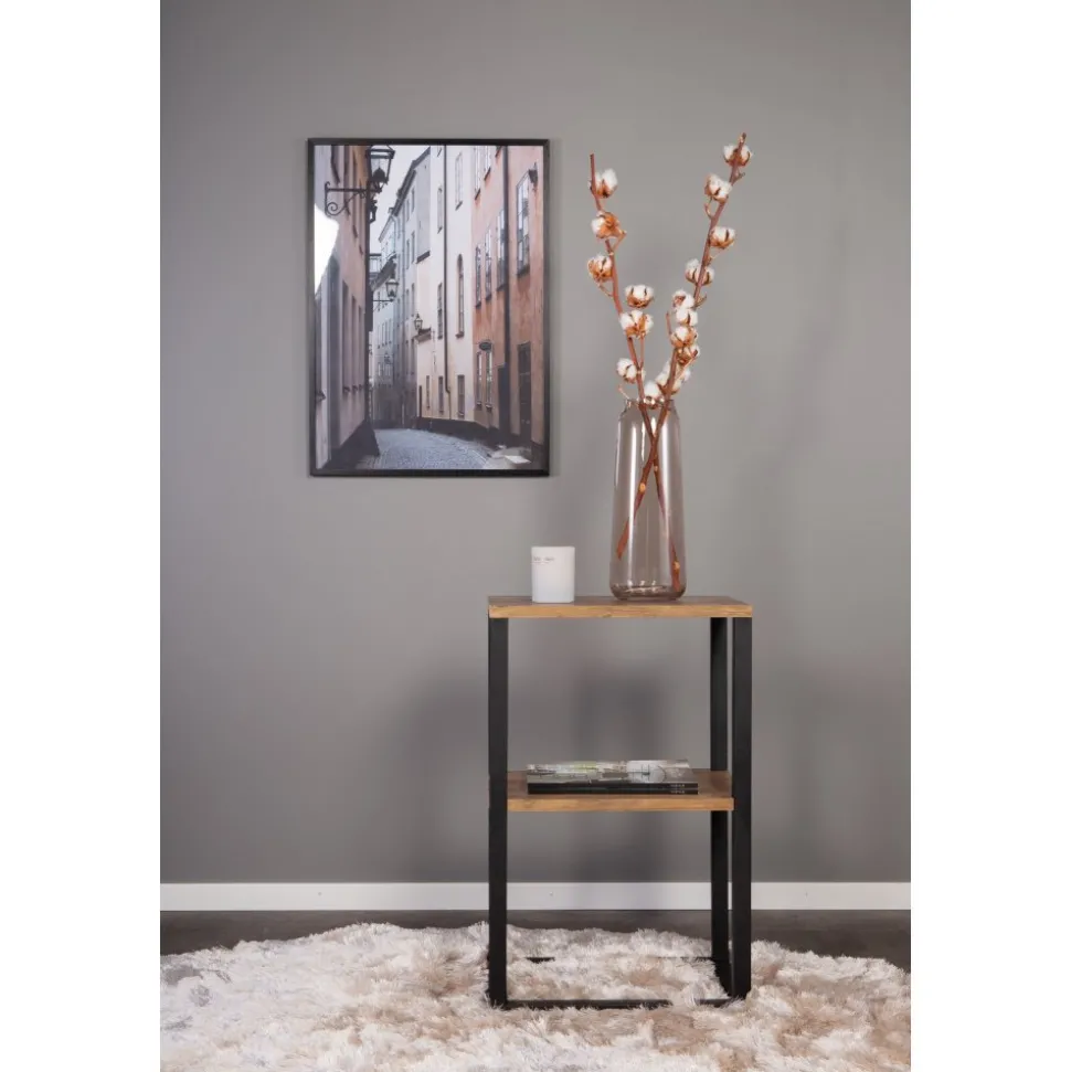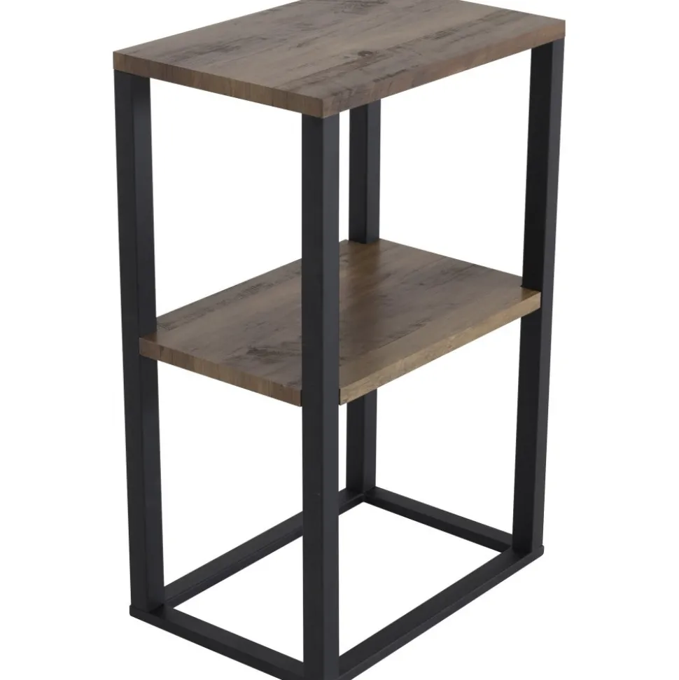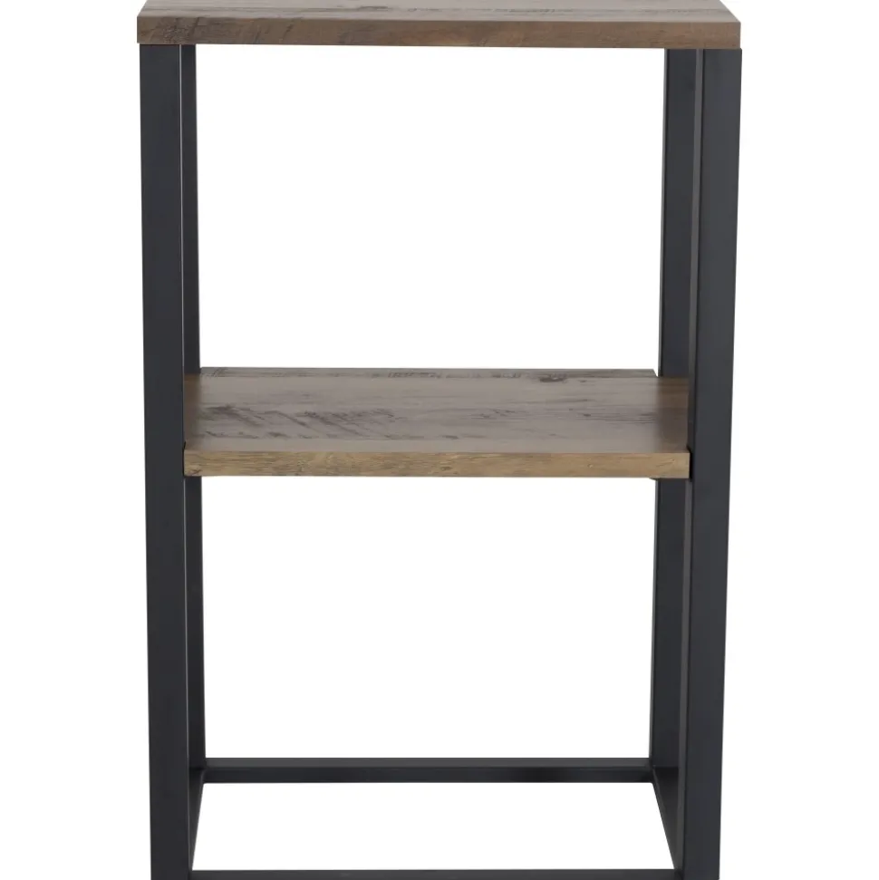 Nätt med två st hyllplan i MDF med imitation av teak. Stomme av svart metall.