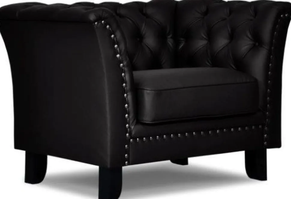 Chester bridge är en välbyggd modern chesterfield i svart tålig PU med läderkänsla. Nitar som snygg och exklusiv detalj tillsammans med massiva svarta träben. Kallskum med polyetertopp i sittdyna vilket säkrar en skön och hållbar komfort.