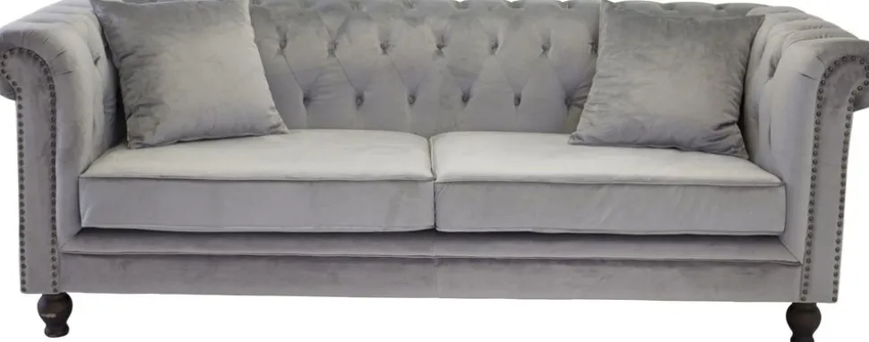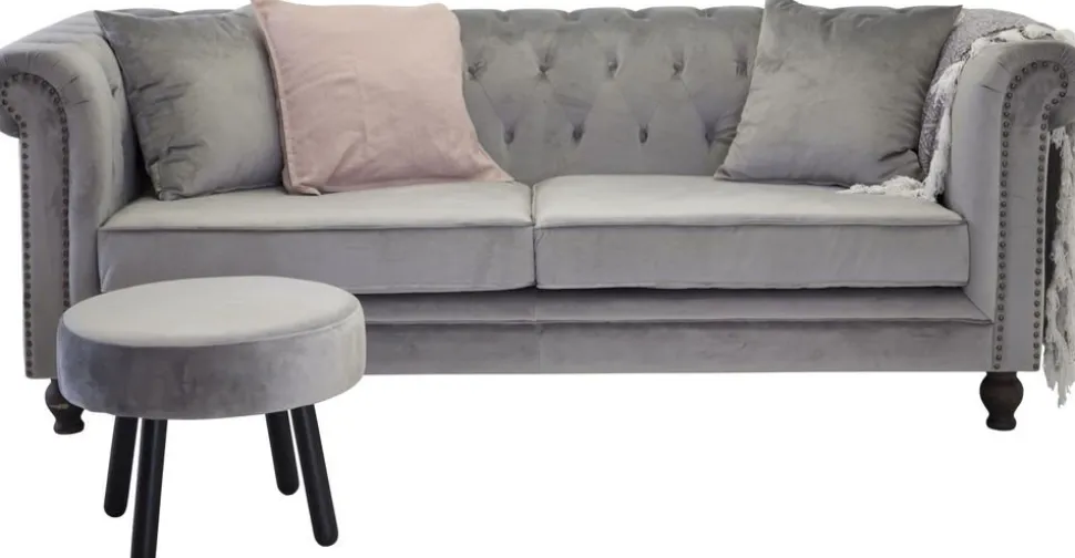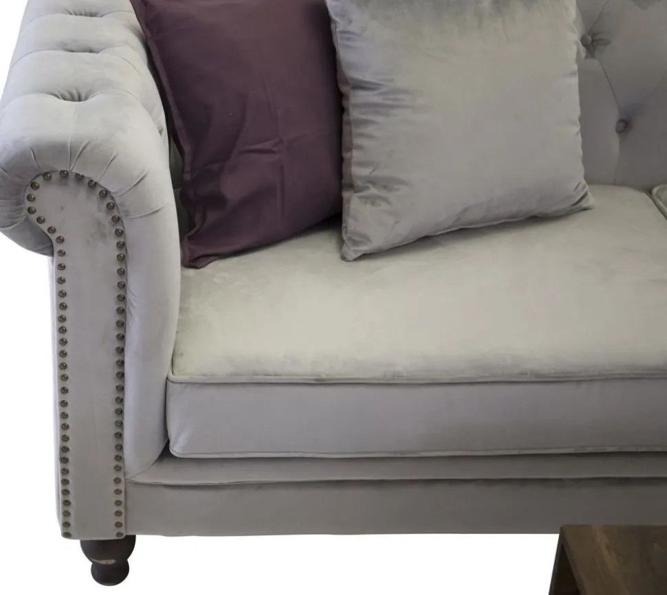 Stilig klädd med ett ljusgrått sammetstyg. Dekorativa nitar framtill. Stommen är av massivt trä.