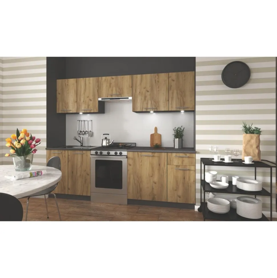 Med en bredd på 240 cm erbjuder Daria en genomtänkt layout med gott om förvaring och arbetsyta. De praktiska skåpen och lådorna gör det enkelt att organisera köksredskap och matvaror, vilket ger en smidig och effektiv matlagningsupplevelse.