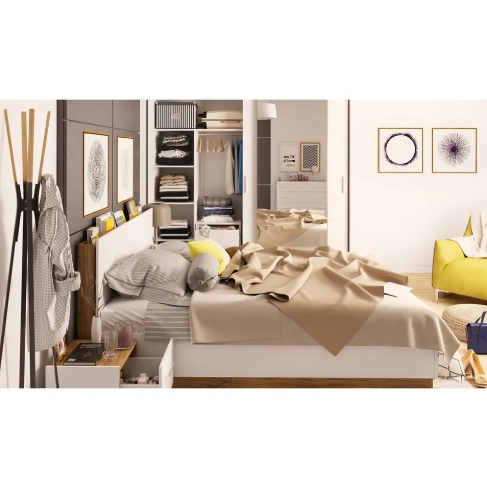 Säng av trä med förvaringsutrymme och integrerad sänggavel med LED-belysning. Gasfjädrar på båda sidor hjälper till att lyfta och hålla uppe ribbotten för åtkomst till förvaringsutrymmet. Levereras omonterad. Madrass ingår ej.