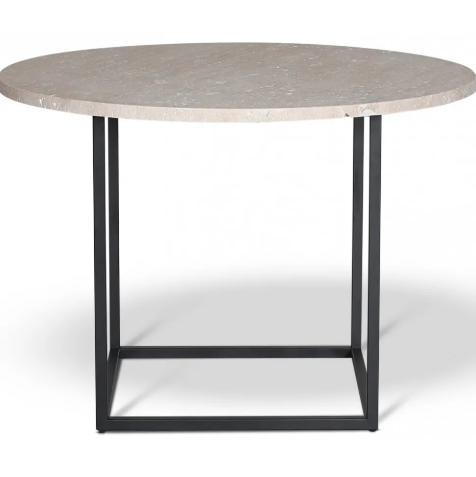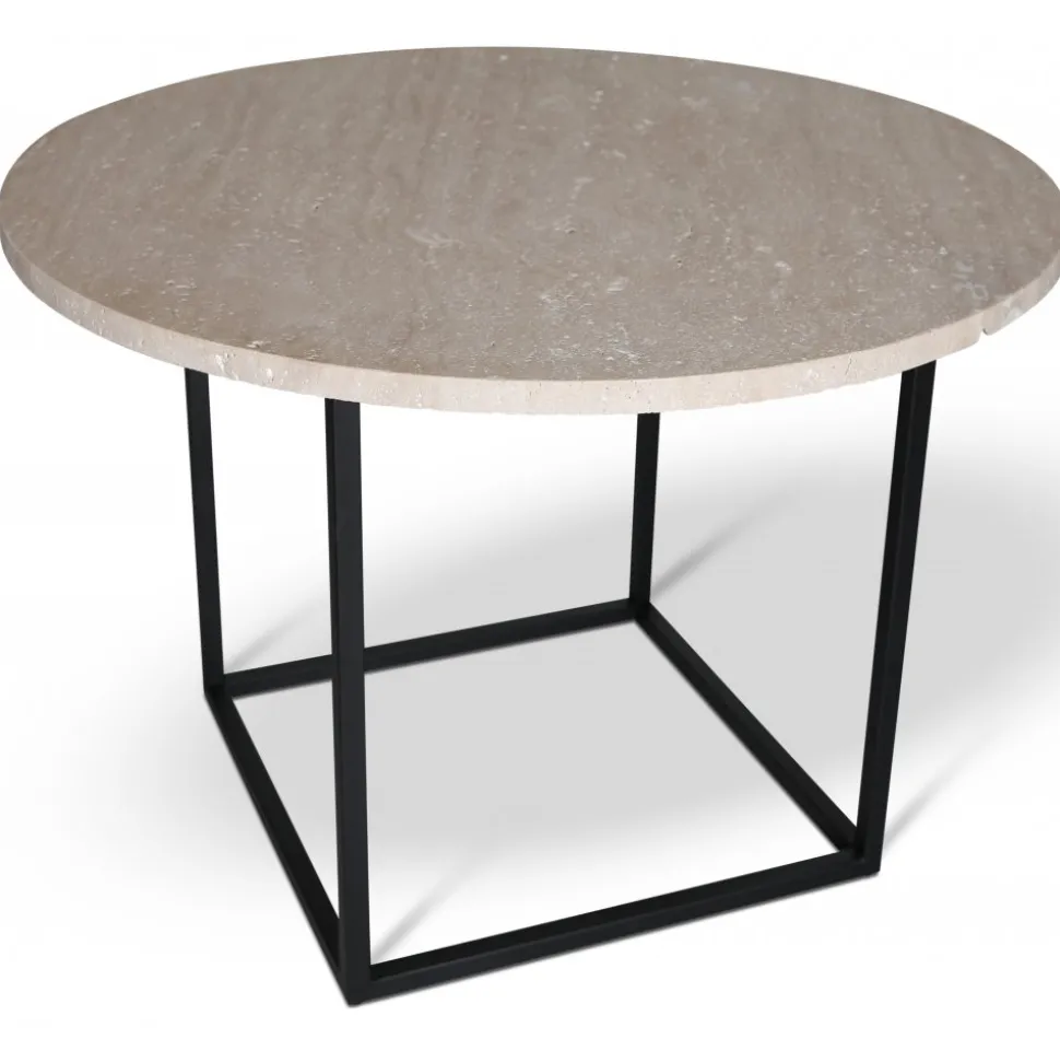 Dexter med svartlackat metallunderrede och en toppskiva i äkta travertin sten.