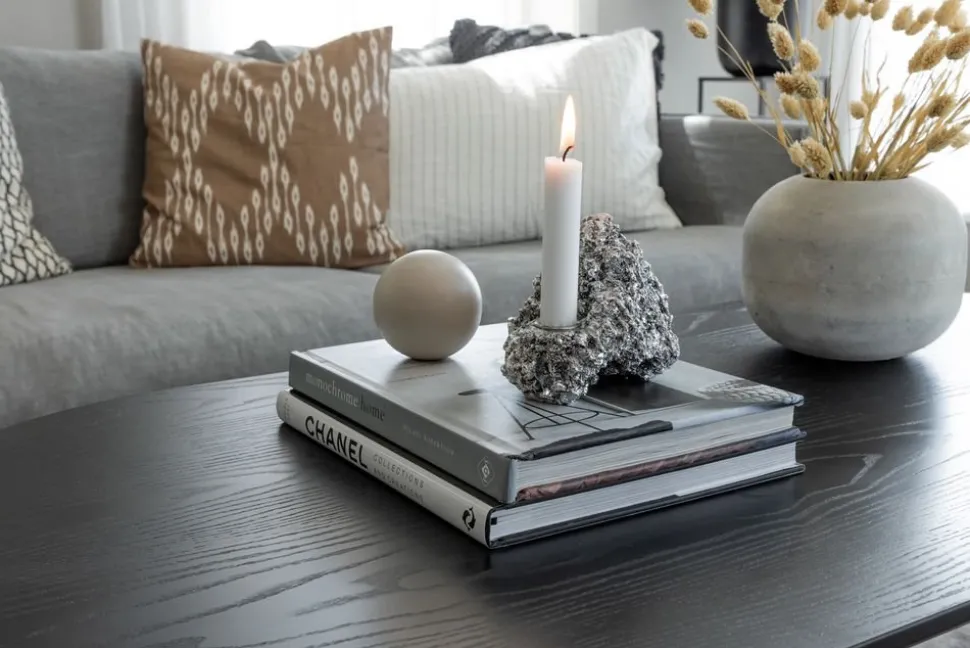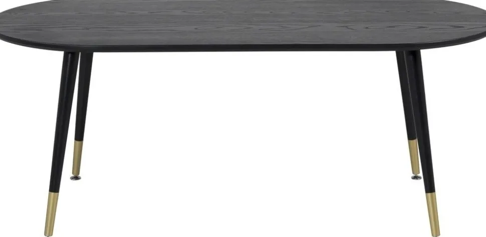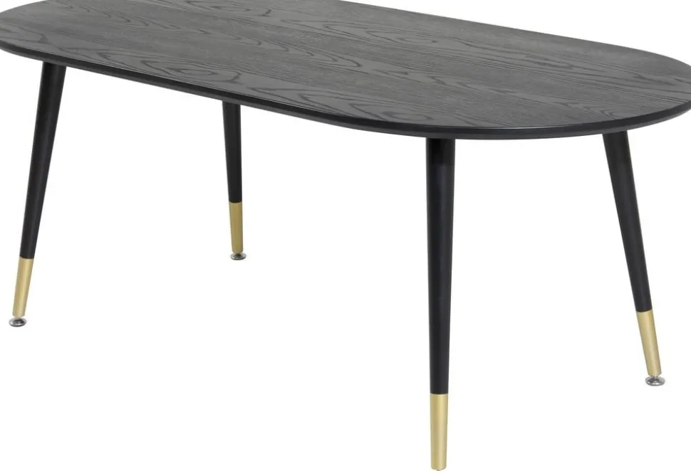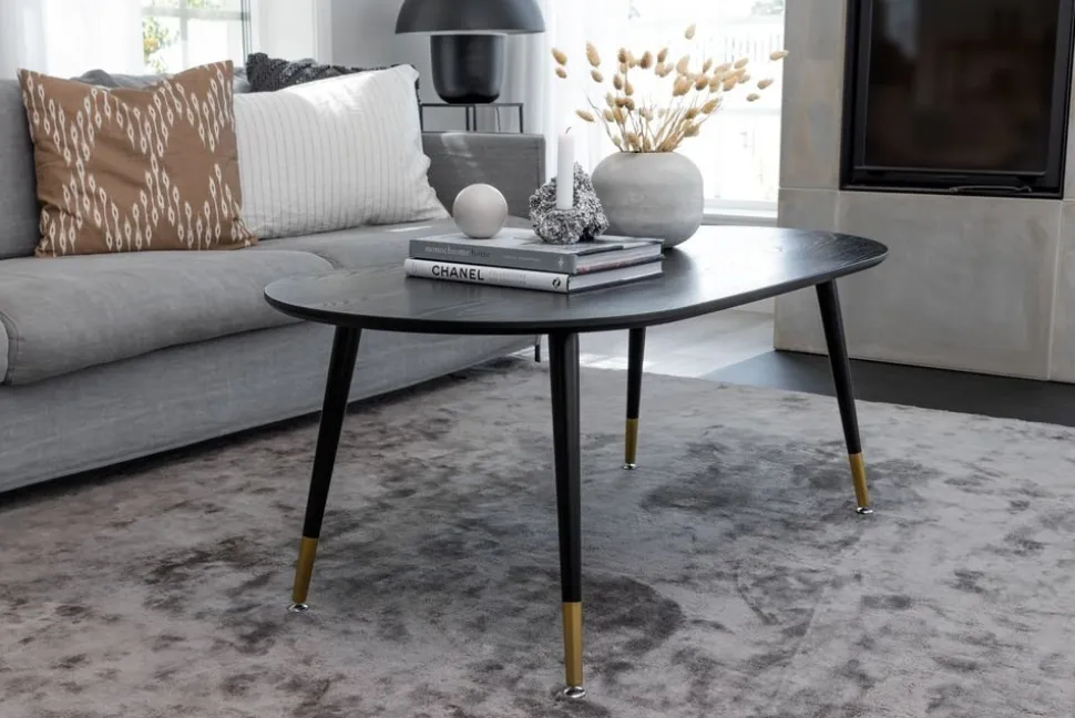 Modernt i svart med toppskiva av fanér och mässingsdetaljer nertill på benen.