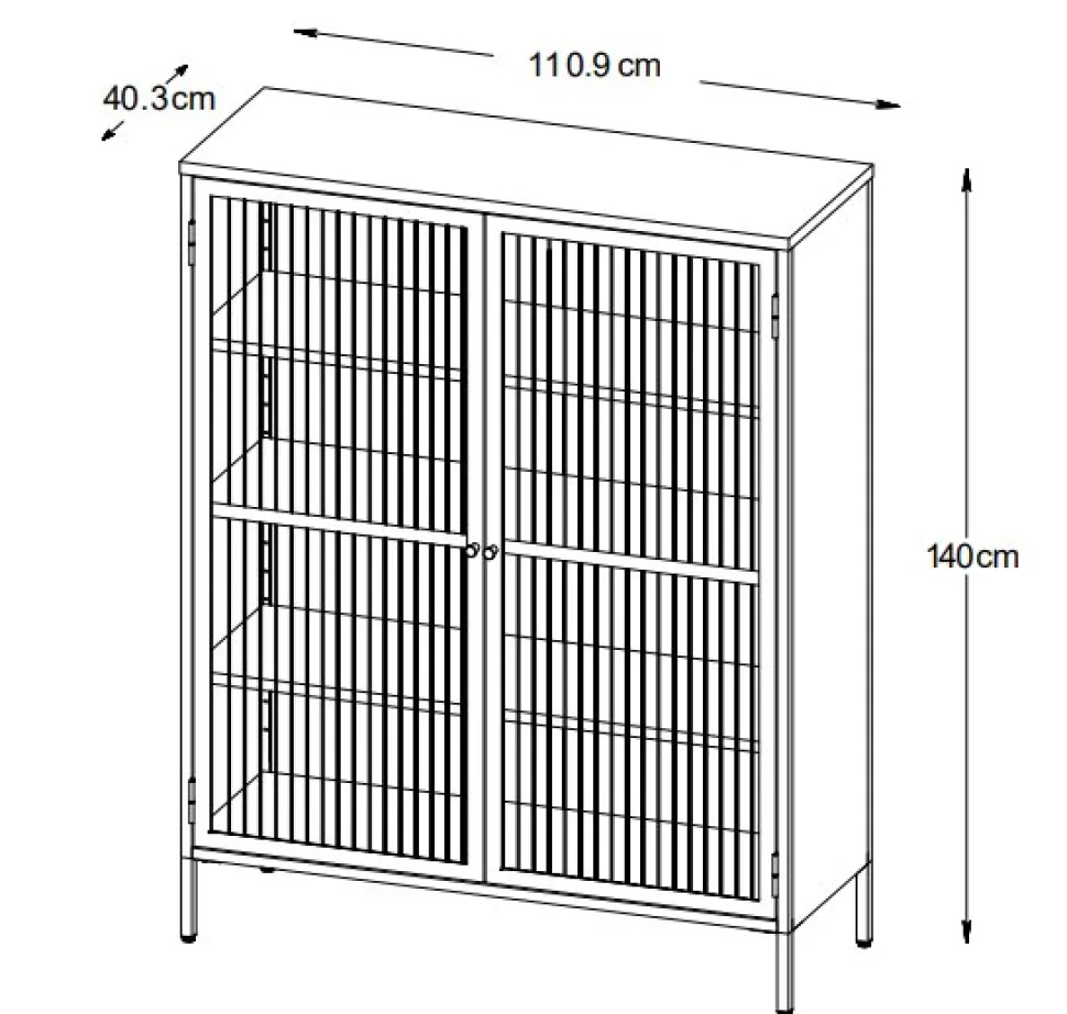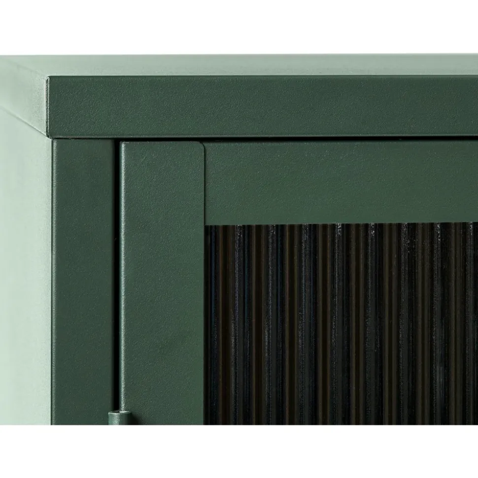 Dobb mörkgrönt metallskåp med dörrar i riktigt linjerat glas. Handtag i mässing. Skåpet har en stabil konstruktion i metall.