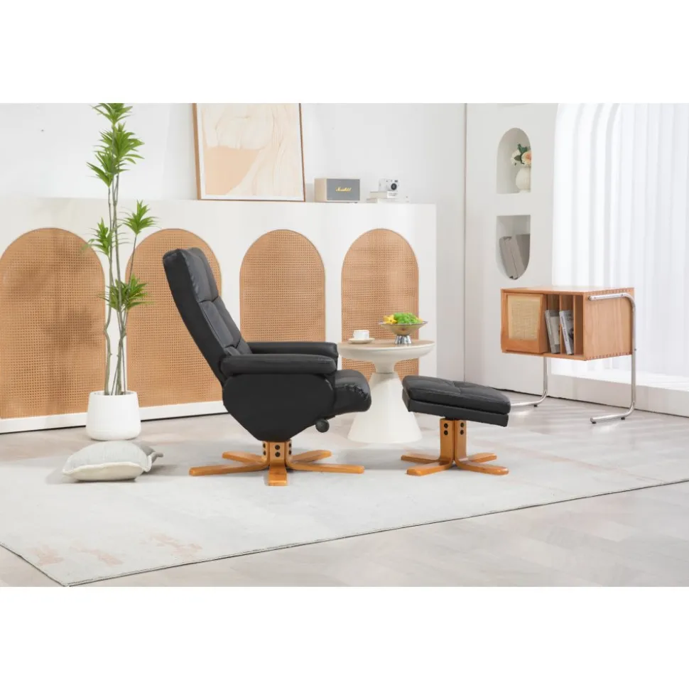 - Duva reclinerfåtölj med fotpall i svart PU med bruna ben
