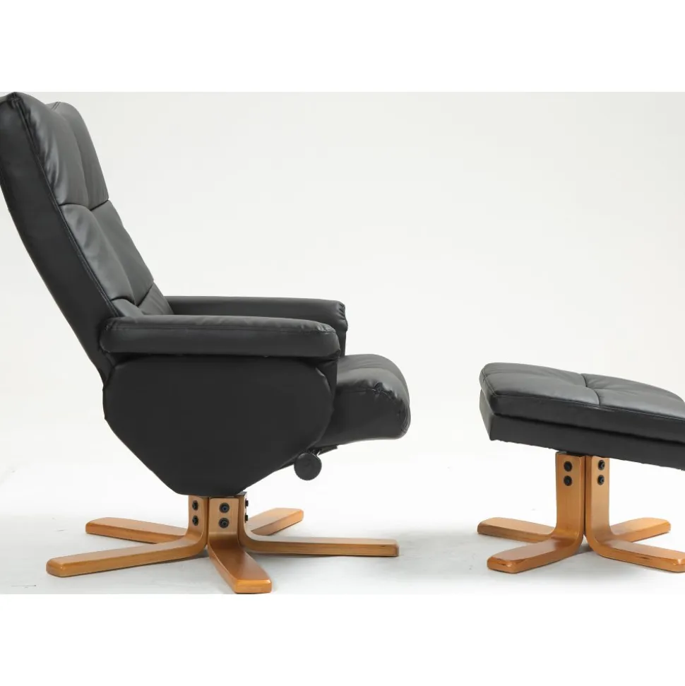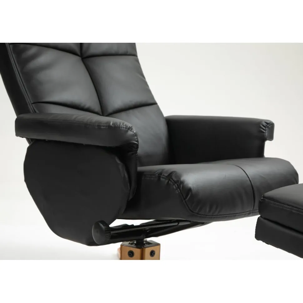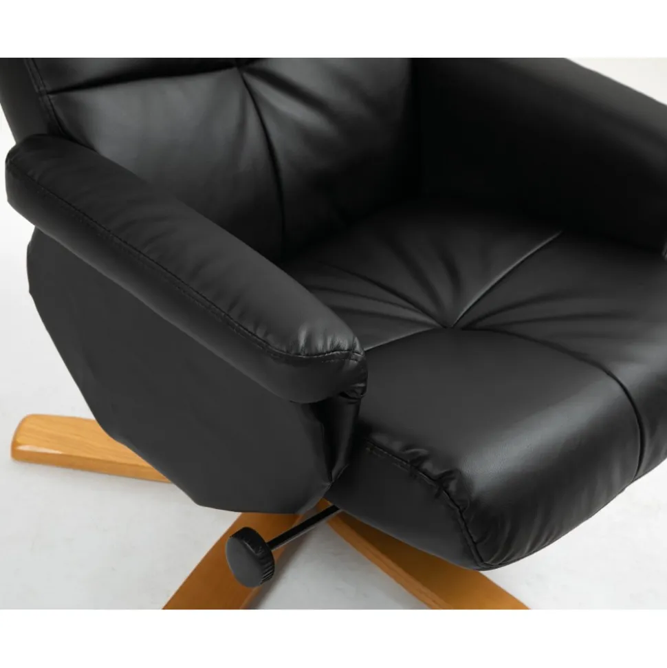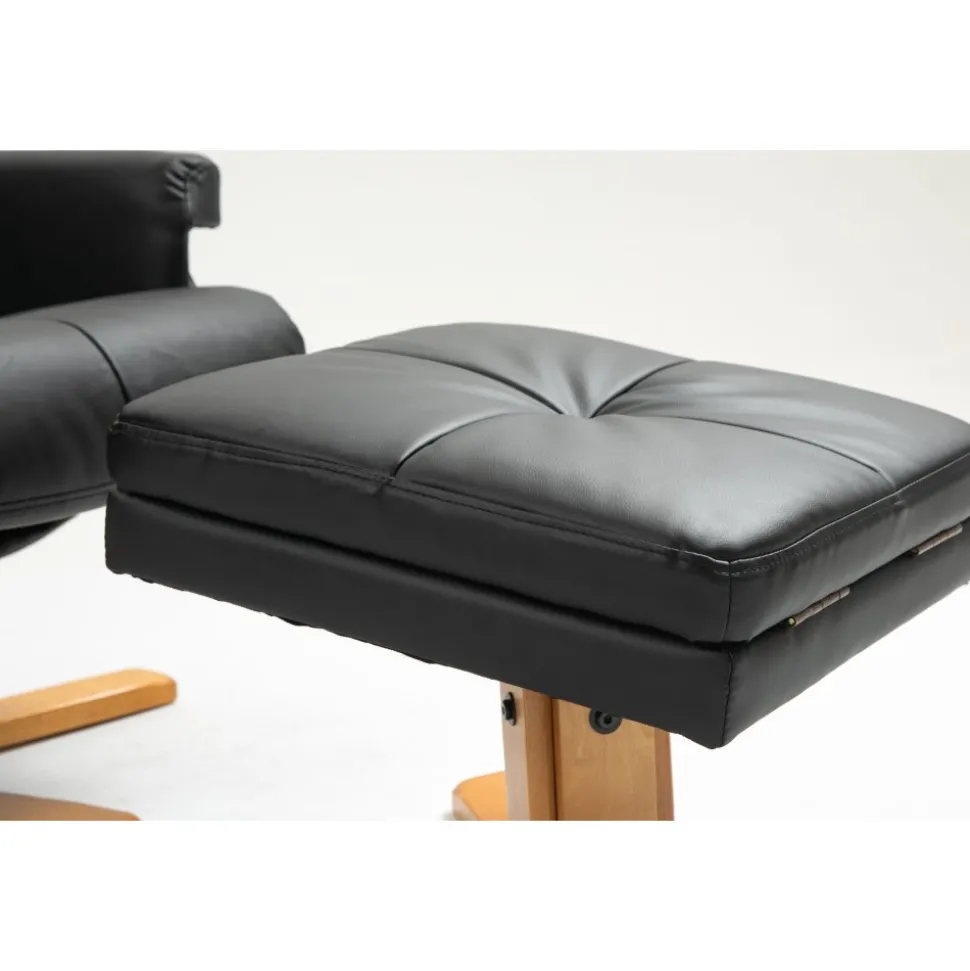 Fåtöljen och fotpallen har en modern och väl genomtänkt design som smidigt passar in i olika inredningsstilar, och de är klädda i äkta svart PU-material som inte bara ser elegant ut utan också är lätt att rengöra och underhålla. Denna kombination av stil och funktionalitet gör Duva till en idealisk möbel för både avslappning och stilmedvetenhet i ditt hem.