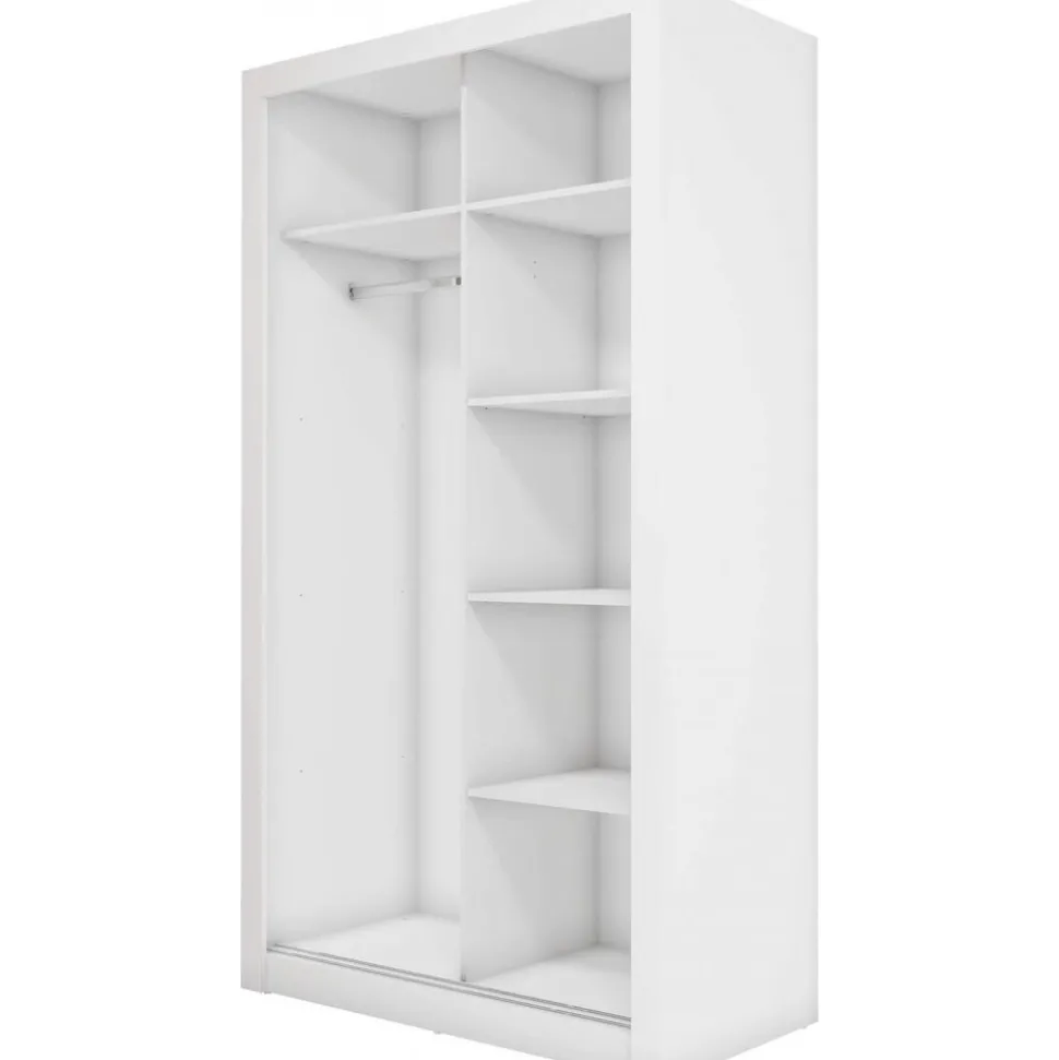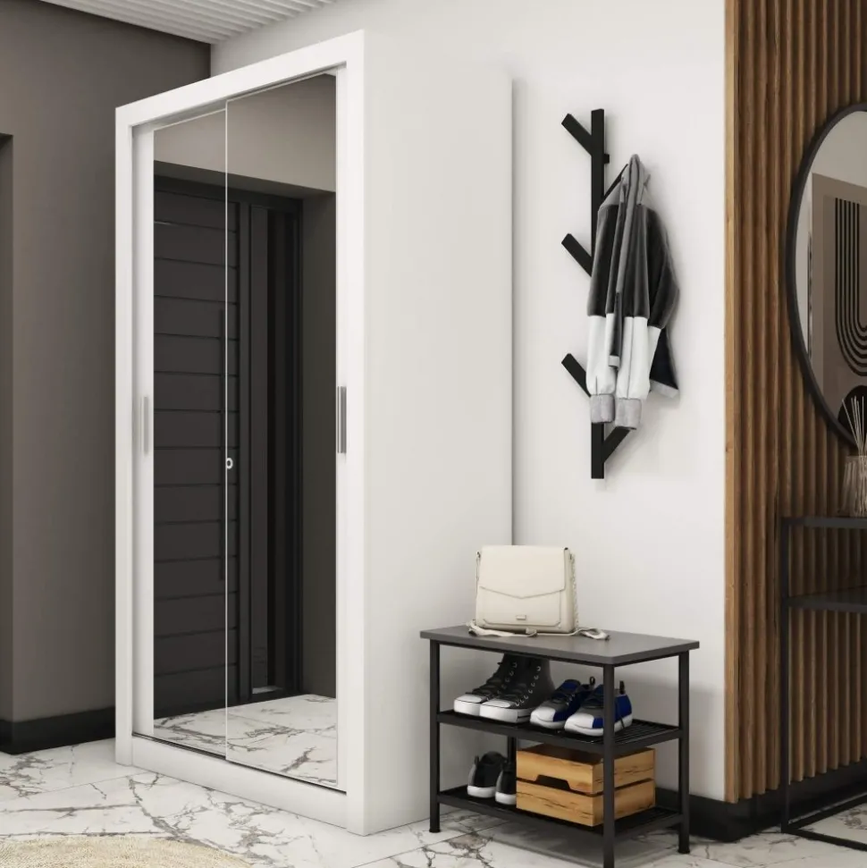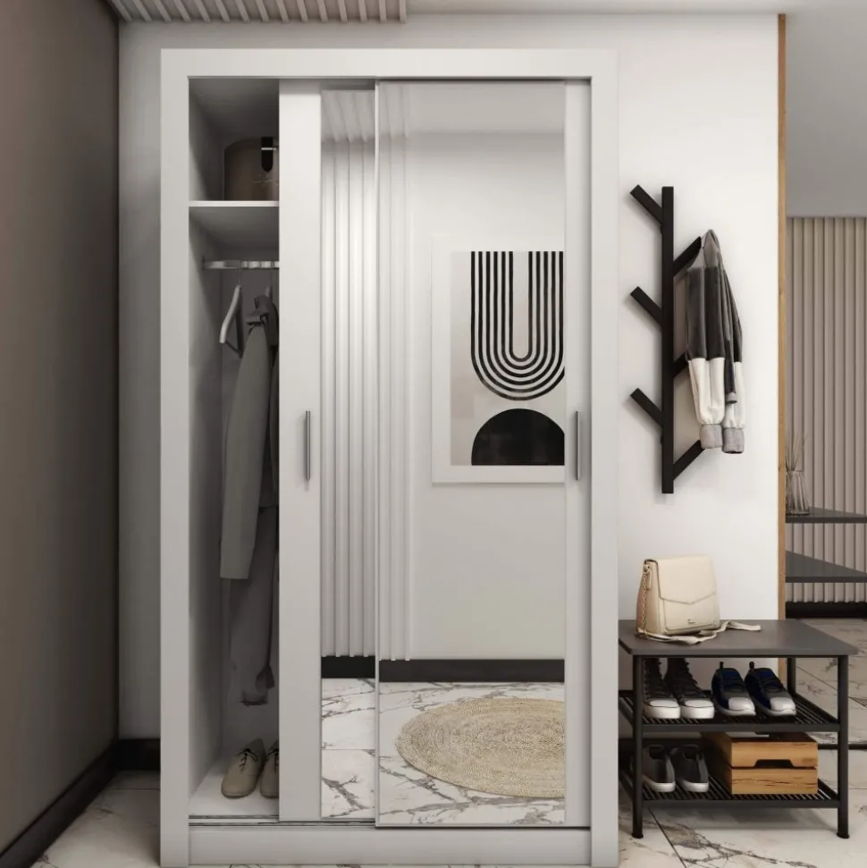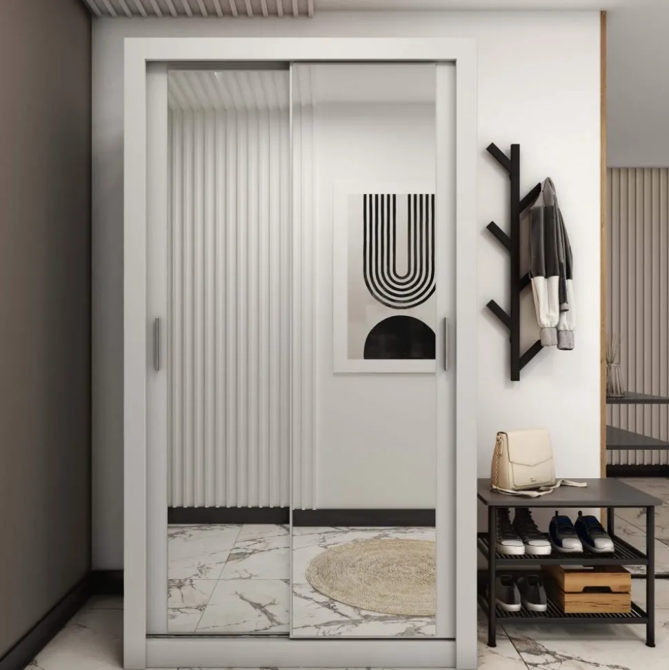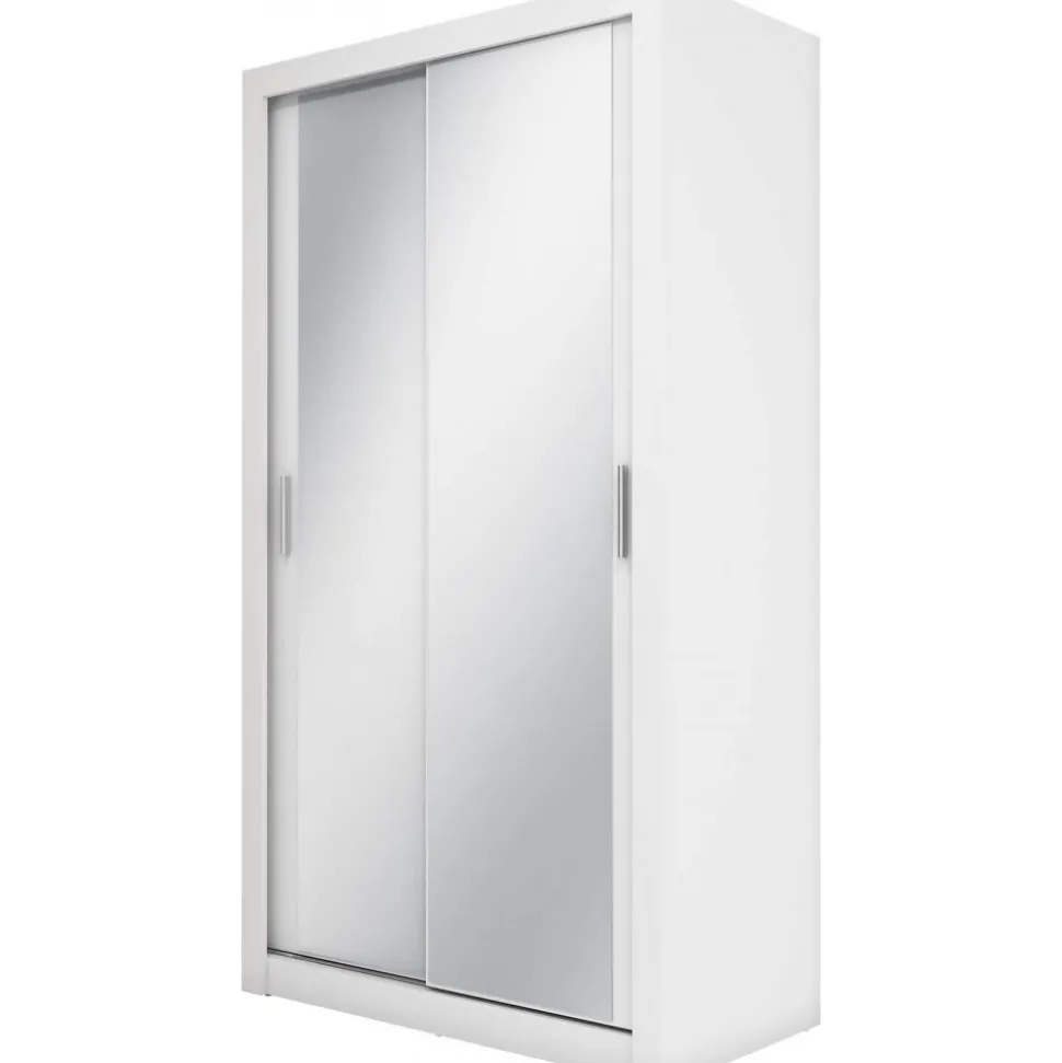 Garderob av trä med spegelförsedda skjutdörrar. Handtag av plast med matt finish. Levereras omonterad.