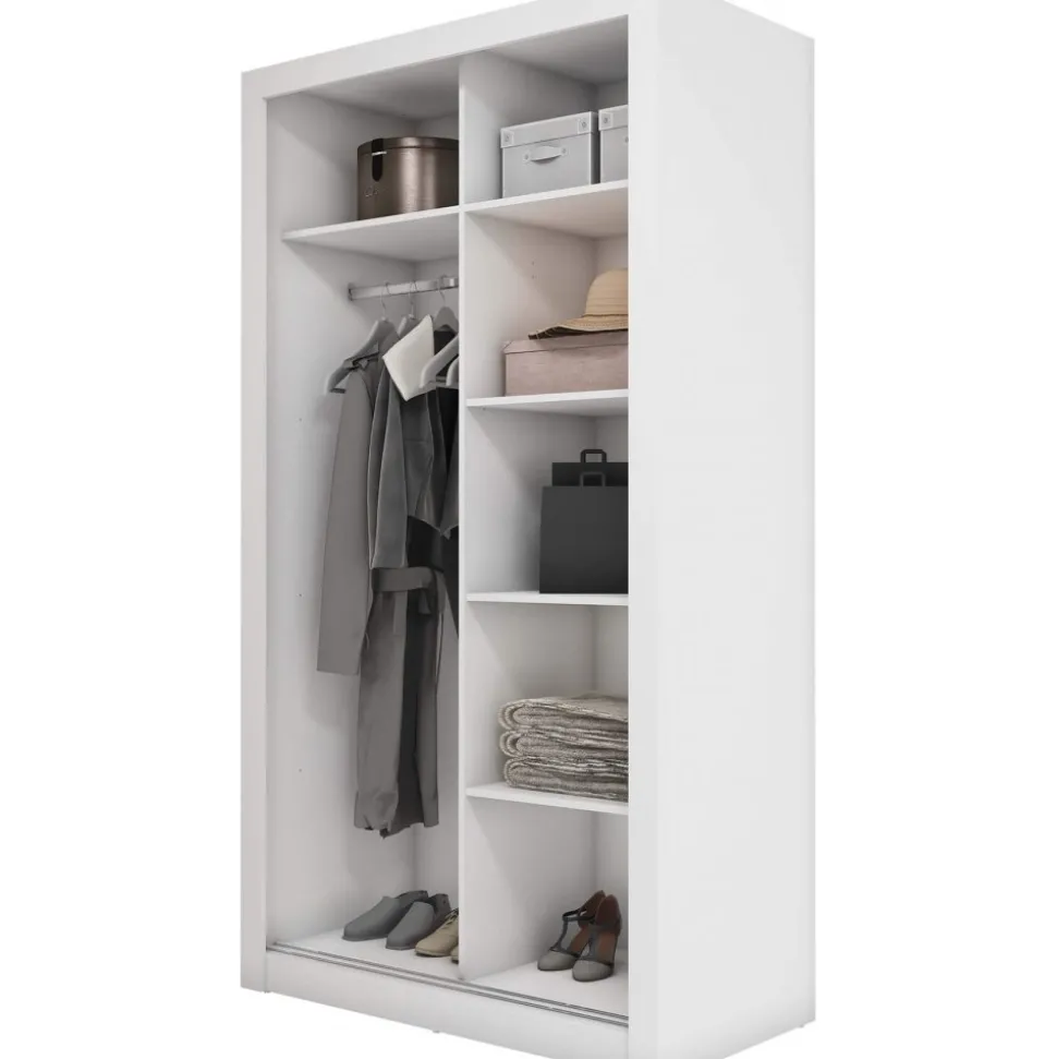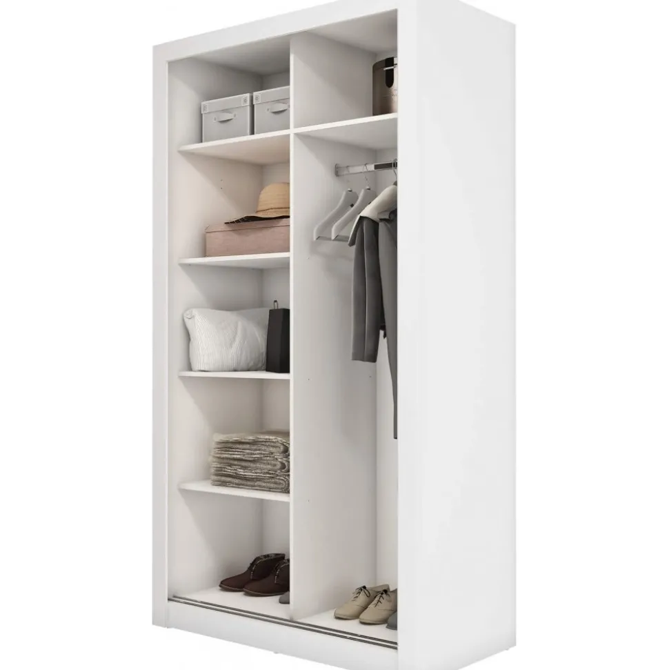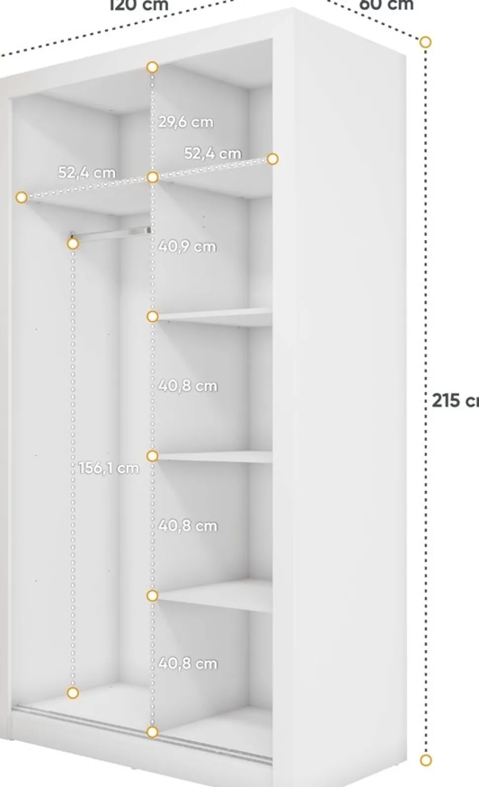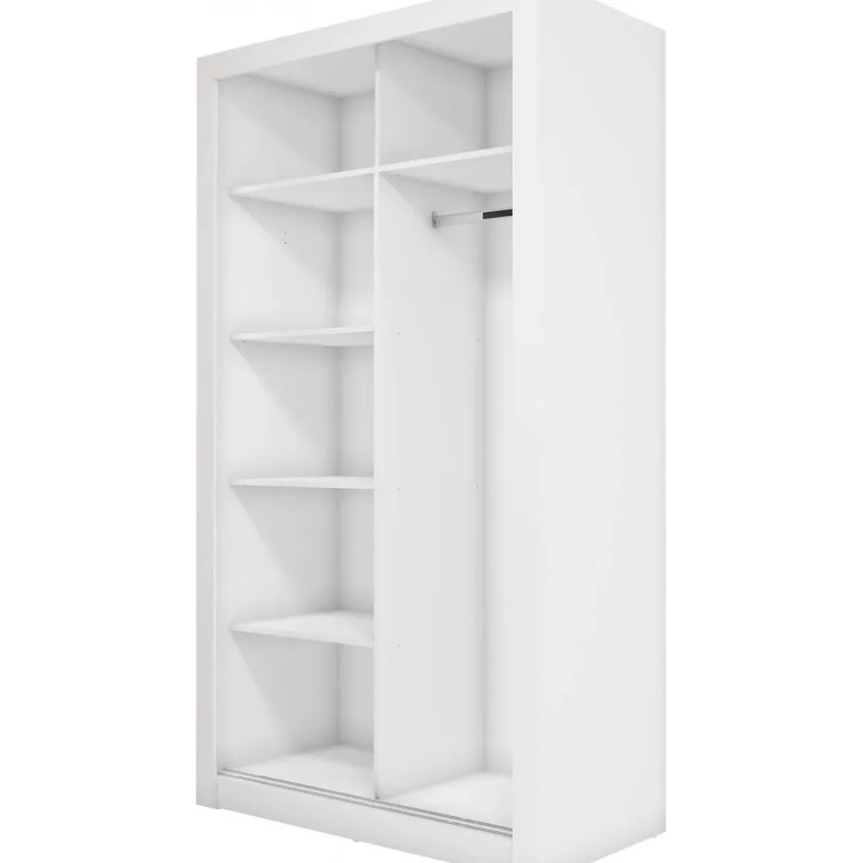 Garderob av trä med spegelförsedda skjutdörrar. Handtag av plast med matt finish. Levereras omonterad.