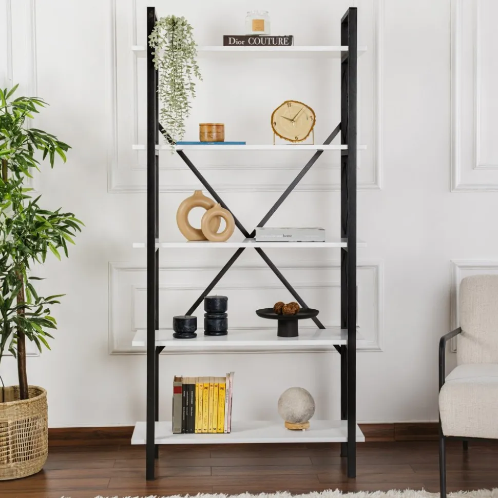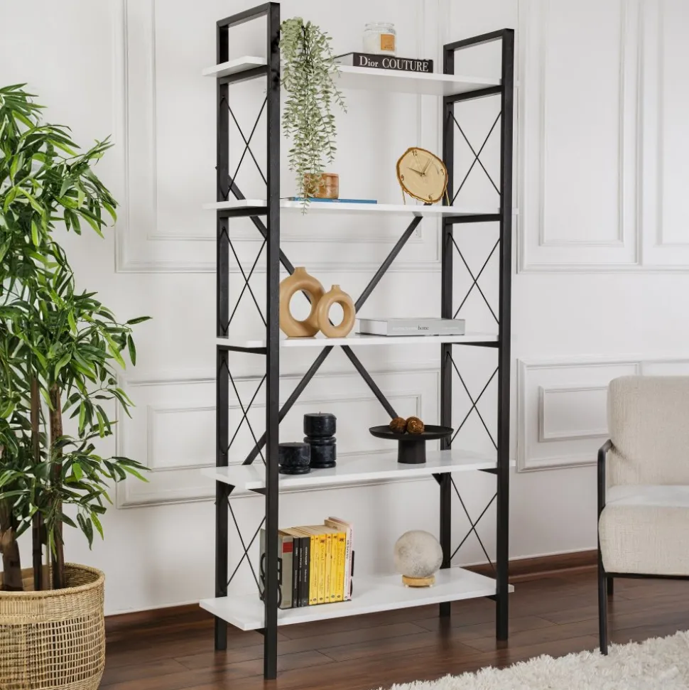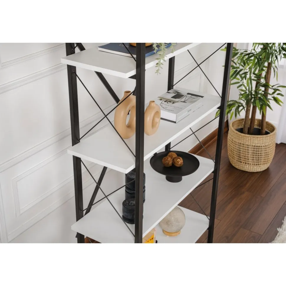 Bokhylla av melaminbelagd spånskiva och metall.