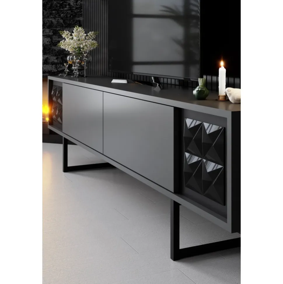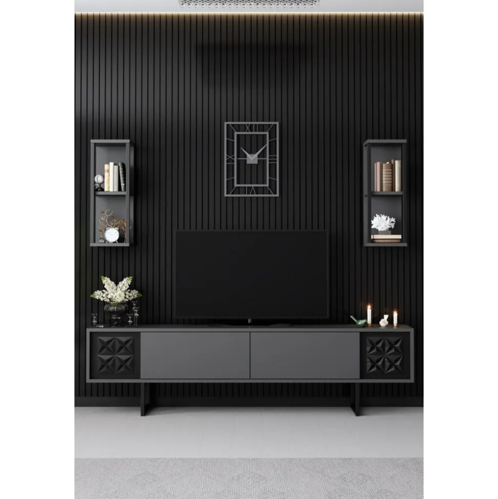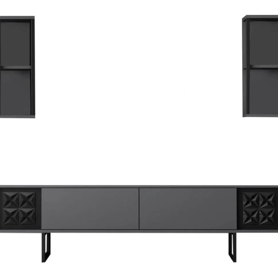 Mediabänk och vägghyllor av melaminbelagd spånskiva med ben av metall.