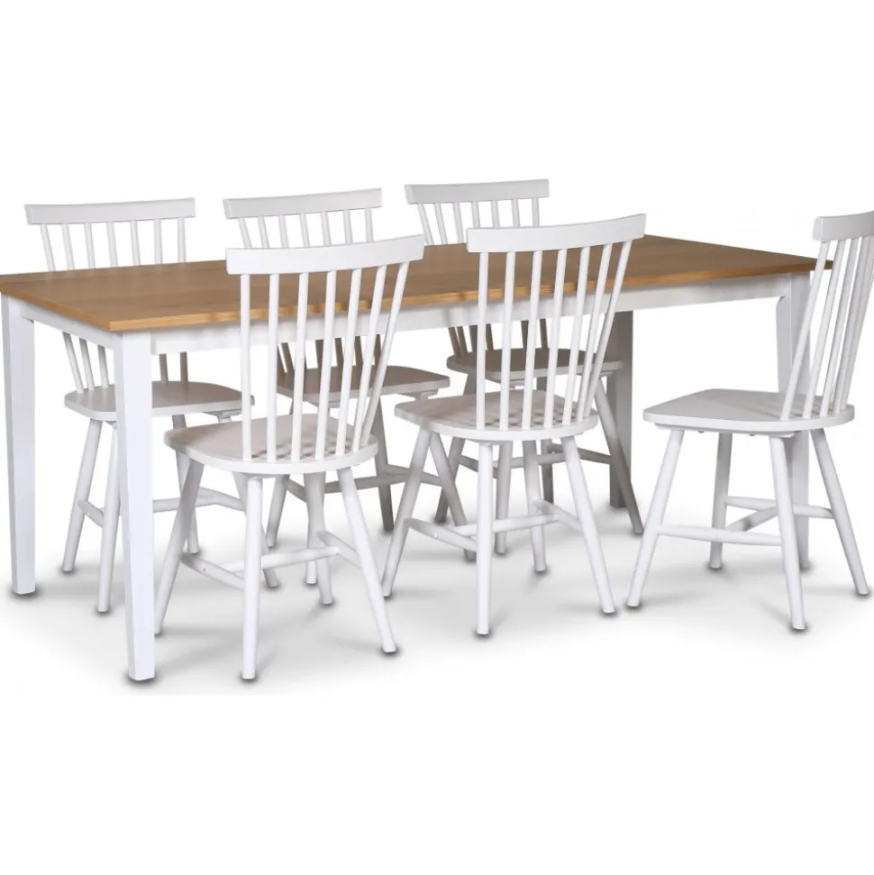 Fårö från Skånska Möbelhuset, klassiskt matbord 180×90 cm med vitt underrede och en toppskiva i oljad ekfanèr. Det ingår 6 stycken matchande Karl pinnstolar i vitlackat trä.