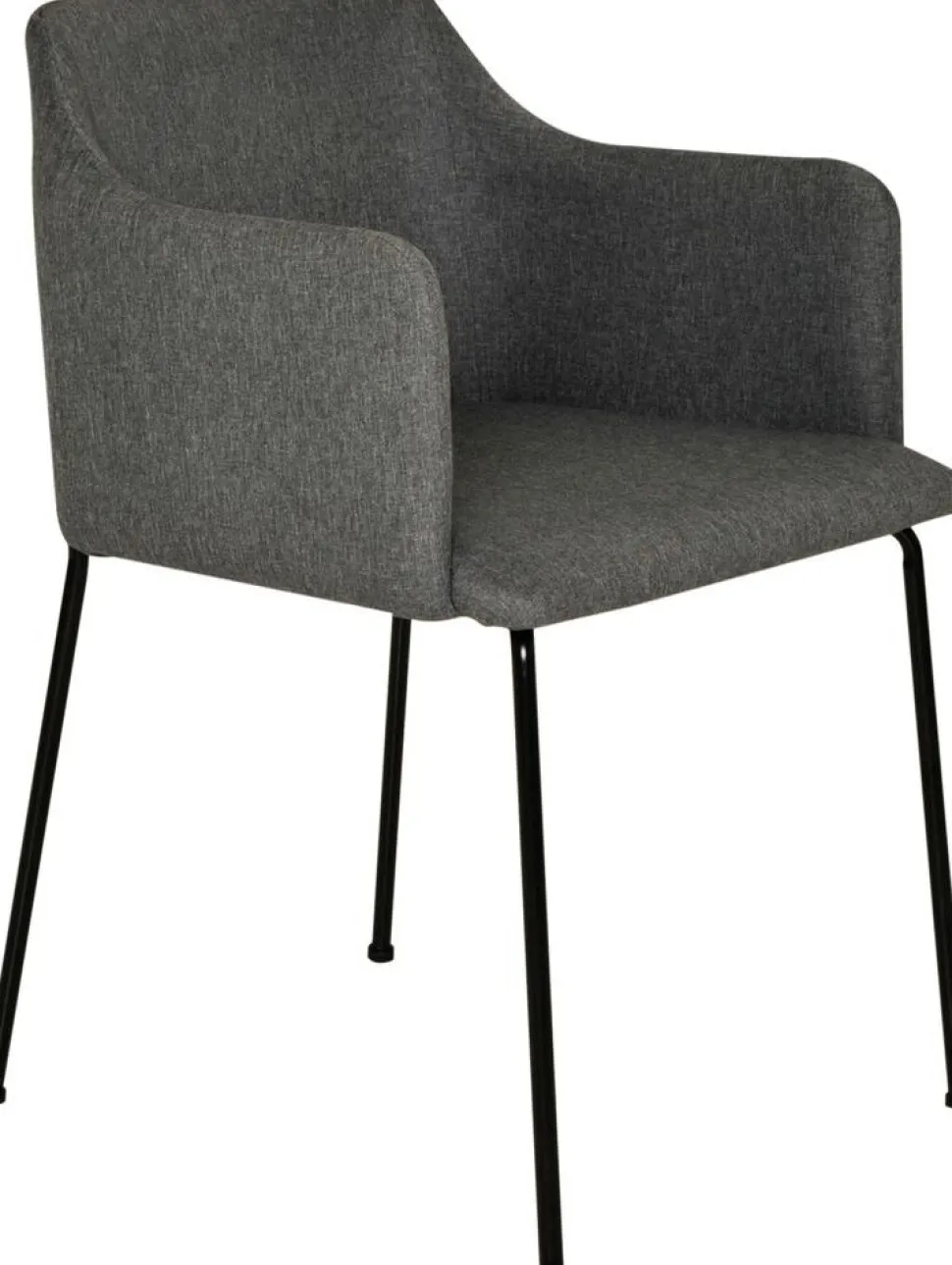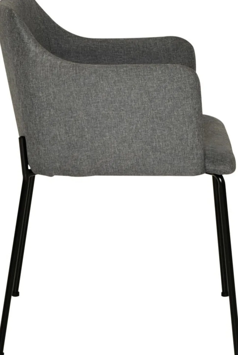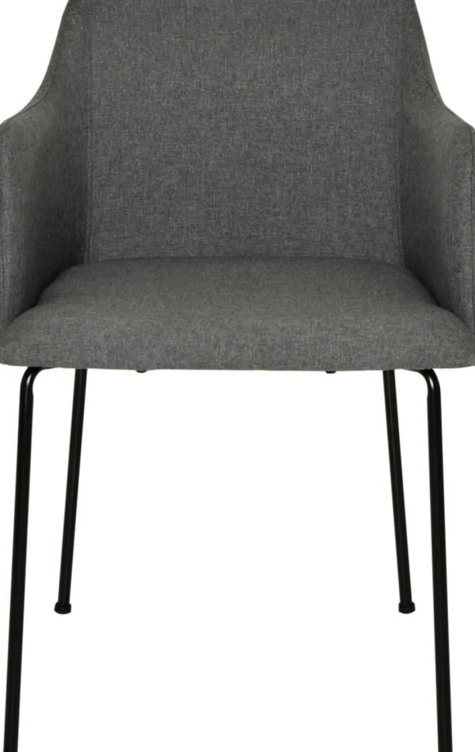 Karmstol i ett behagligt grått tyg, underrede av svartlackad metall.