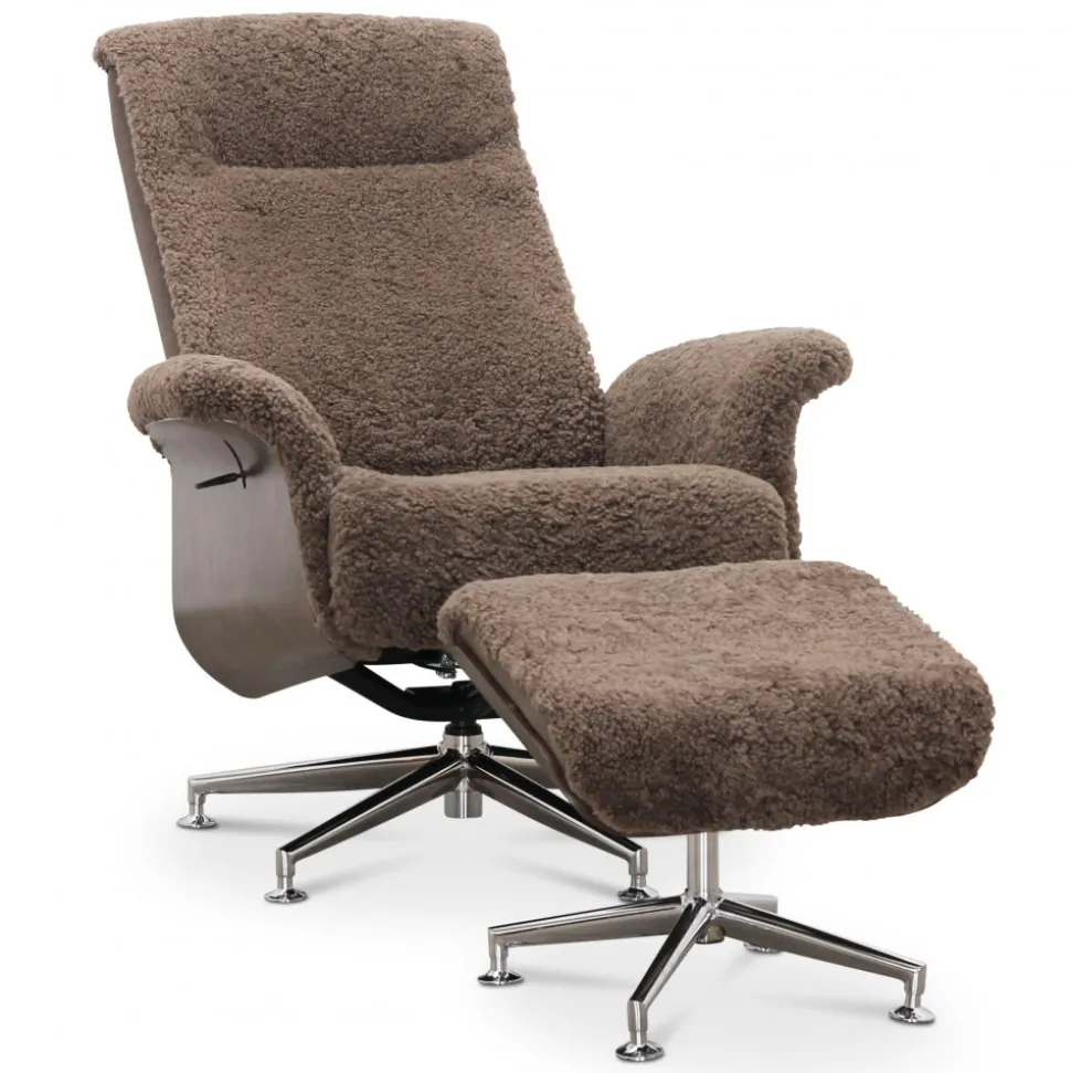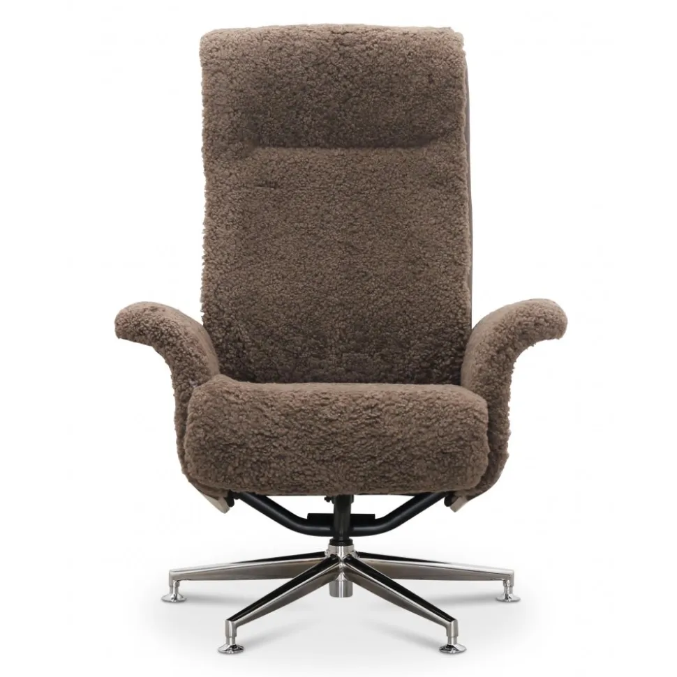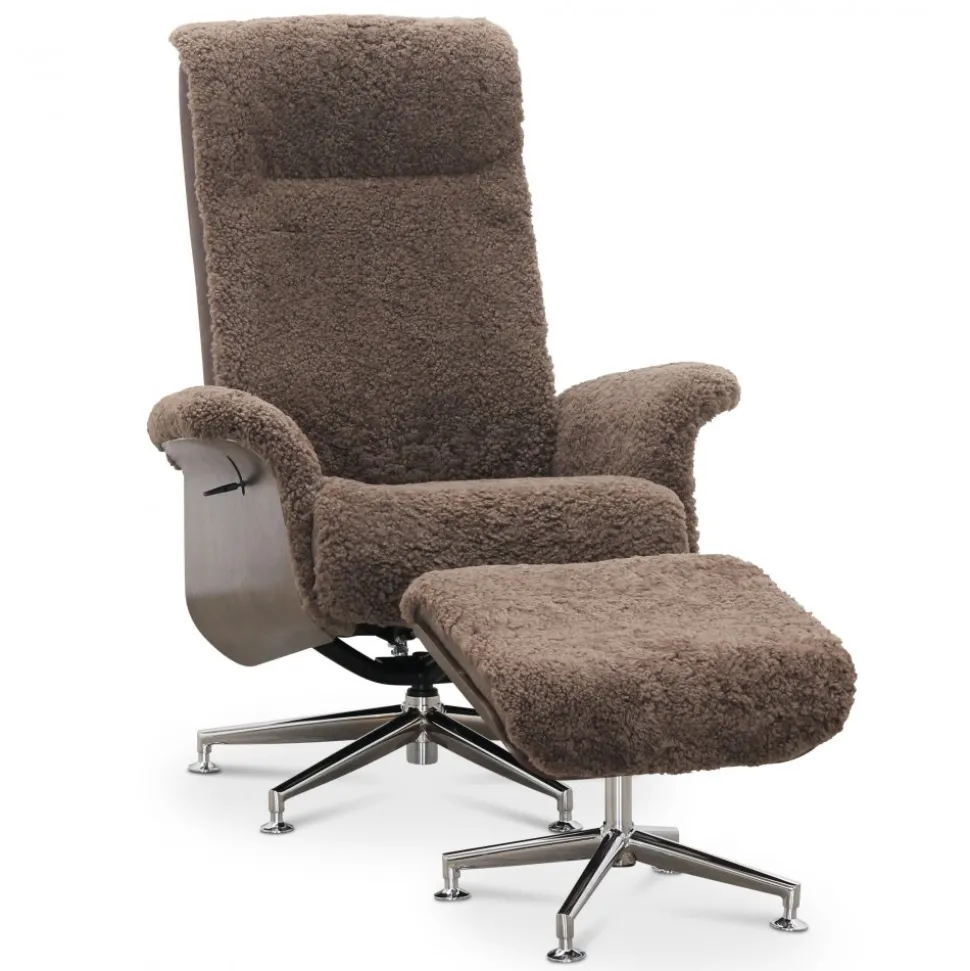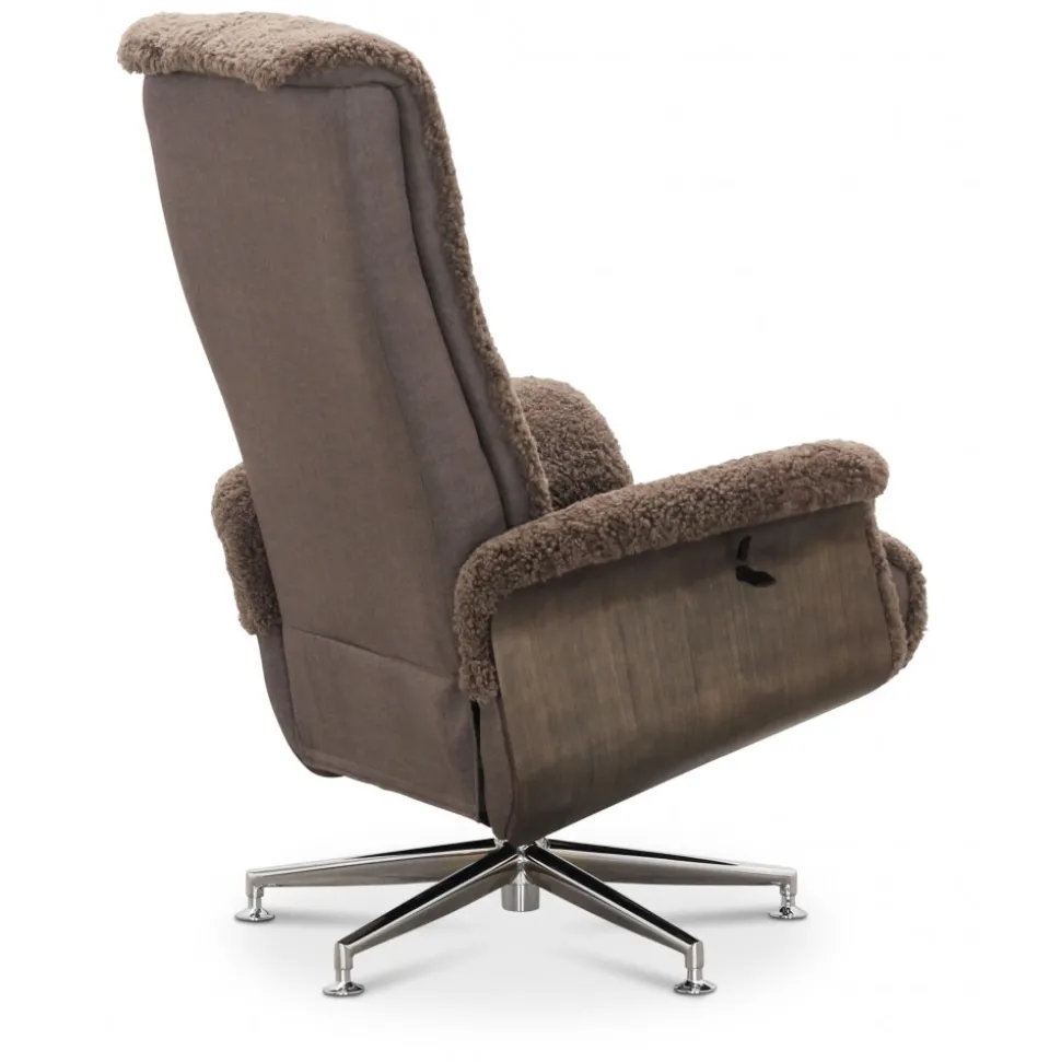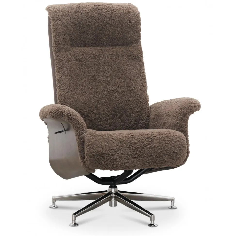 Reclinerfåtölj klädd i äkta brunt fårskinn och har vackert oljad ek på armstöden vilket gör den till en med klassisk känsla. Det kromade metallstativet ger en modern kontrast och förstärker den klassiska designen.