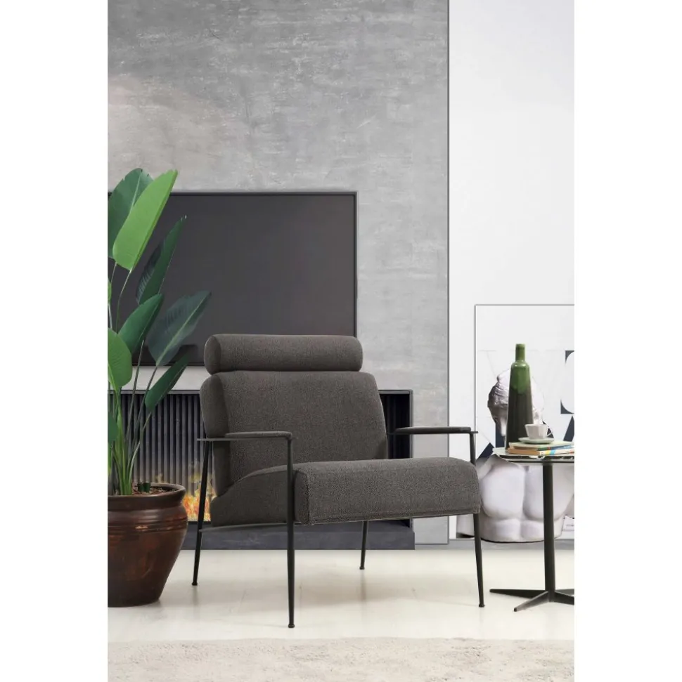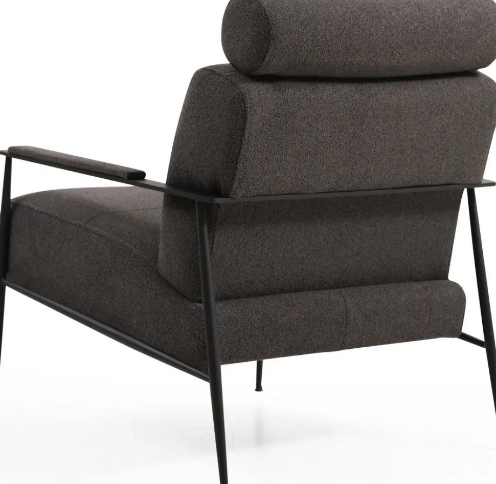 Fåtölj i modern design med svartlackat metallunderrede. Sitt och ryggdynor i antracitfärgat tyg. Klädsel av polyester och ben av metall. Fasta sitt- och ryggdynor.