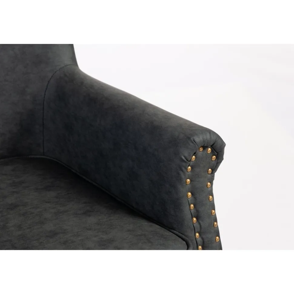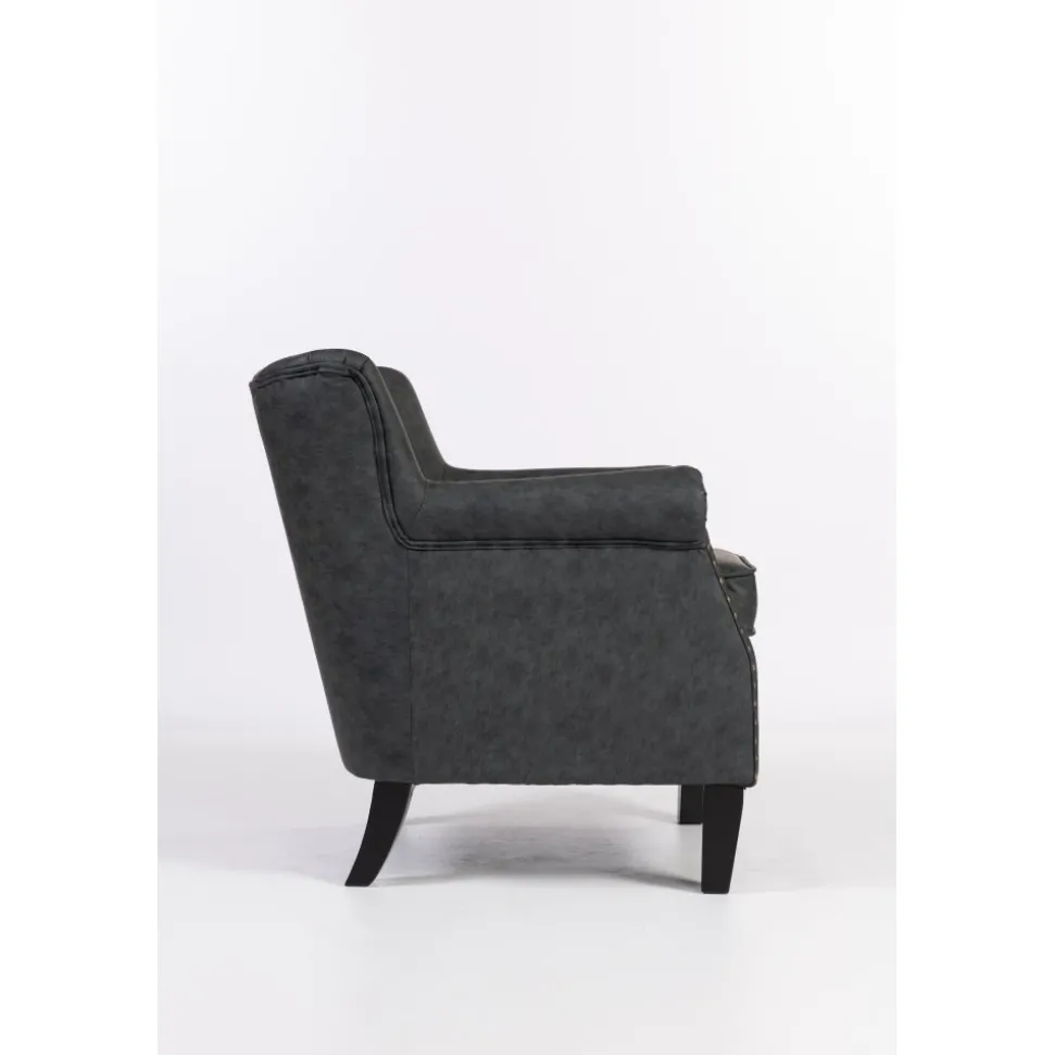 Elegant professorfåtölj klädd i antracit konstläder (PU) med dekorativa nitar på framsidan. Fåtöljen står stadigt på svarta ben och levereras färdigmonterad redo att användas direkt.