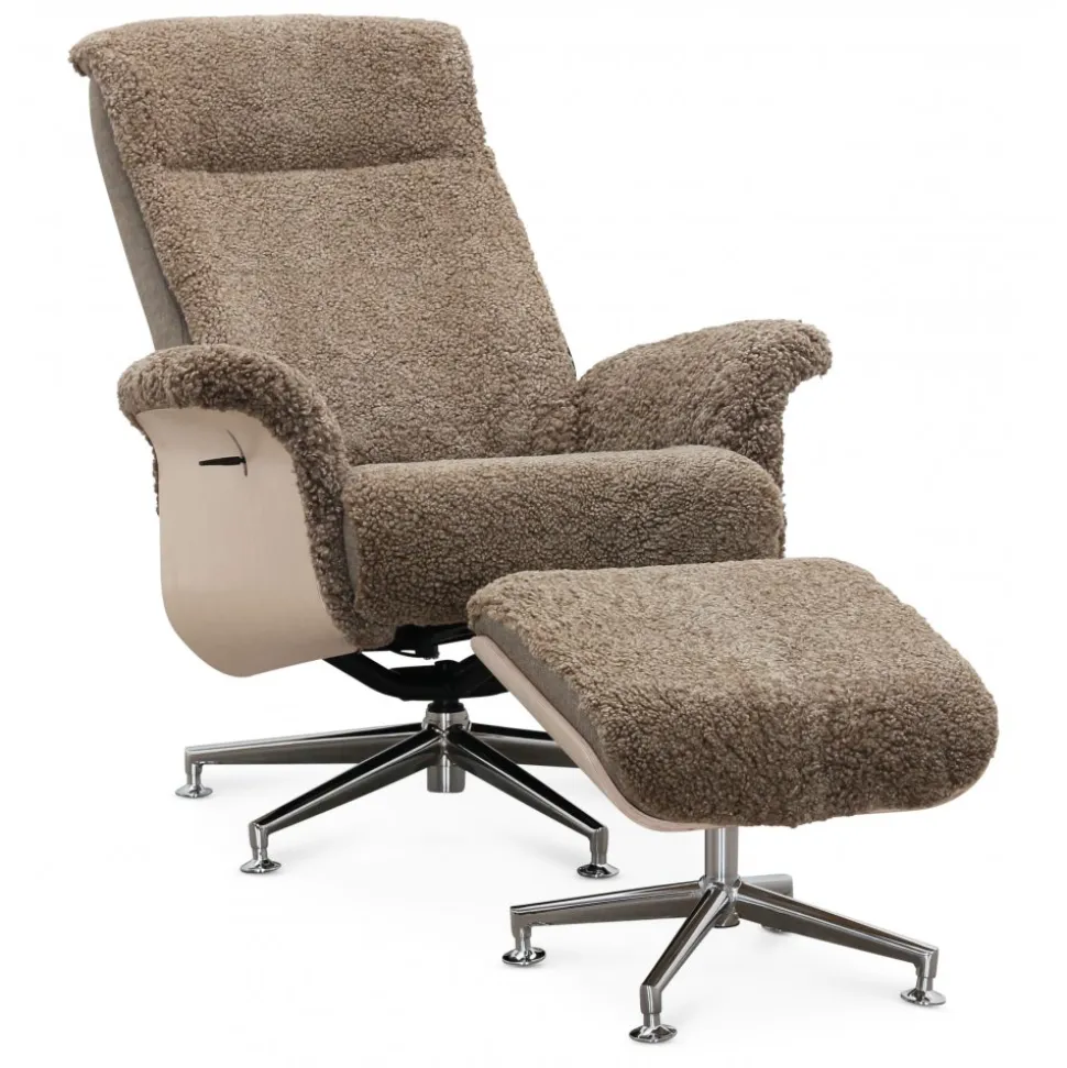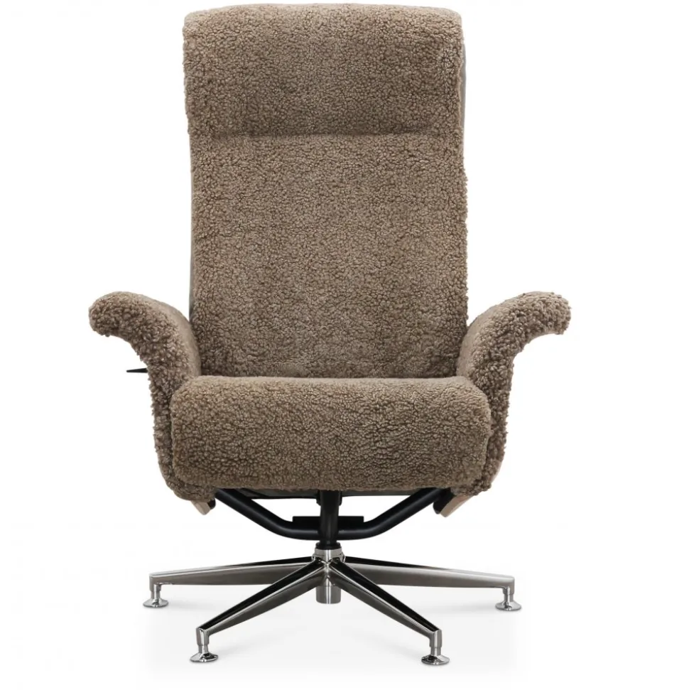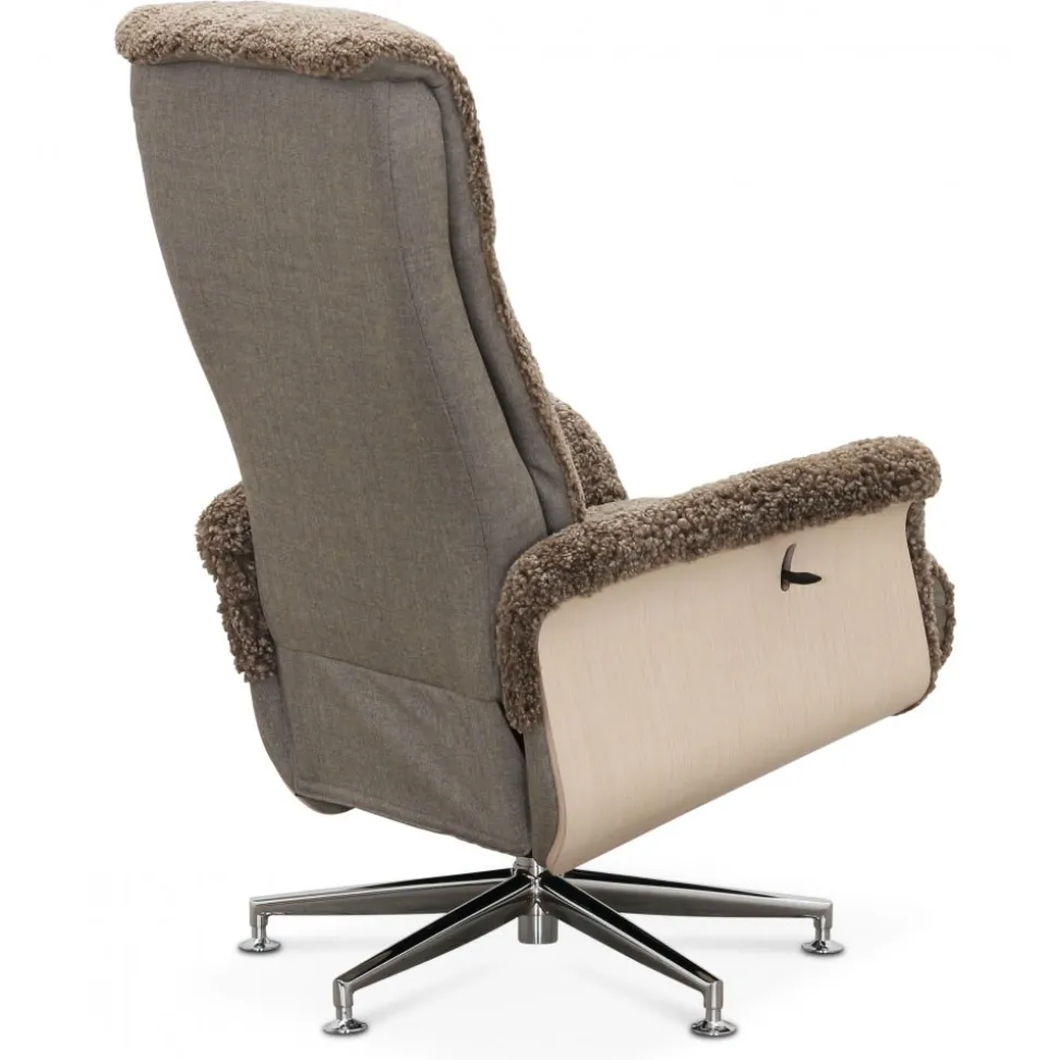 Reclinerfåtölj klädd i äkta mörkbeige fårskinn med vackert oljad ek på armstöden vilket gör den till en med klassisk känsla. Det kromade metallstativet ger en modern kontrast och förstärker den klassiska designen.