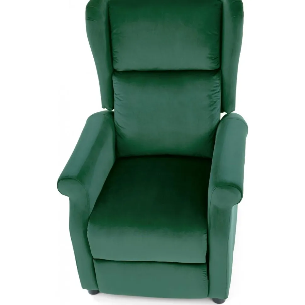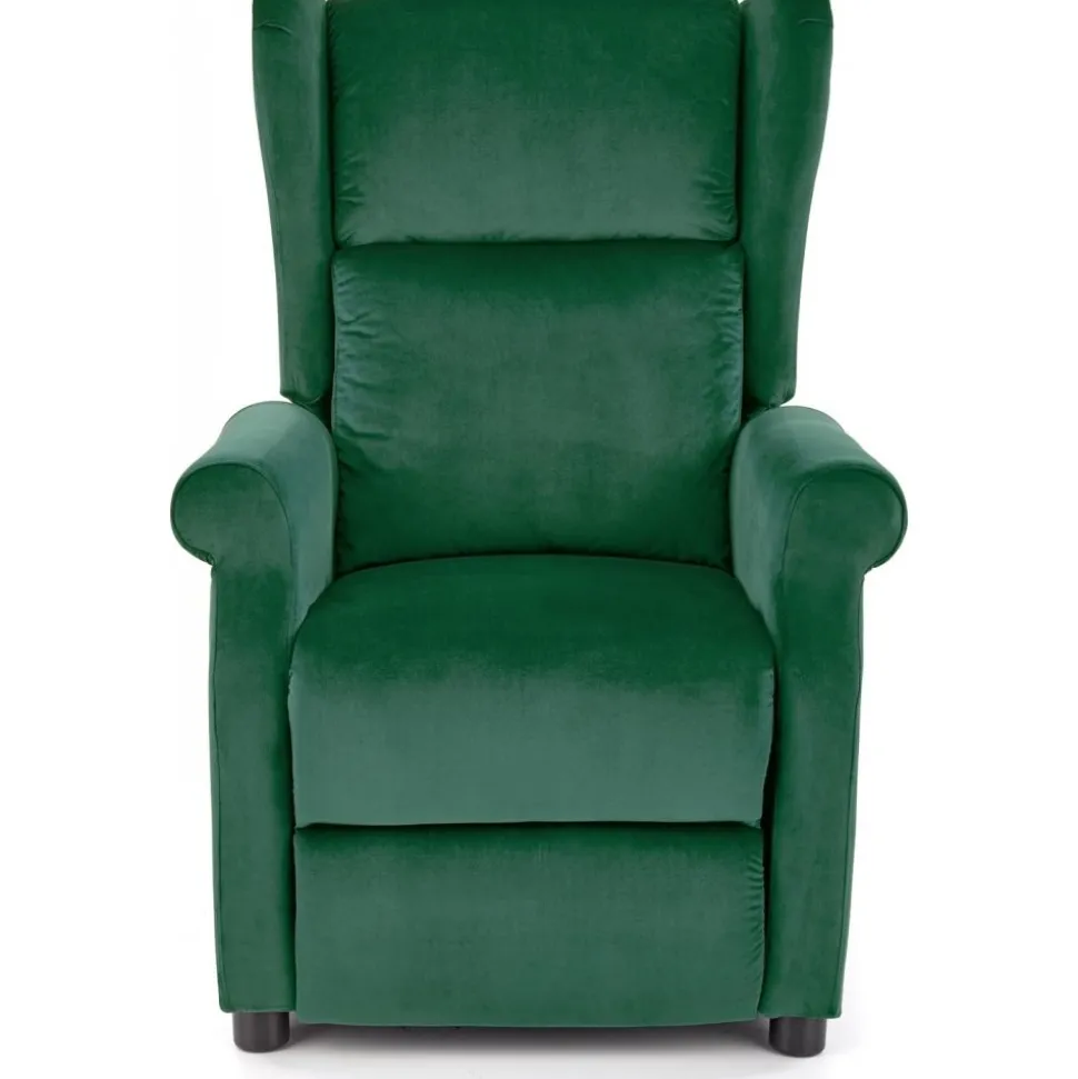 Reclinerfåtölj i ett mjukt grönt tyg med fällbar funktion.