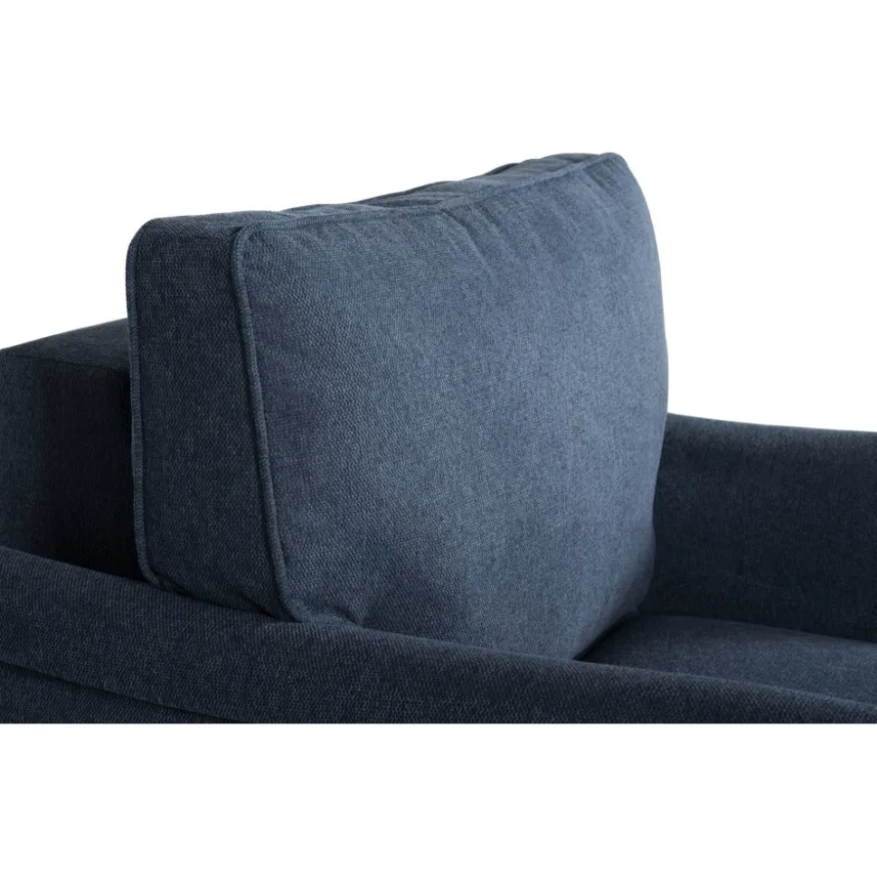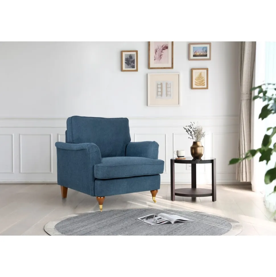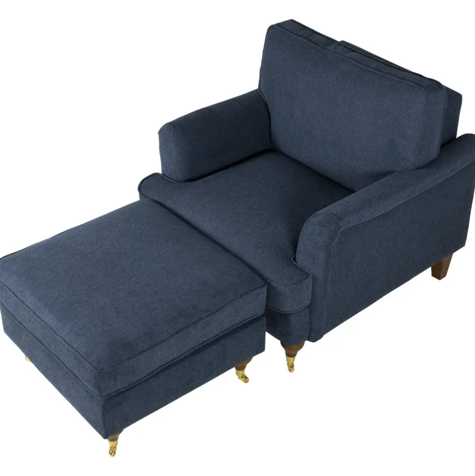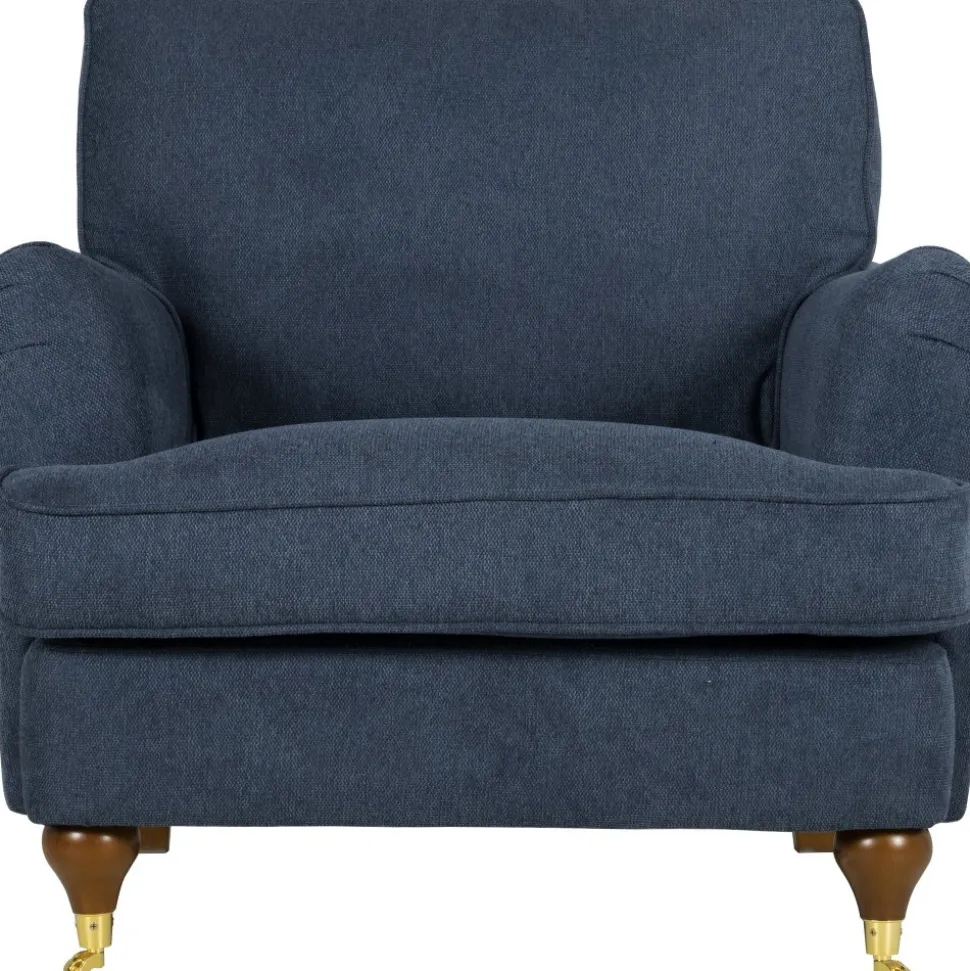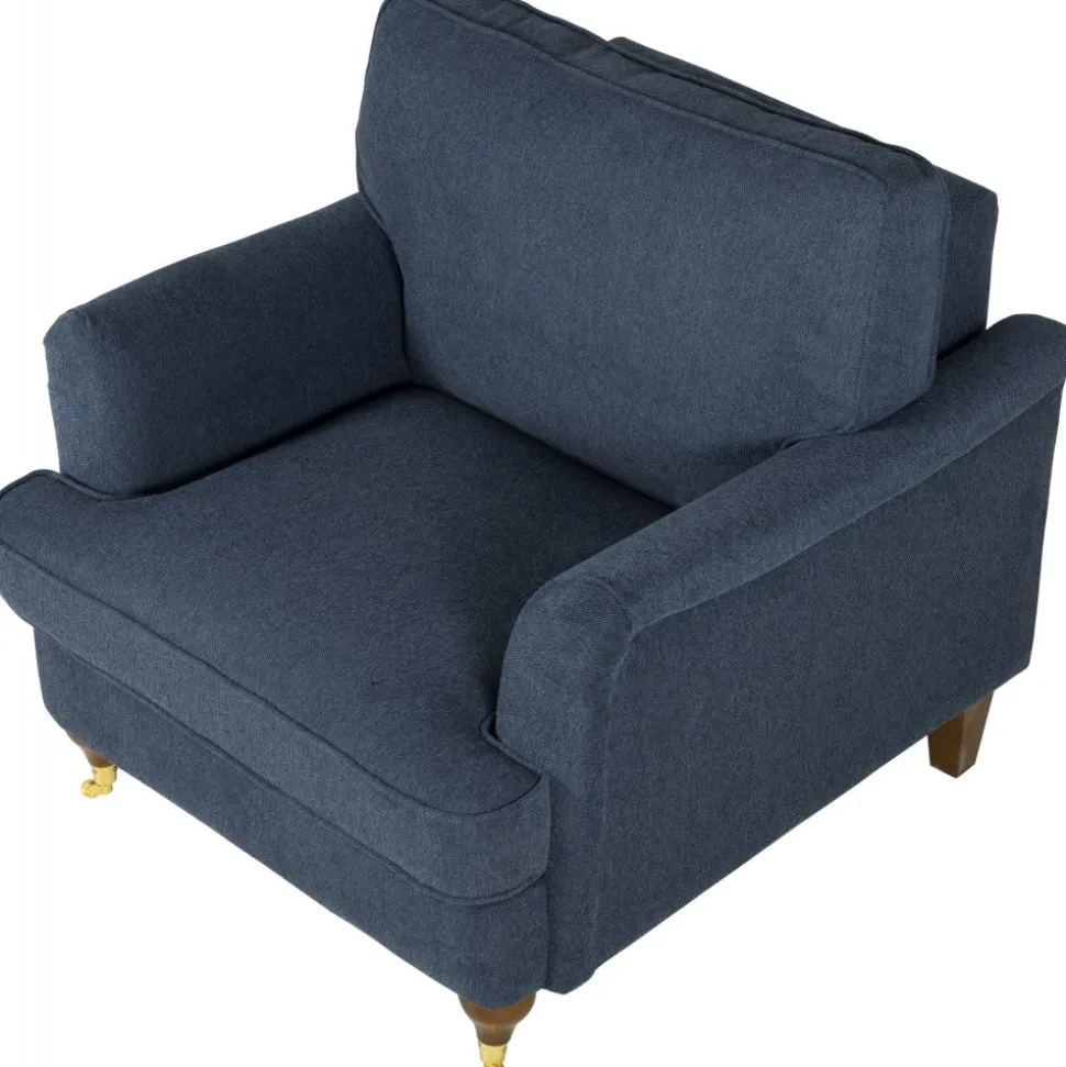 Fåtöljen finns i en mörkblå och stilren klädsel som passar i alla hem.