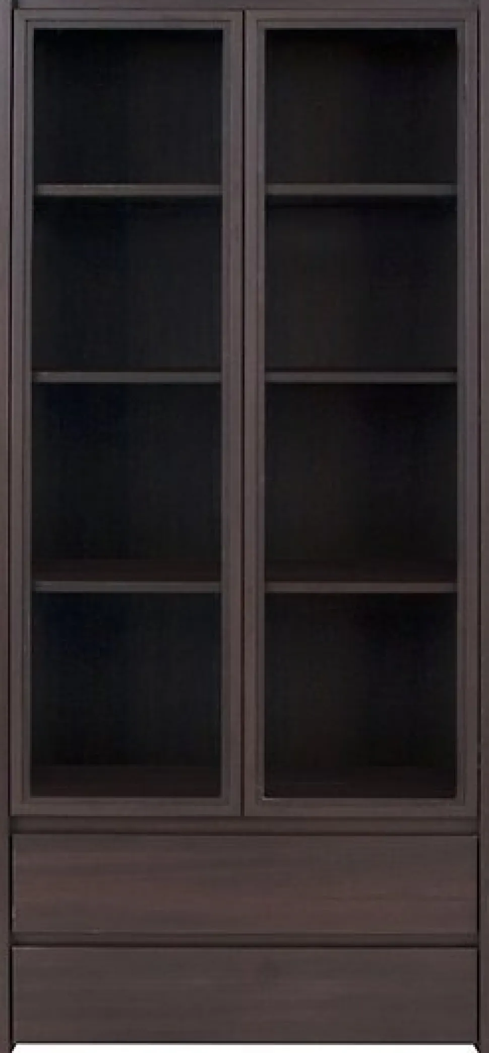 Ett fint i mörk ek med två glasdörrar. Skåpet har två lådor undertill med integrerade handtag för förvaring av mindre föremål.