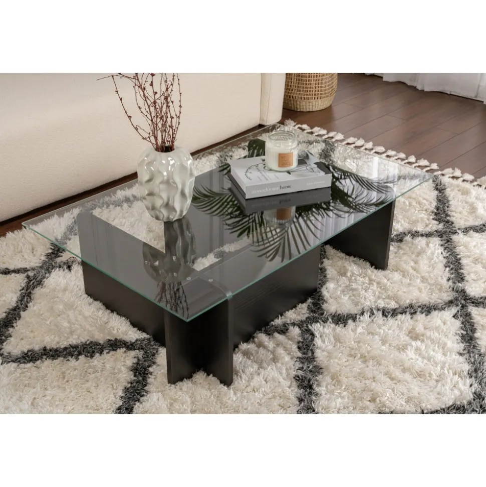 Vi presenterar vårt fantastiska svarta soffbord, en möbel som kommer att lyfta stilen i alla med sin eleganta och moderna design. Detta är tillverkat av härdat glas och utstrålar sofistikering och elegans, vilket gör det till den perfekta mittpunkten i ditt hem.