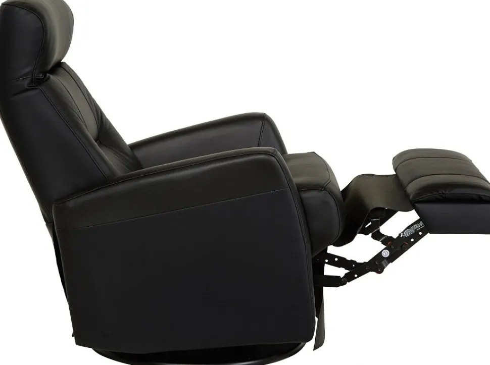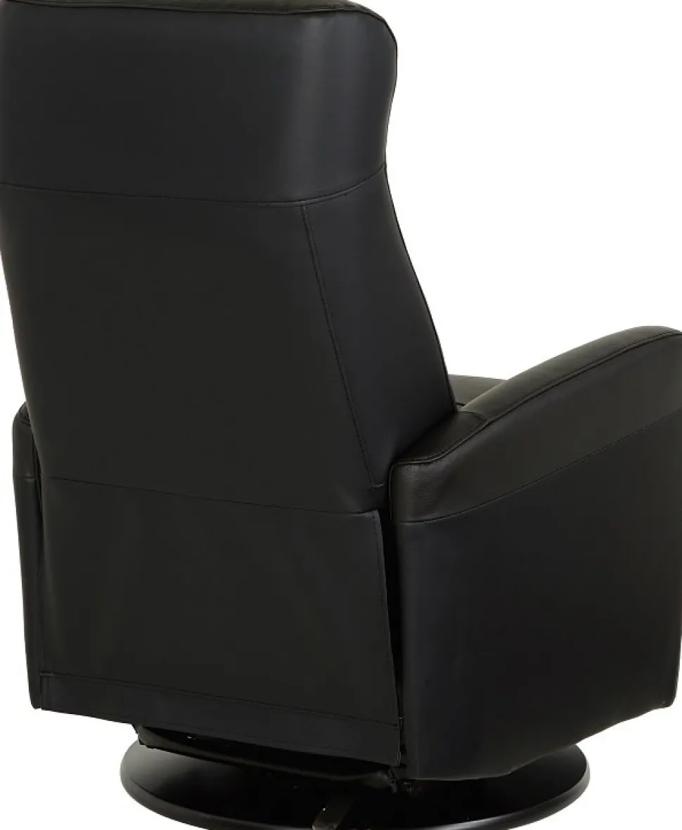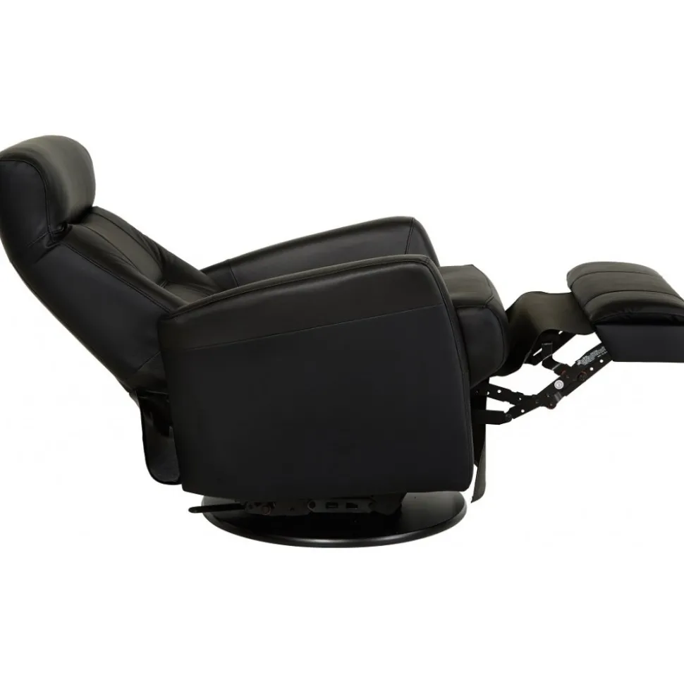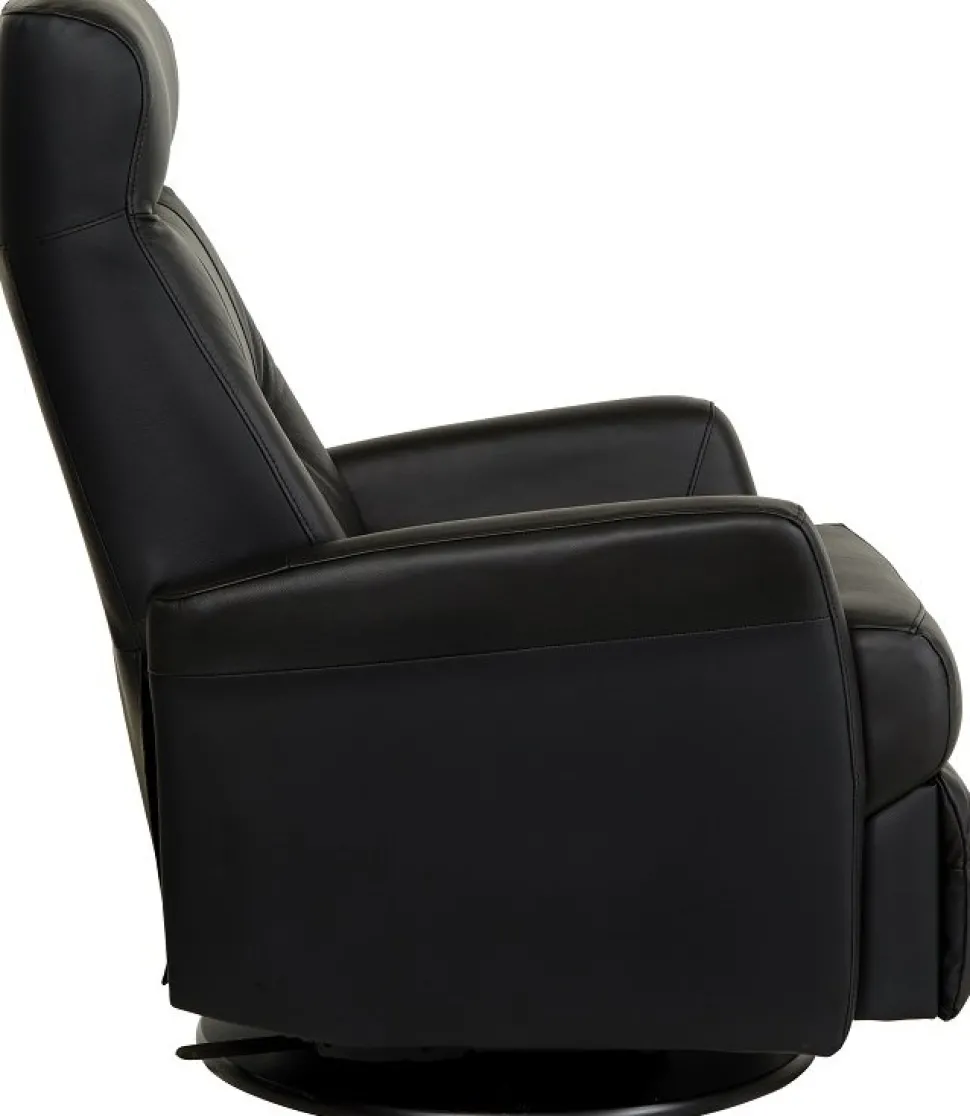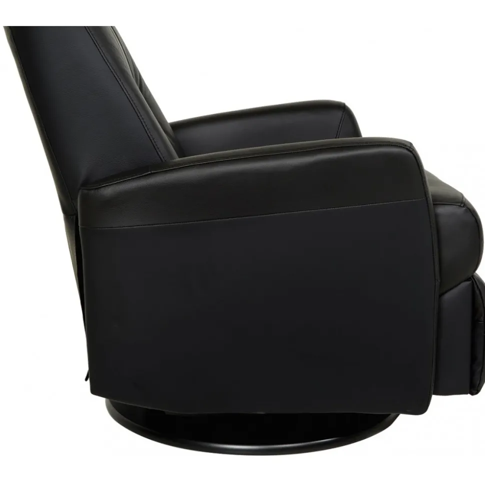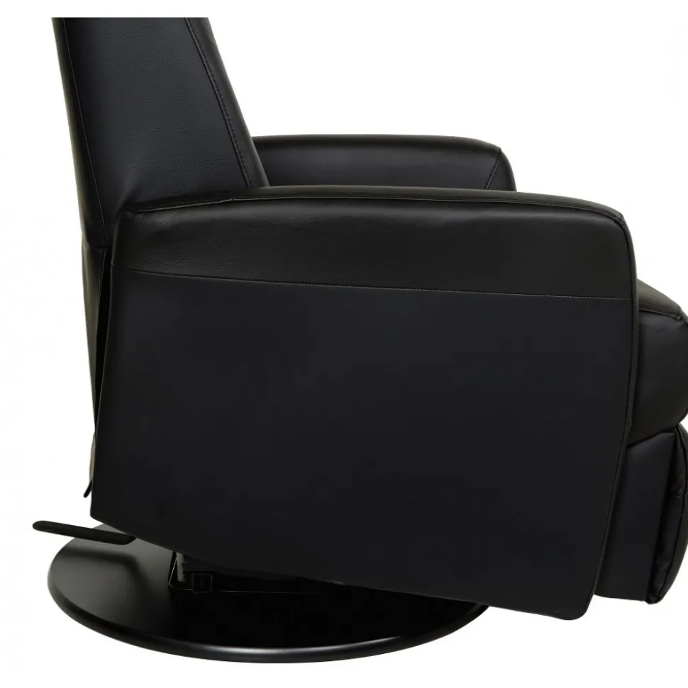 Frans är en mycket påkostad och exklusiv i ett slitstarkt svart äkta läder med PVC på sidorna. Gung och snurrfunktion. Fällbar i både rygg och den inbyggda fotdelen. Tiltfunktion och resfunktion framåt gör det lättare att resa sig från fåtöljen.