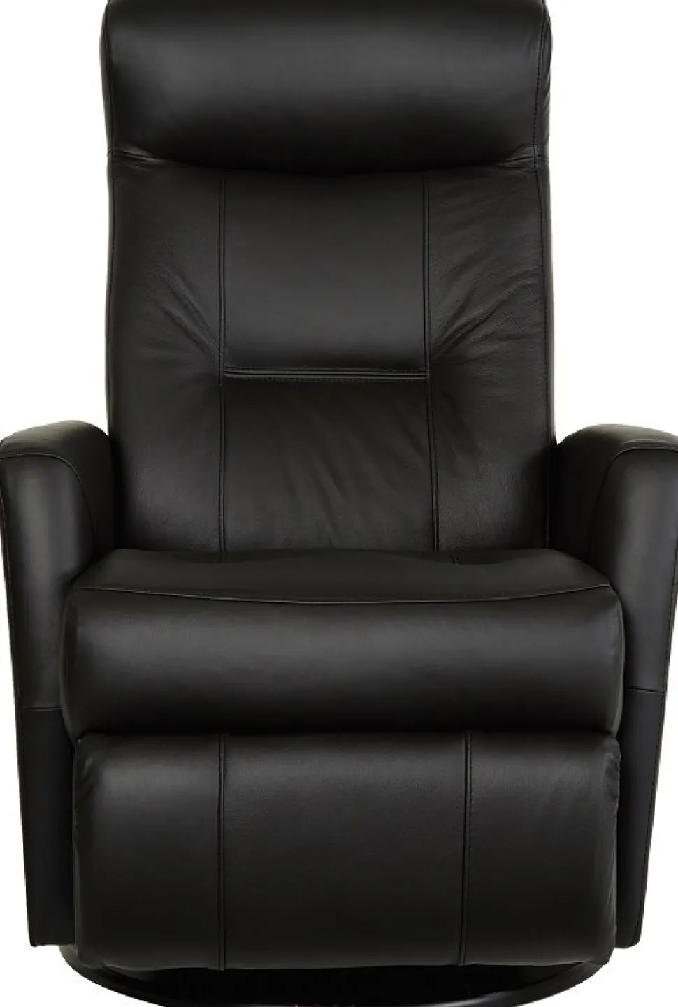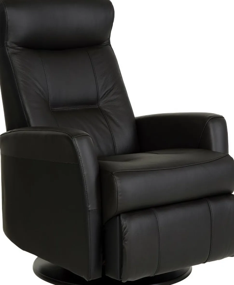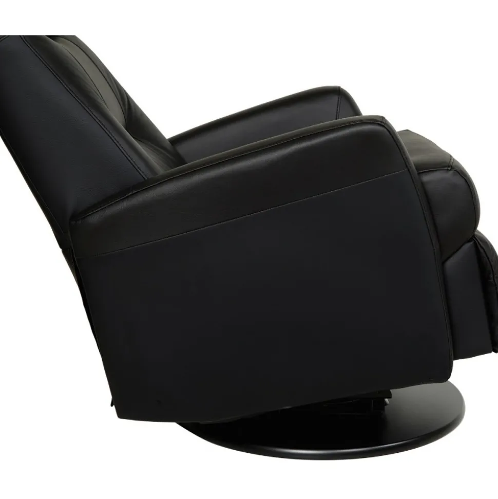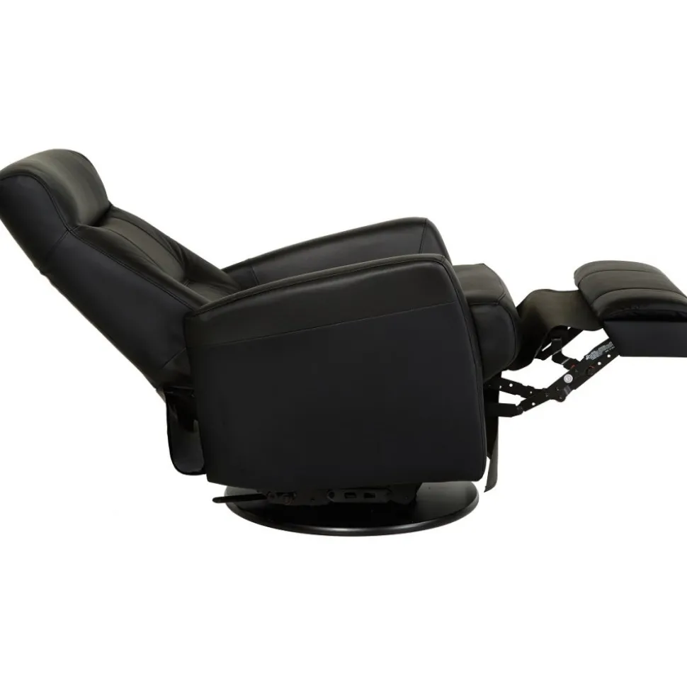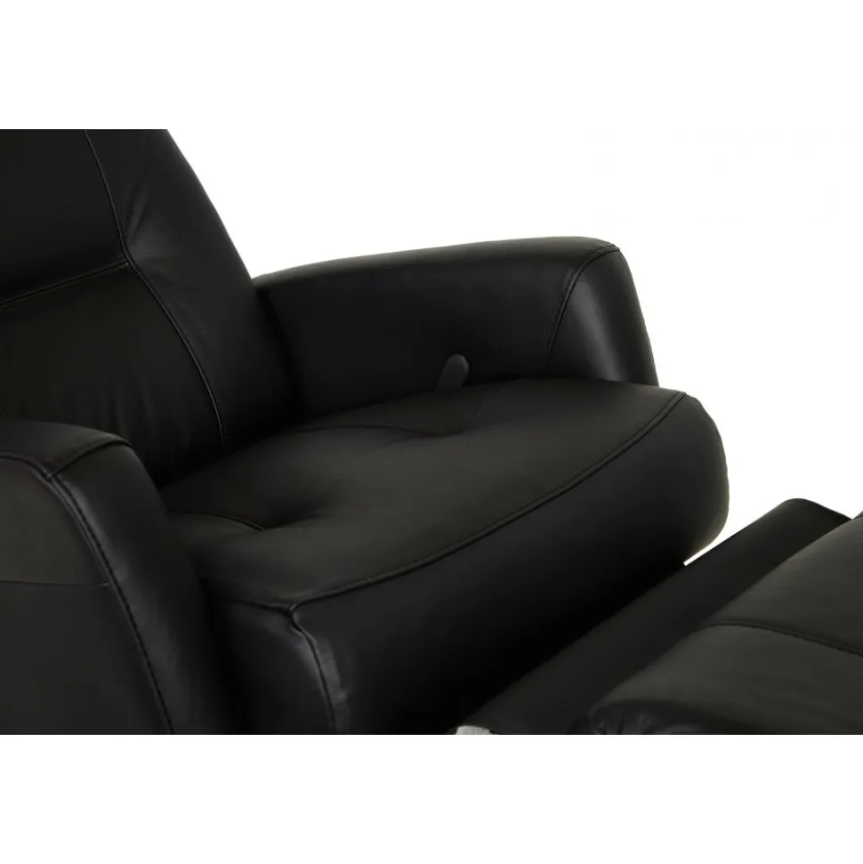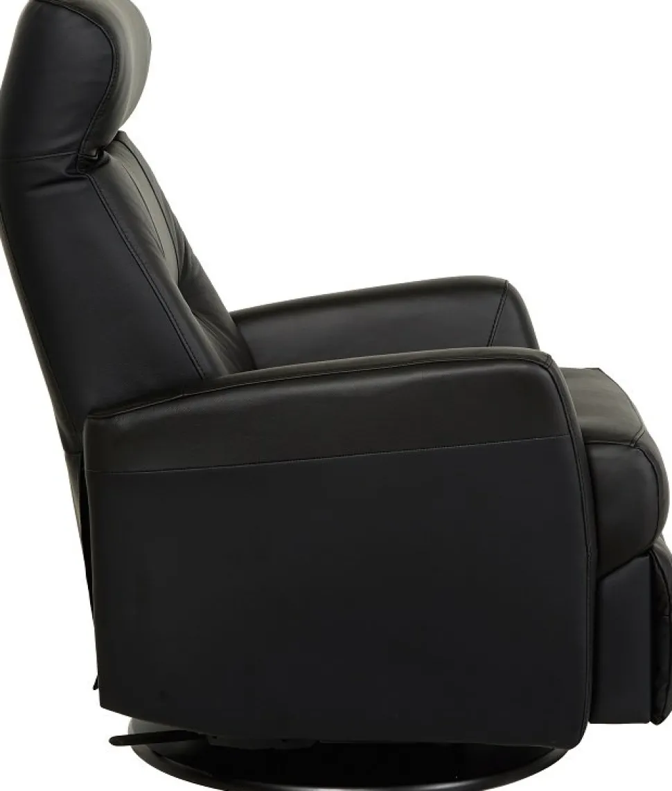 Frans är en mycket påkostad och exklusiv i ett slitstarkt svart äkta läder med PVC på sidorna. Gung och snurrfunktion. Fällbar i både rygg och den inbyggda fotdelen. Tiltfunktion och resfunktion framåt gör det lättare att resa sig från fåtöljen.