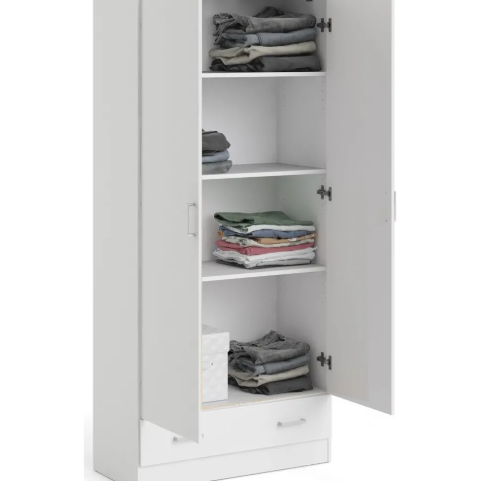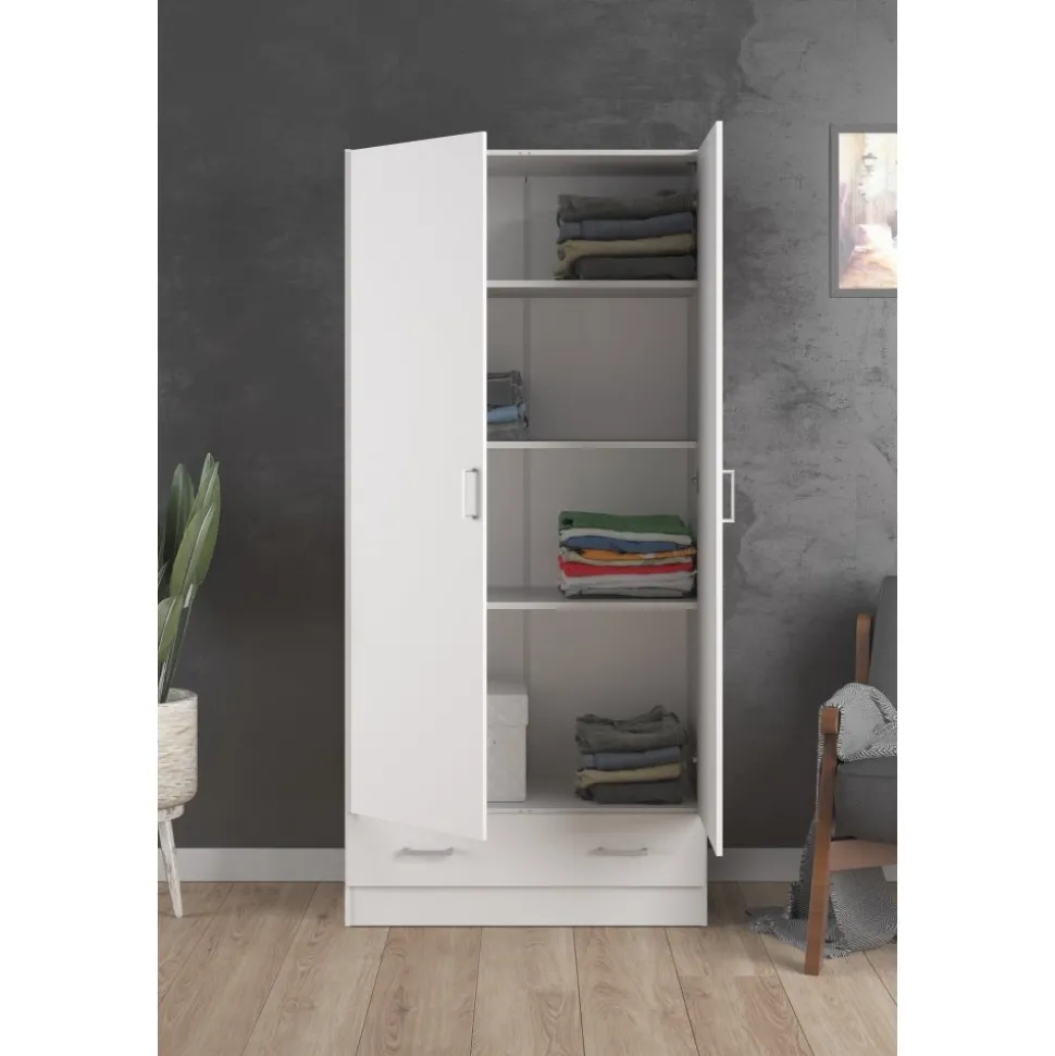 Garderob av trä med vit melamin.