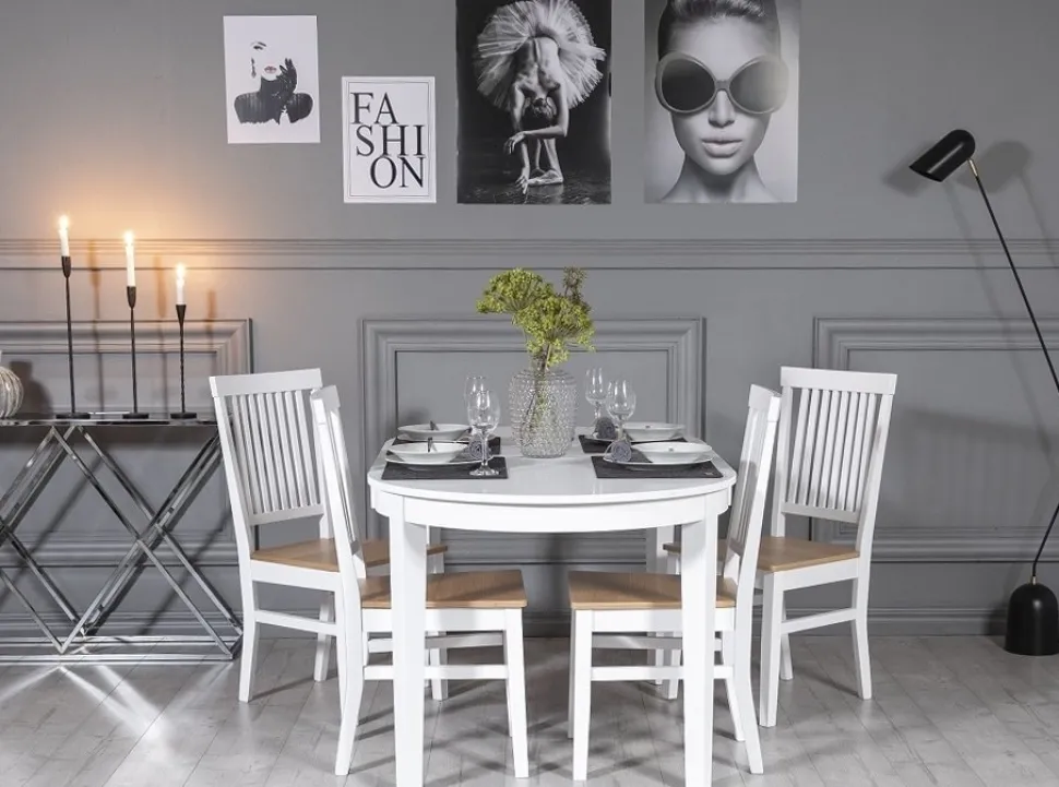 Klassiskt matgrupp, bord med underrede och toppskiva av massivt vitlackat trä. Modern stol i massivt heveaträ, vitlackad med sits av ekfanèr.