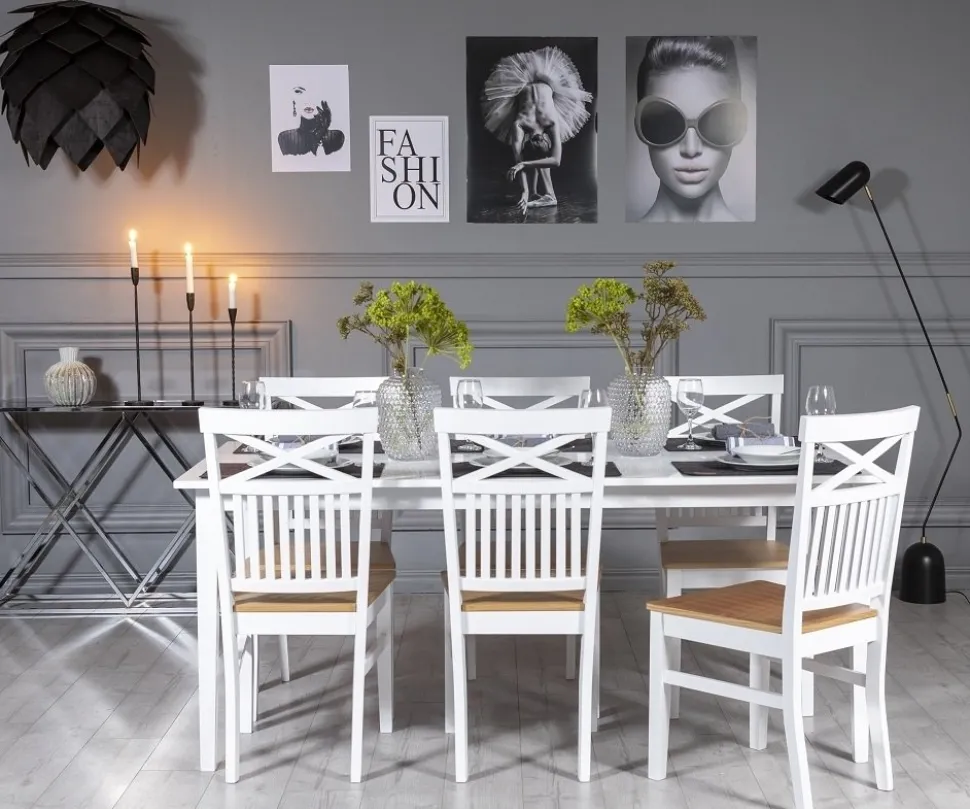 Klassiskt matgrupp, bord med underrede och toppskiva av massivt vitlackat trä. Modern stol i massivt heveaträ, sits i fanerad ek.