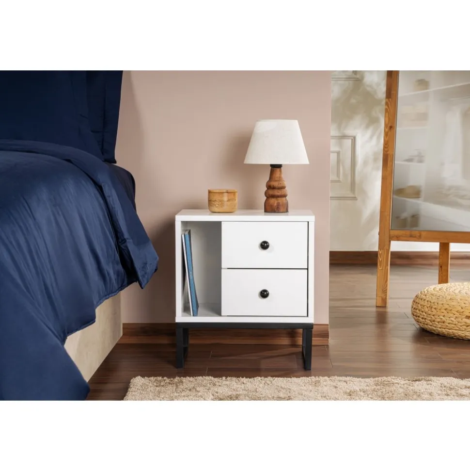 Sängbord av melaminbelagd spånskiva.