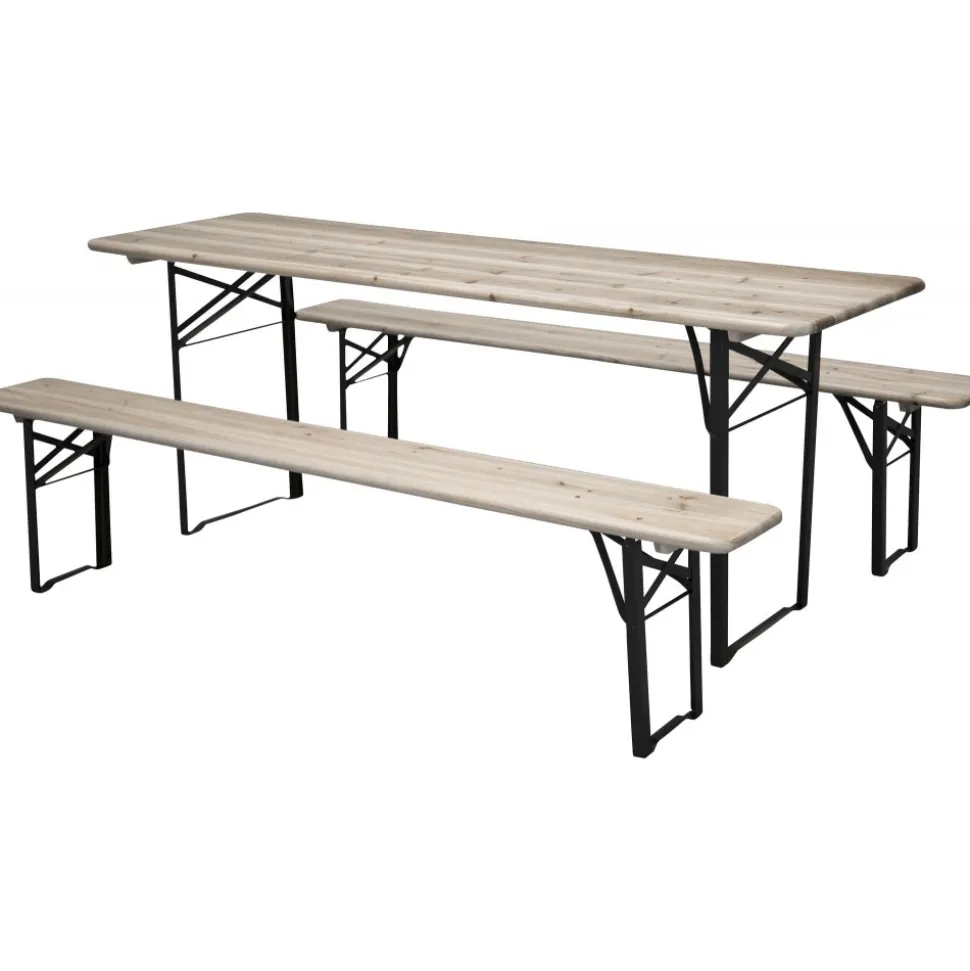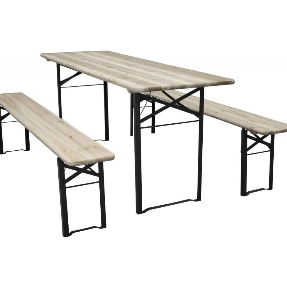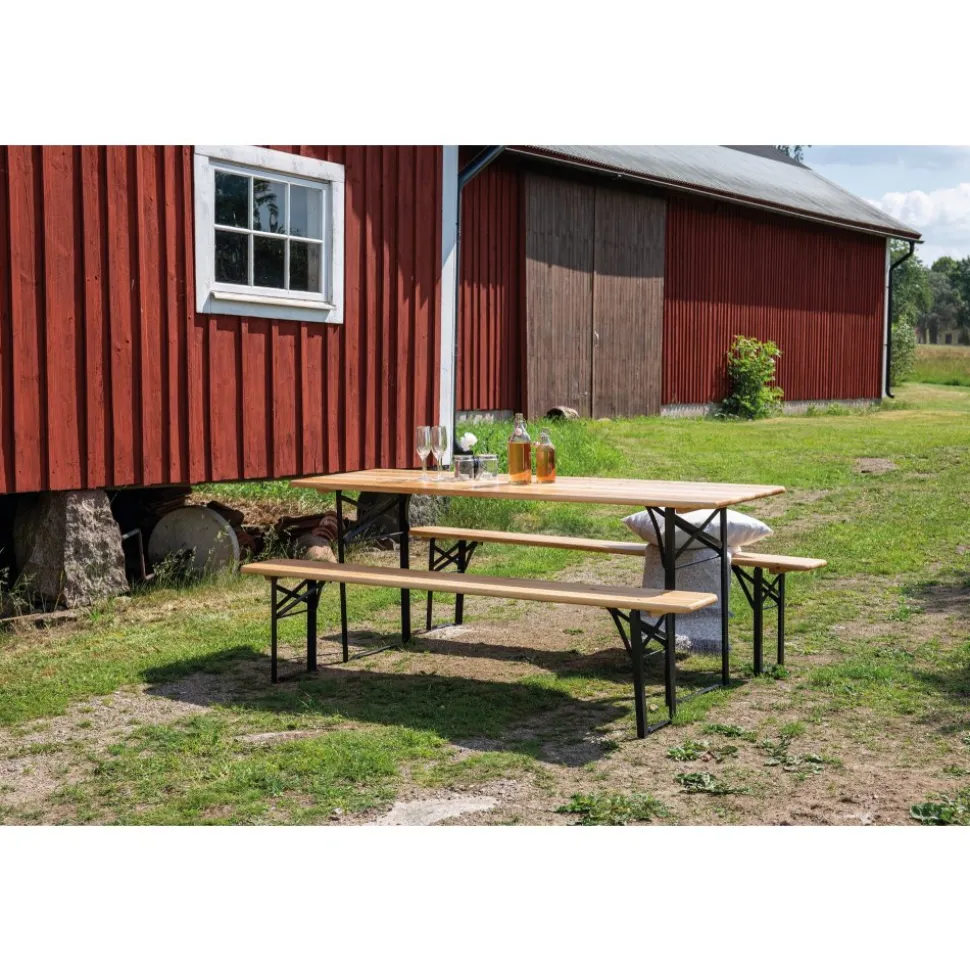 Möblera din trädgård inbjudande, charmigt och praktiskt med denna matgrupp. Hela matgruppen är fällbar och inkluderar ett bord samt två bänkar, genomgående tillverkat av ädelgran och svart stål. Perfekt för alla fikastunder i sommar och de praktiska funktionerna gör det enkelt att förflytta. Gör er redo för massa mysiga häng i trädgården.