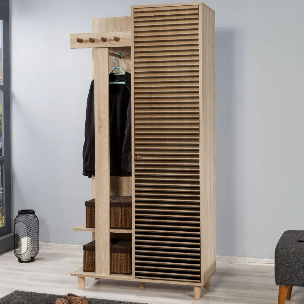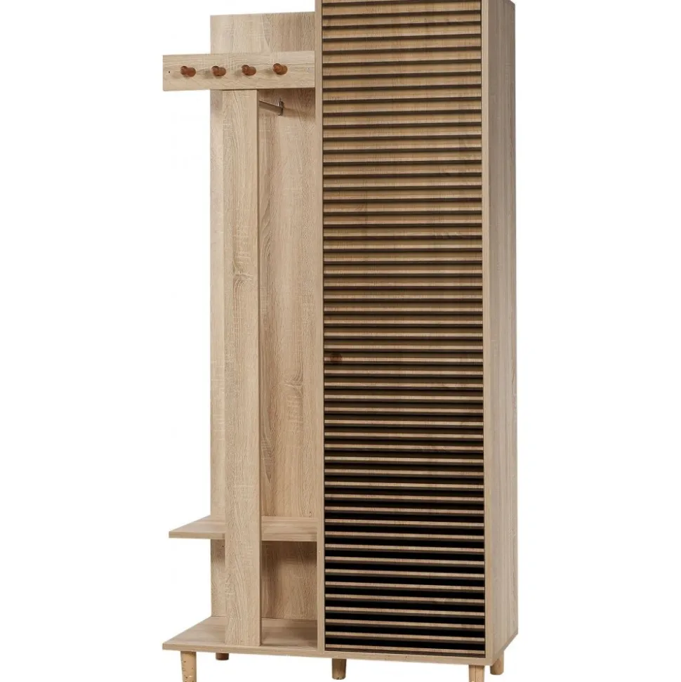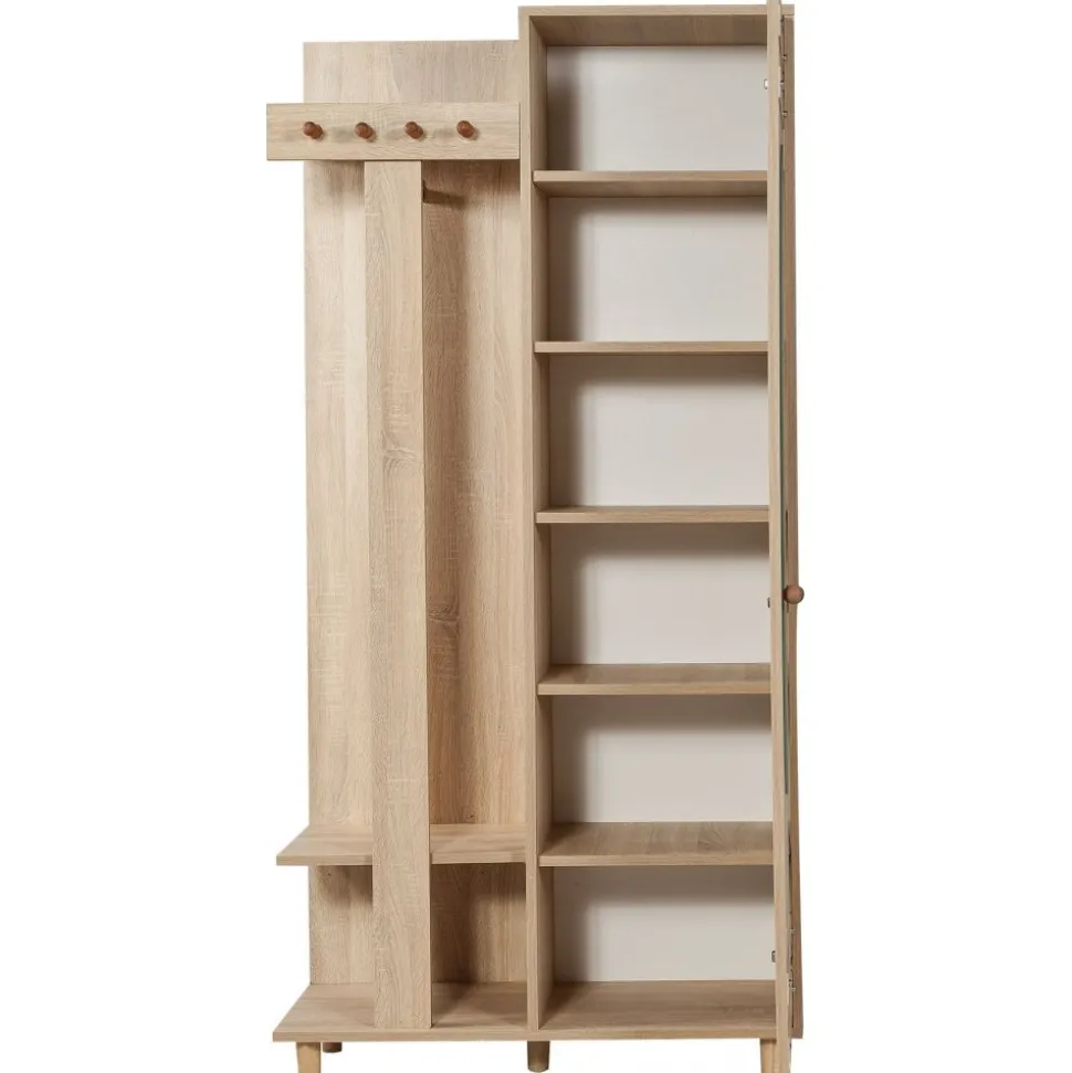 Praktisk och stilren som gör det enkelt att organisera både ytterkläder och skor. Den ena delen består av en klassisk garderob med flera hyllplan, perfekt för förvaring av skor, väskor eller andra saker du vill ha nära till hands i hallen. Den andra delen är en kombinerad sko- och hatthylla med krokar för jackor och kappor samt öppna hyllor för skor, mössor och accessoarer. Möbeln är tillverkad av melaminbelagd spånskiva i sonoma ek och står stadigt på ben av massiv avenbok. Med sin smarta design och varma träton skapar den ordning och en välkomnande känsla i hemmet.