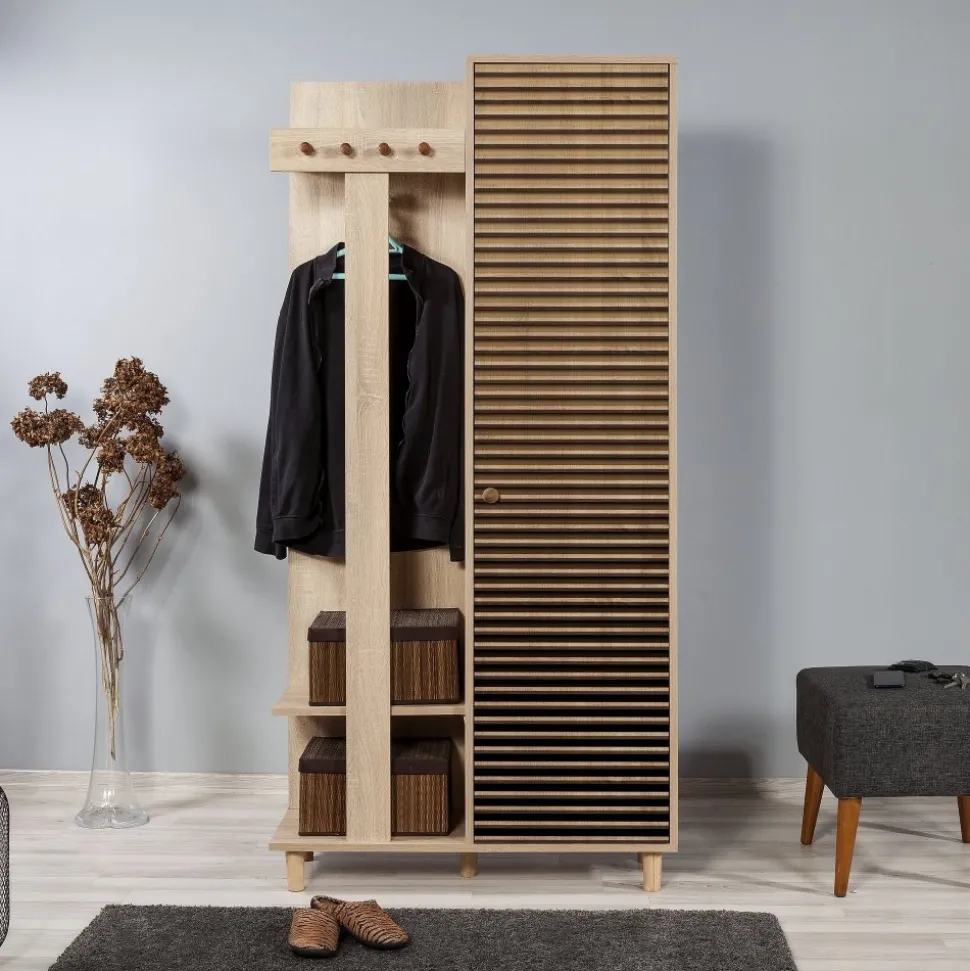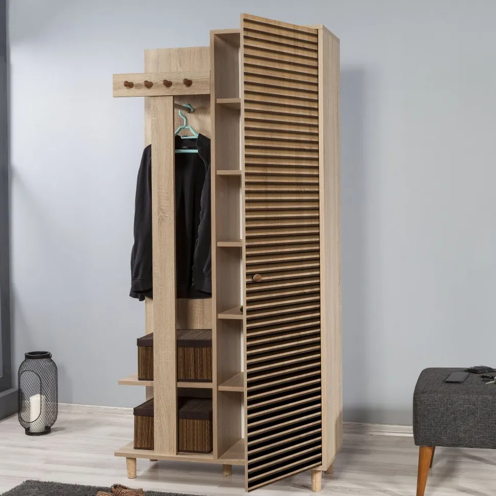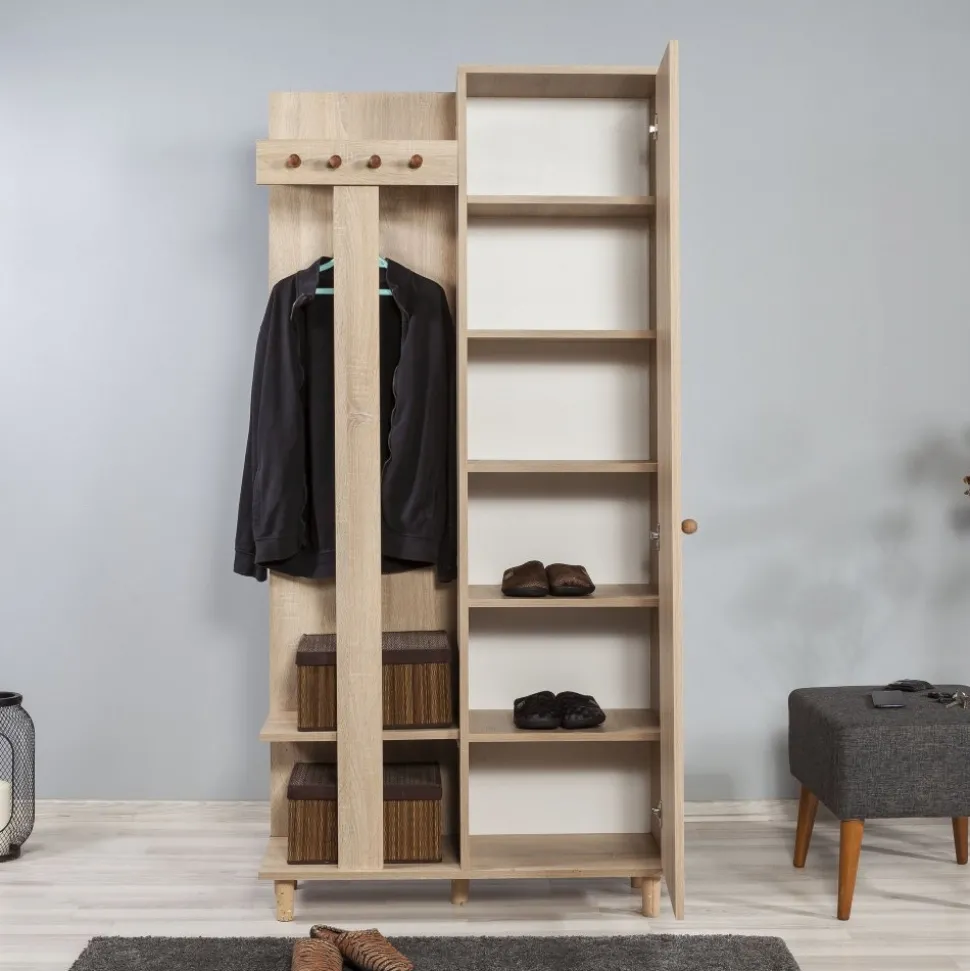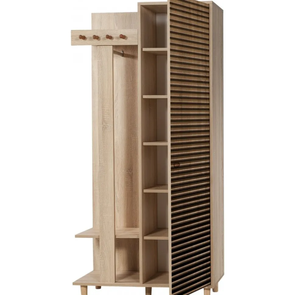 Praktisk och stilren som gör det enkelt att organisera både ytterkläder och skor. Den ena delen består av en klassisk garderob med flera hyllplan, perfekt för förvaring av skor, väskor eller andra saker du vill ha nära till hands i hallen. Den andra delen är en kombinerad sko- och hatthylla med krokar för jackor och kappor samt öppna hyllor för skor, mössor och accessoarer. Möbeln är tillverkad av melaminbelagd spånskiva i sonoma ek och står stadigt på ben av massiv avenbok. Med sin smarta design och varma träton skapar den ordning och en välkomnande känsla i hemmet.